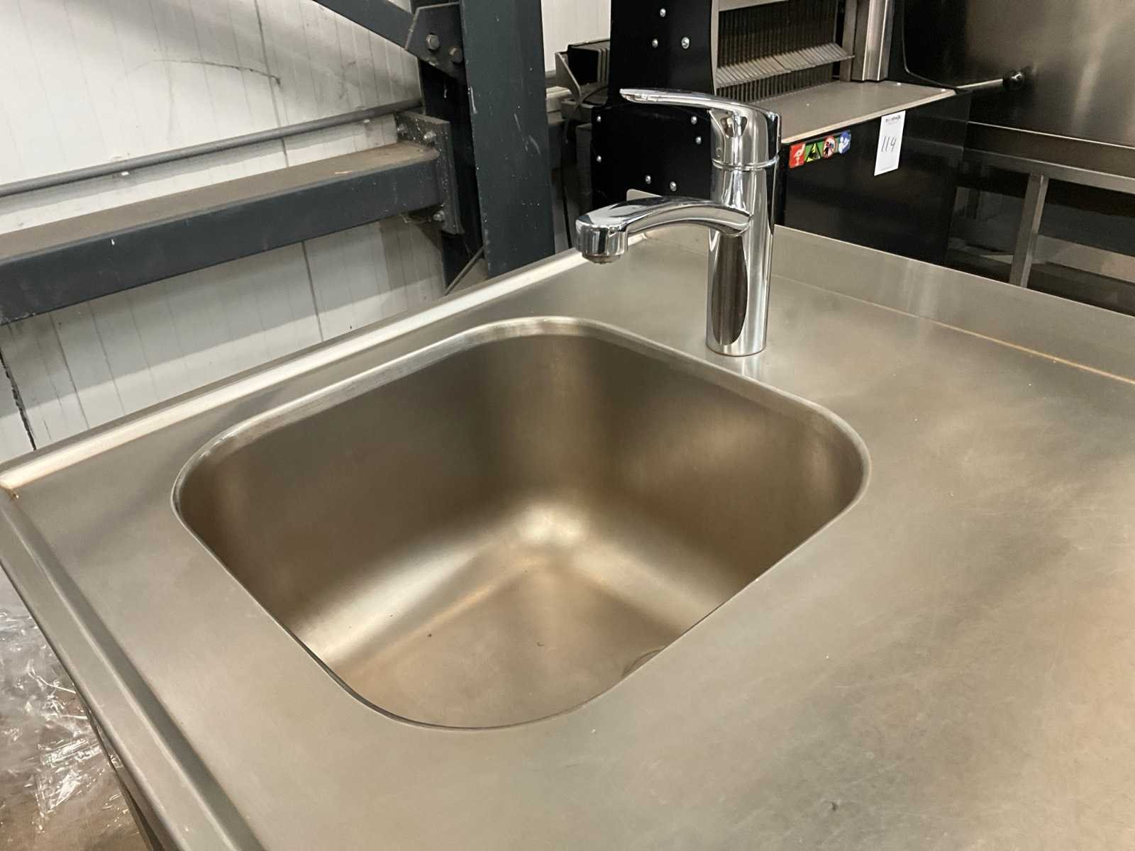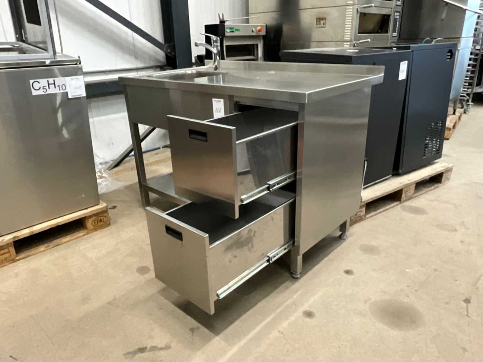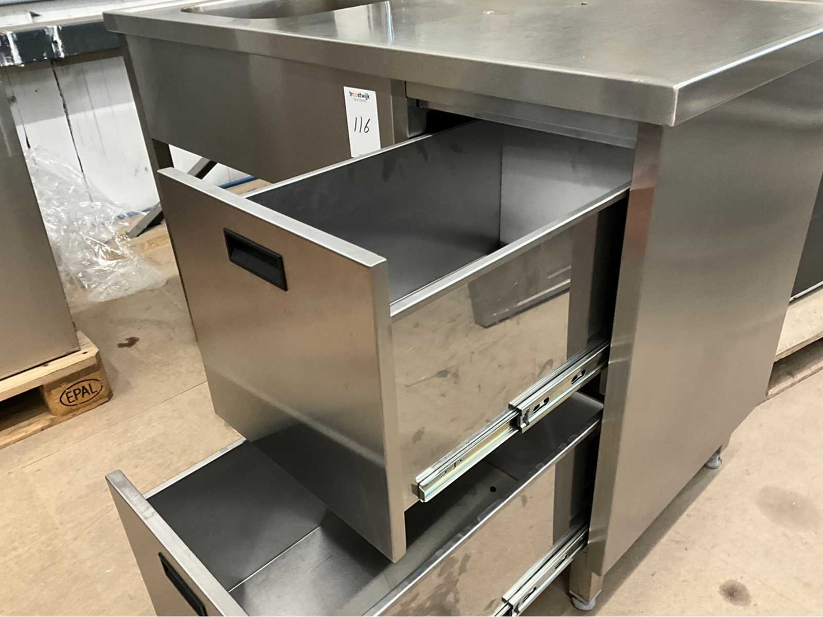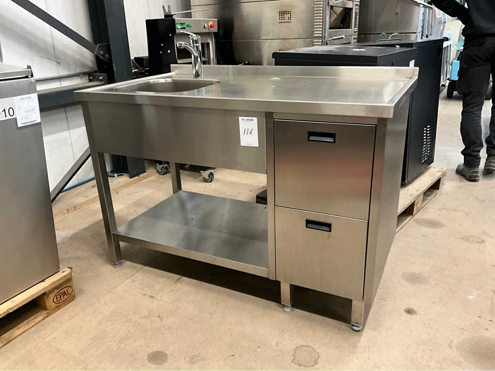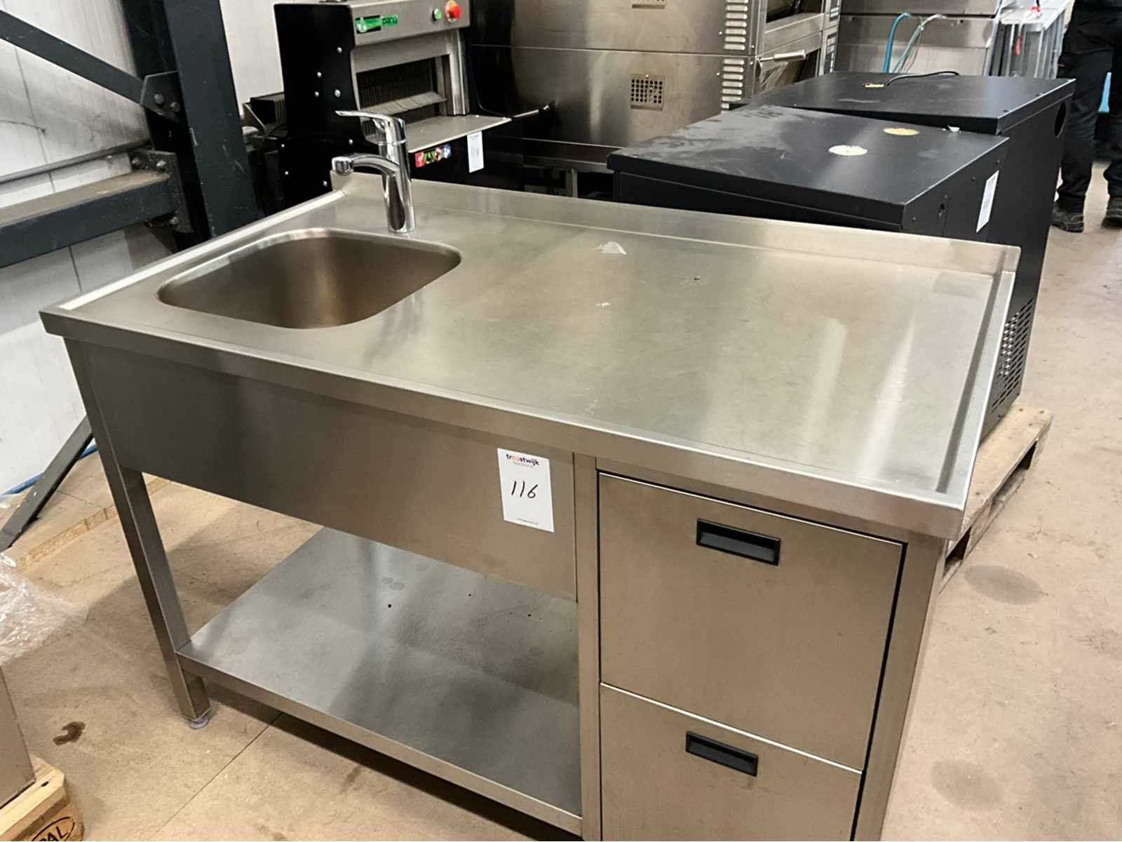 Roestvast staal; 1 greep mengkraan; 2x lade; onder legbord; opstaande achterwand; Aantal spoelbakken: 1pcs Afmeting spoelbak: 40cm Lengte: 130cm Breedte: 70cm Hoogte: 89cm