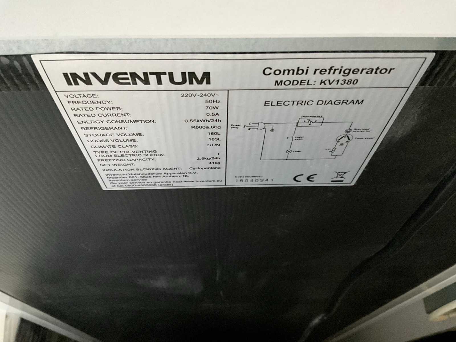 45L vriesvak, 3 planken koelkast, 3x bak vrieskast, Merk: Inventum Type: KV1380 Aansluiting: 230V Capaciteit.: 160l Totale afmeting L: 54cm Totale afmeting Breedte: 50cm Totale afmeting Hoogte: 138cm