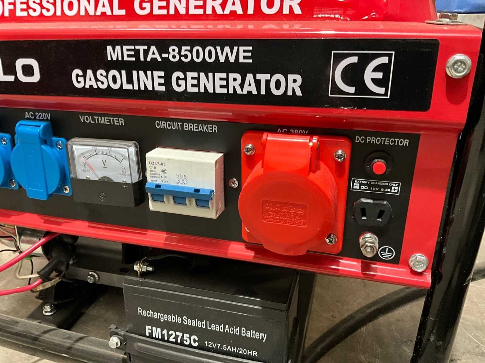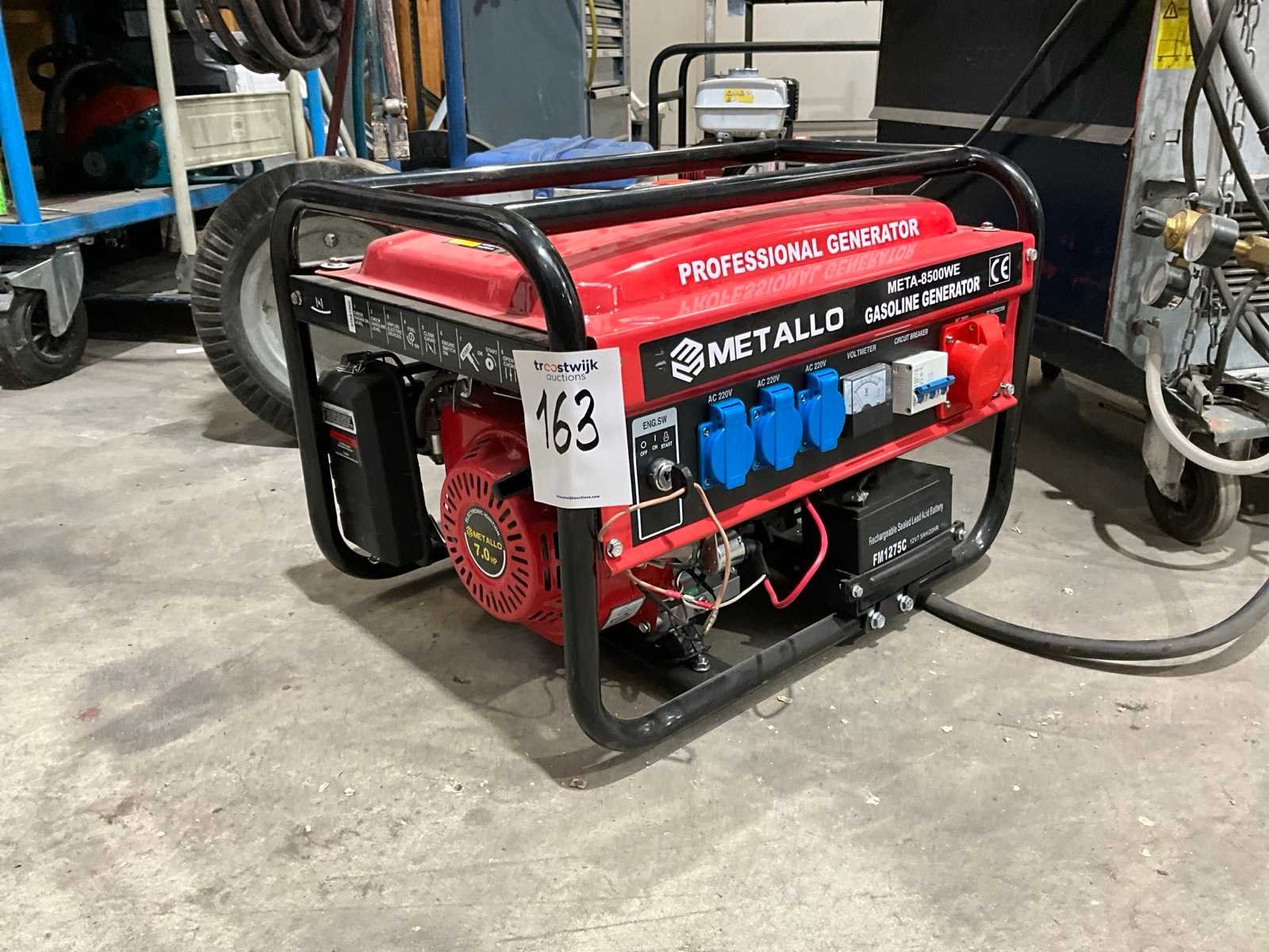 Gemonteerd in draagbeugel; benzine motor; 2x 230 Volt uit; 1x 400 Volt uit; 1x 12 Volt DC; Merk: Metallo Type: Meta 8500 WE
