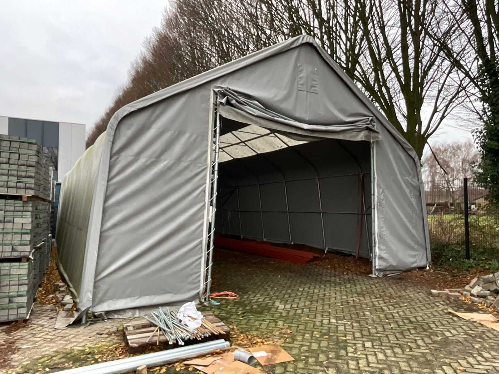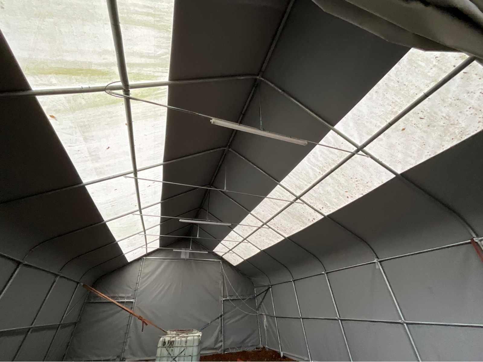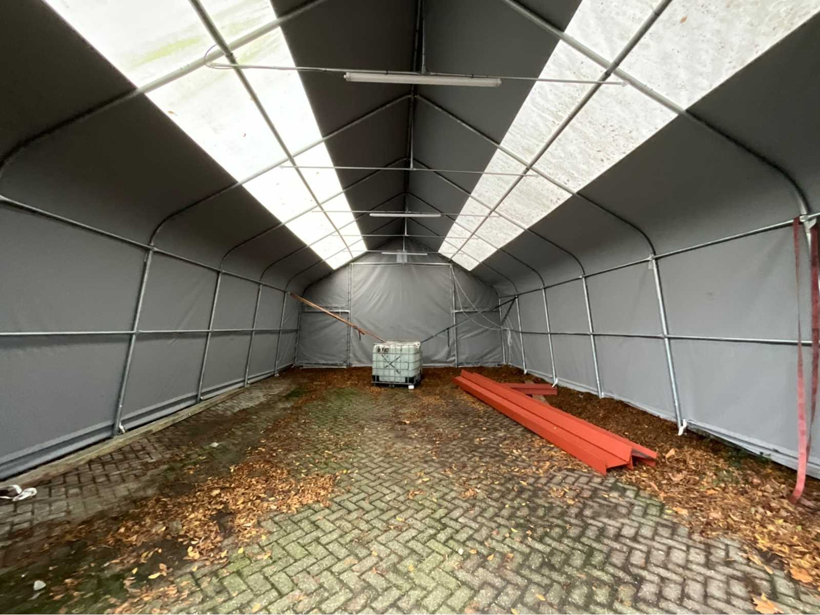 Voorzien van 3x TL plafondlamp; bestaande uit 7x buisstaal boog frame; geschroefd; tussenstukken; 4x schoor; zeil voorzien van 2x lichtstraat; beide kopse zijde voorzien van toegangsluik afmeting circa 4500x3600 mm; totaal afmeting 12000x8500x4300 mm;