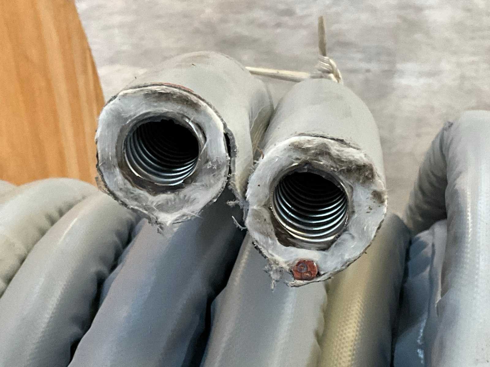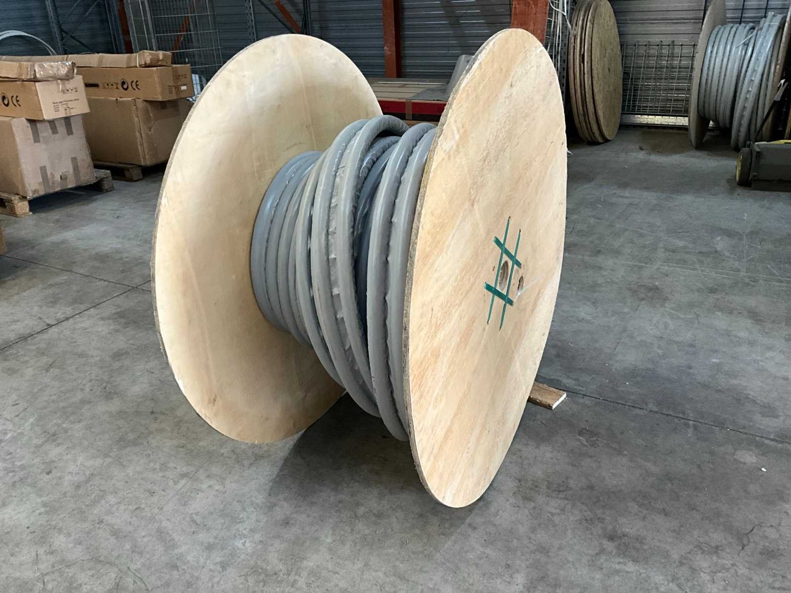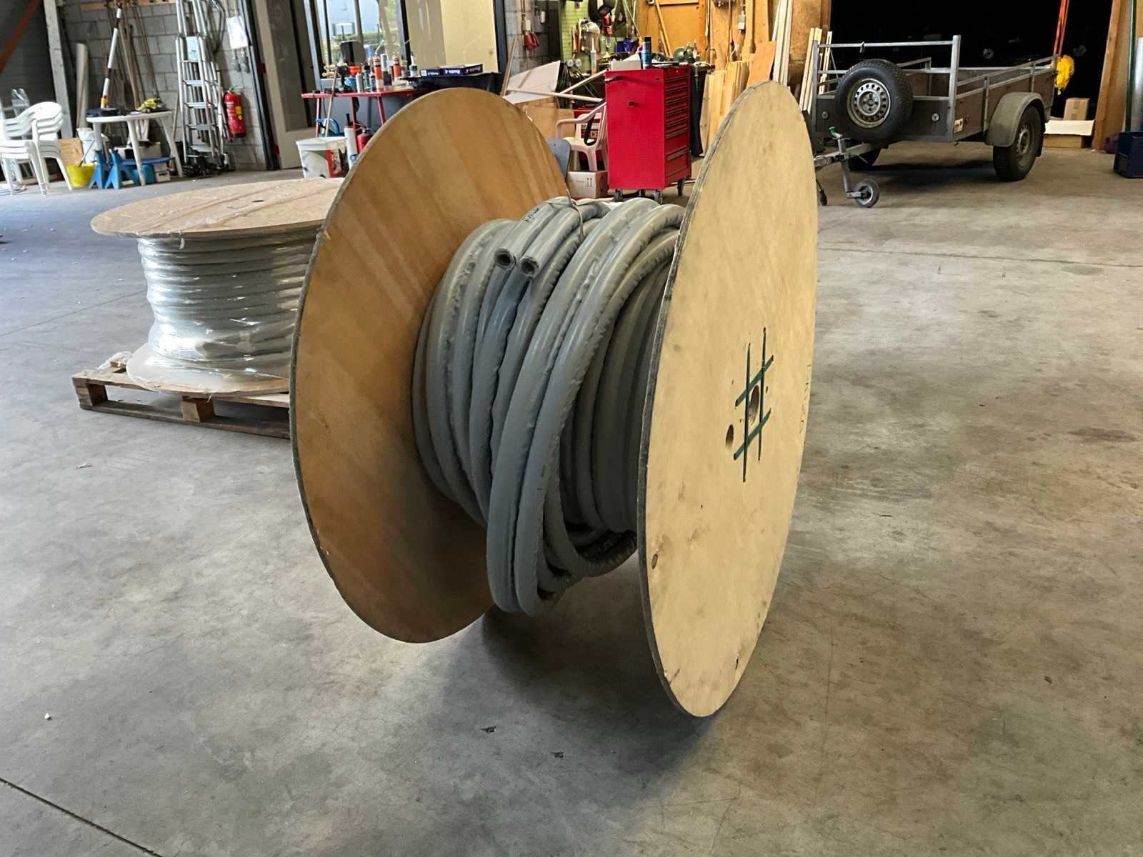 Diameter DN20; flexibel gegolfde roestvast staal dubbele slang; materiaal AISI 316 / fijne golf; EN ISO 10380; nano isolatie, circa 5 mm; PVC coating 1 mm; inclusief sensorkabel, toepassing koelen en verwarmen; zonne energie; warmtepomp; temperatuurbereik 200 °C (kortstondig + 600 °C); warmtegeleiding 0,020 Watt / mk; kleur grijs; lengte 50 meter; ongebruikt; op hout haspel; Merk: Eco4You Type: Nanoflex DN20