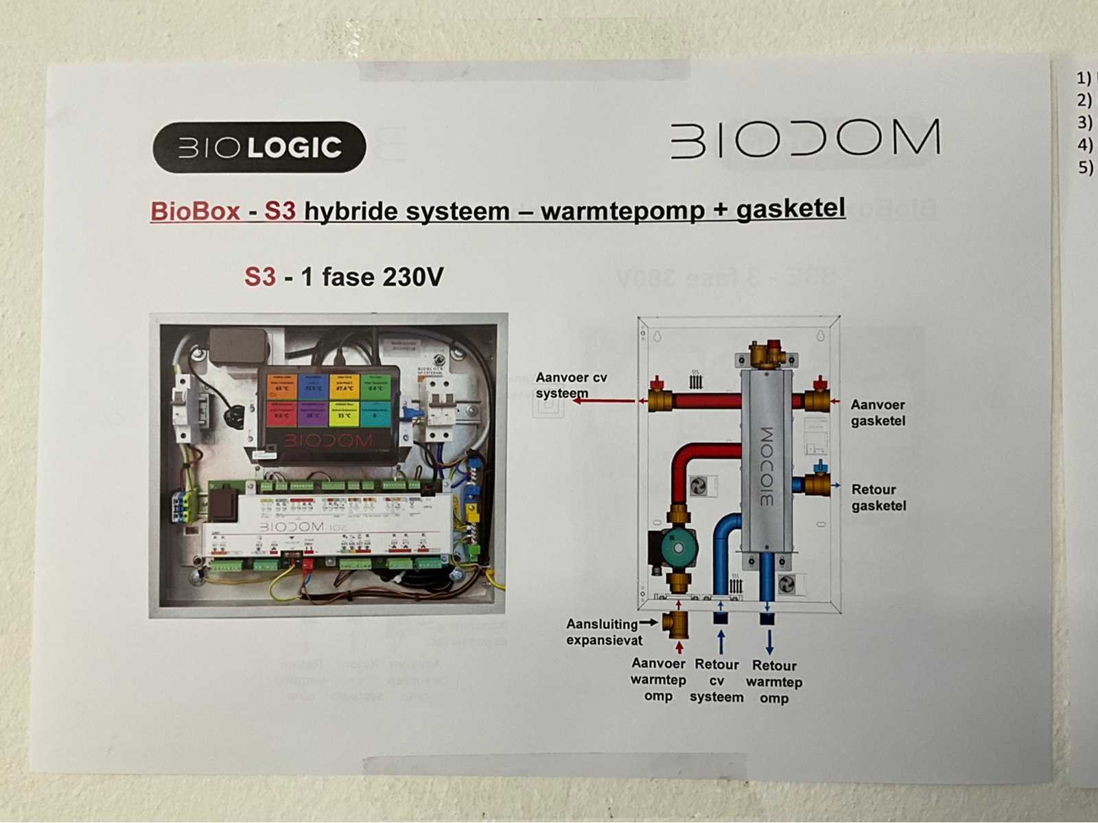 Geluidsarm; zuinig; verwarmen en koelen; buiten-unit: energielabel A+++; monoblok warmtepomp voorzien van Mitsubishi inverter compressor en moduleert naar gelang warmtevraag; hoge SCOP: 4,73 en COP 4,7; milieuvriendelijk gas R32; laag geluidsniveau 44 / 53 dB; afmeting 1170x370x850 mm; gewicht 78 kg; binnen-unit: bestaande uit BioBox S3E met geavanceerde adaptieve Biodom IQ2 controller, touchscreen; WiFi en vaste aansluiting; Windows 10 applicatie; op afstand regelbare aansluiting; monitoring vanop afstand; open verdeler; 3 kW elektrisch element; ook geschikt voor het aansturen van andere externe warmtebronnen (gasketel, pelletketel of olieketel) aansturing van buffervat, tapwaterboiler, 3 gemengde en ongemengde verwarmingscircuits; gebruik van de binnen-unit zowel voor hydride als ook volledig elektrische systemen; vermogen 9,2 kW; (zonder ophangframe op eerste foto); (voor Nederland vermeld op lijst RVO voor ISDE subsidie); ongebruikt; originele verpakking; zonder wielen; Merk: Biodom Type: 9,2 kW