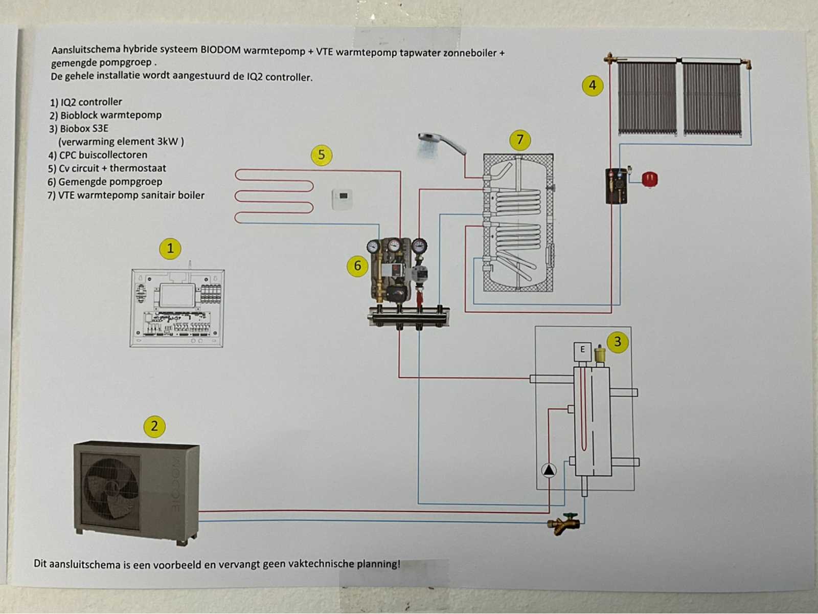 Geluidsarm; zuinig; verwarmen en koelen; buiten-unit: energielabel A+++; monoblok warmtepomp voorzien van Mitsubishi inverter compressor en moduleert naar gelang warmtevraag; hoge SCOP: 4,73 en COP 4,7; milieuvriendelijk gas R32; laag geluidsniveau 44 / 53 dB; afmeting 1170x370x850 mm; gewicht 78 kg; binnen-unit: bestaande uit BioBox S3E met geavanceerde adaptieve Biodom IQ2 controller, touchscreen; WiFi en vaste aansluiting; Windows 10 applicatie; op afstand regelbare aansluiting; monitoring vanop afstand; open verdeler; 3 kW elektrisch element; ook geschikt voor het aansturen van andere externe warmtebronnen (gasketel, pelletketel of olieketel) aansturing van buffervat, tapwaterboiler, 3 gemengde en ongemengde verwarmingscircuits; gebruik van de binnen-unit zowel voor hydride als ook volledig elektrische systemen; vermogen 9,2 kW; (zonder ophangframe op eerste foto); (voor Nederland vermeld op lijst RVO voor ISDE subsidie); ongebruikt; originele verpakking; zonder wielen; Merk: Biodom Type: 9,2 kW