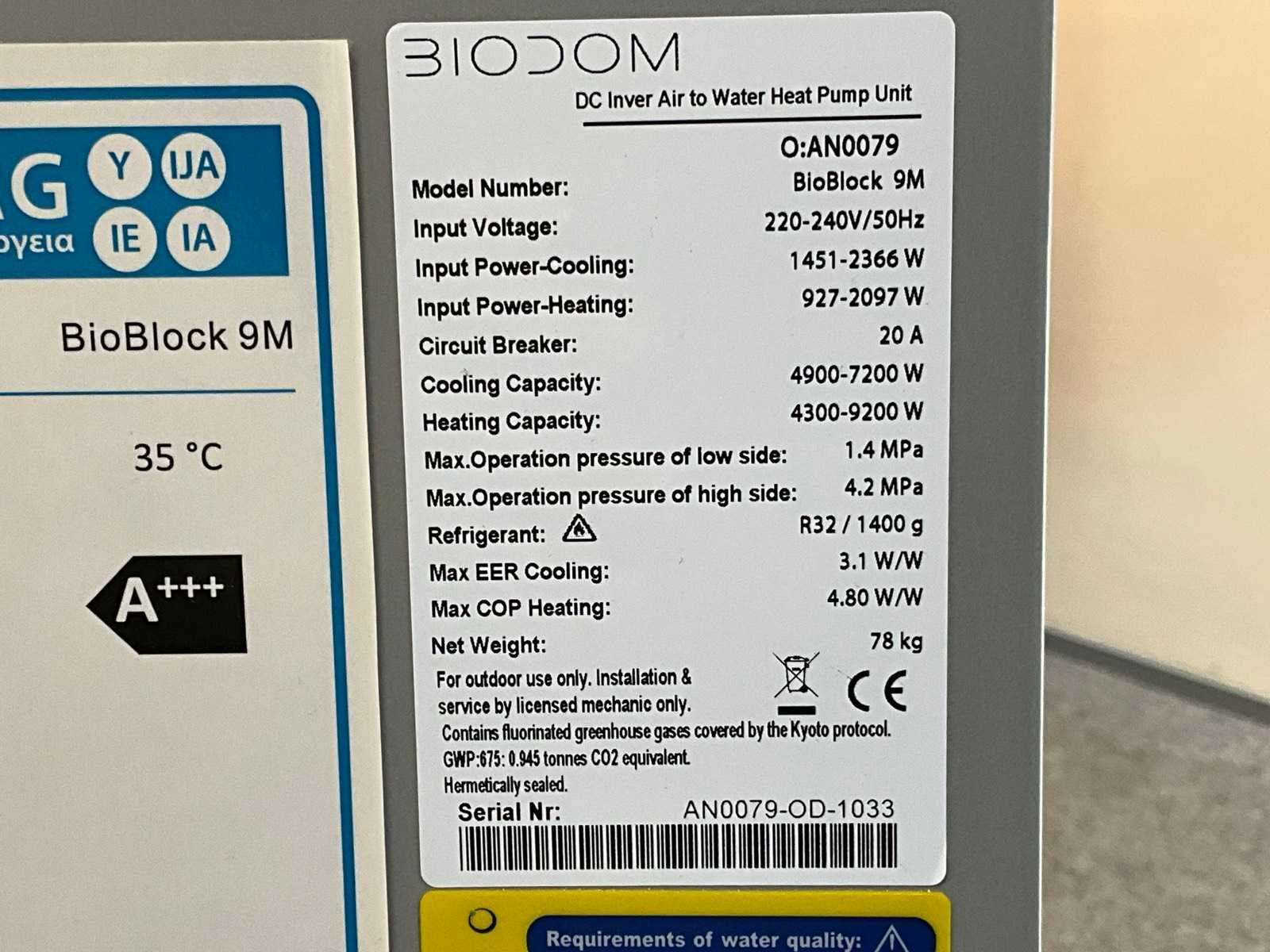 Geluidsarm; zuinig; verwarmen en koelen; buiten-unit: energielabel A+++; monoblok warmtepomp voorzien van Mitsubishi inverter compressor en moduleert naar gelang warmtevraag; hoge SCOP: 4,73 en COP 4,7; milieuvriendelijk gas R32; laag geluidsniveau 44 / 53 dB; afmeting 1170x370x850 mm; gewicht 78 kg; binnen-unit: bestaande uit BioBox S3E met geavanceerde adaptieve Biodom IQ2 controller, touchscreen; WiFi en vaste aansluiting; Windows 10 applicatie; op afstand regelbare aansluiting; monitoring vanop afstand; open verdeler; 3 kW elektrisch element; ook geschikt voor het aansturen van andere externe warmtebronnen (gasketel, pelletketel of olieketel) aansturing van buffervat, tapwaterboiler, 3 gemengde en ongemengde verwarmingscircuits; gebruik van de binnen-unit zowel voor hydride als ook volledig elektrische systemen; vermogen 9,2 kW; (zonder ophangframe op eerste foto); (voor Nederland vermeld op lijst RVO voor ISDE subsidie); ongebruikt; originele verpakking; zonder wielen; Merk: Biodom Type: 9,2 kW