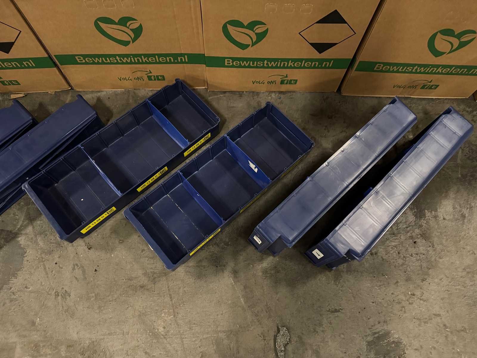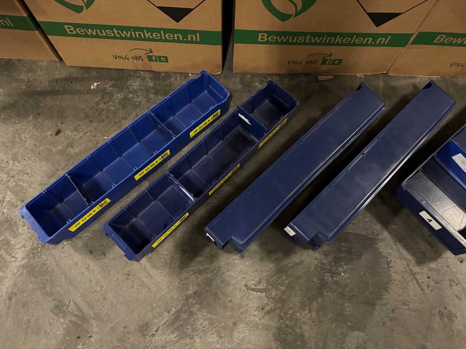 450 bakjes 190x495x80mm, 230 bakjes 95x495x80mm, 3 kratten vakverdelers