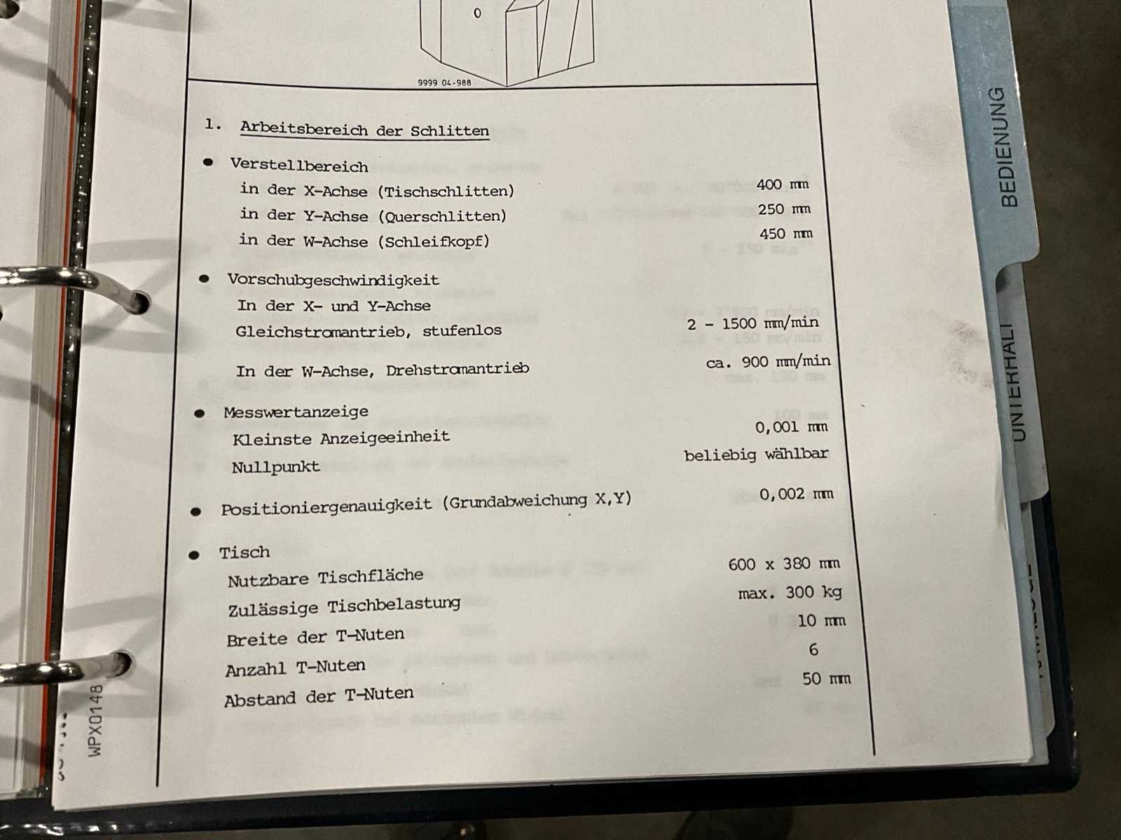 Verplaatsing X-as 400mm, Y-as 250mm, W-as( slijpkop) 450mm, z-as 120mm ( hydraulisch), opspantafel afmeting 600x380 mm, maximaal werkstuk gewicht 300 kg, voorzien van hauser carrousel opspanplaat, diverse extra slijpkoppen, Elesta visulesta 2 digitaal uitleesvenster, handleiding en installatieschema’s, machine is reeds professioneel gedemonteerd en staat transportklaar Merk: Hauser Type: S3 DR Bouwjaar: 1990 Serienummer: S30612 Aansluiting: 380V Machinegewicht: 3800kg Afmeting l: 1700mm Afmeting b: 1400mm Afmeting h: 3100mm