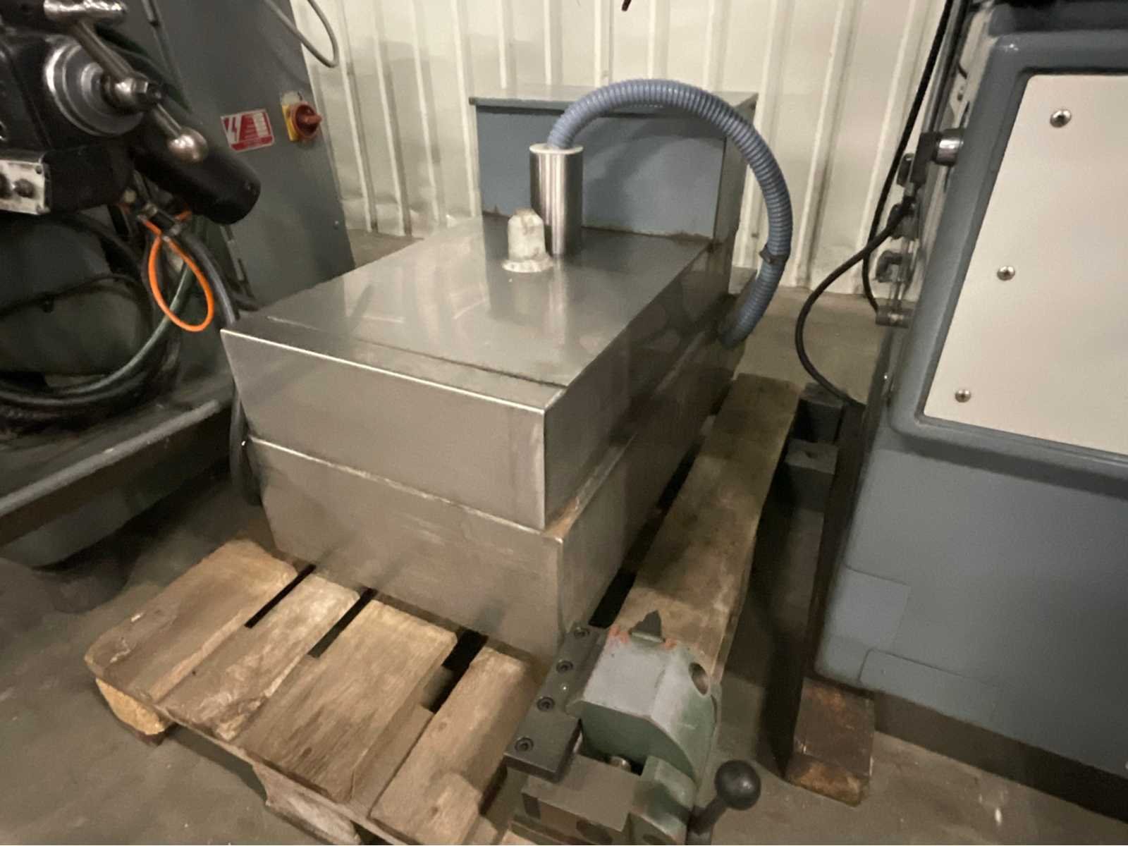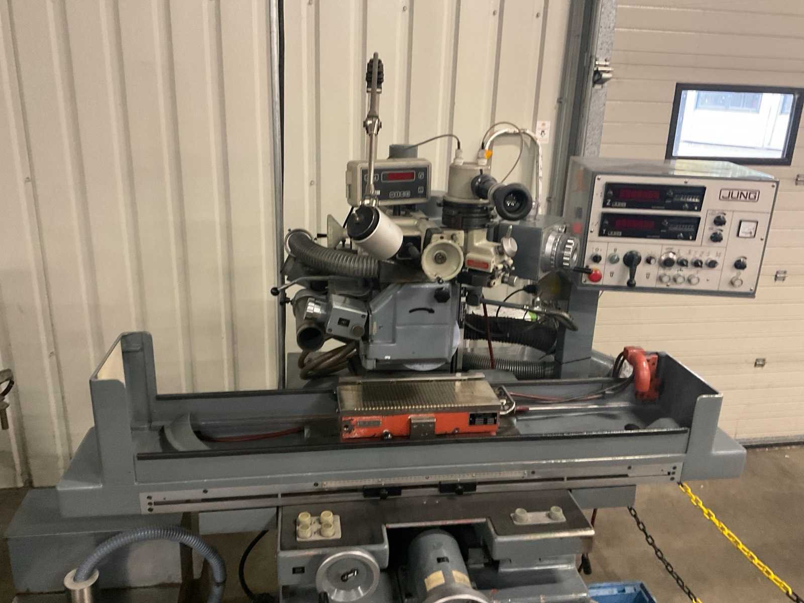 Voorzien van optidress microscoop inrichting, digitale positie uitlezing, jung magneettafel, rvs filterbak, partij extra slijpstenen, machine staat reeds transportklaar Merk: Jung Type: JF415 Bouwjaar: 1984 Serienummer: 1285 Tafel afmeting l: 150mm Tafel afmeting b: 550mm Slijpsteen Ø: 200mm Slijpsteen dikte: 35mm Magnetische opspantafel afm.: 400mm Besturing, merk, type: Heidenhain Aansluiting: 220V Machinegewicht: 1250kg Afmeting l: 1700mm Afmeting b: 1200mm Afmeting h: 2400mm
