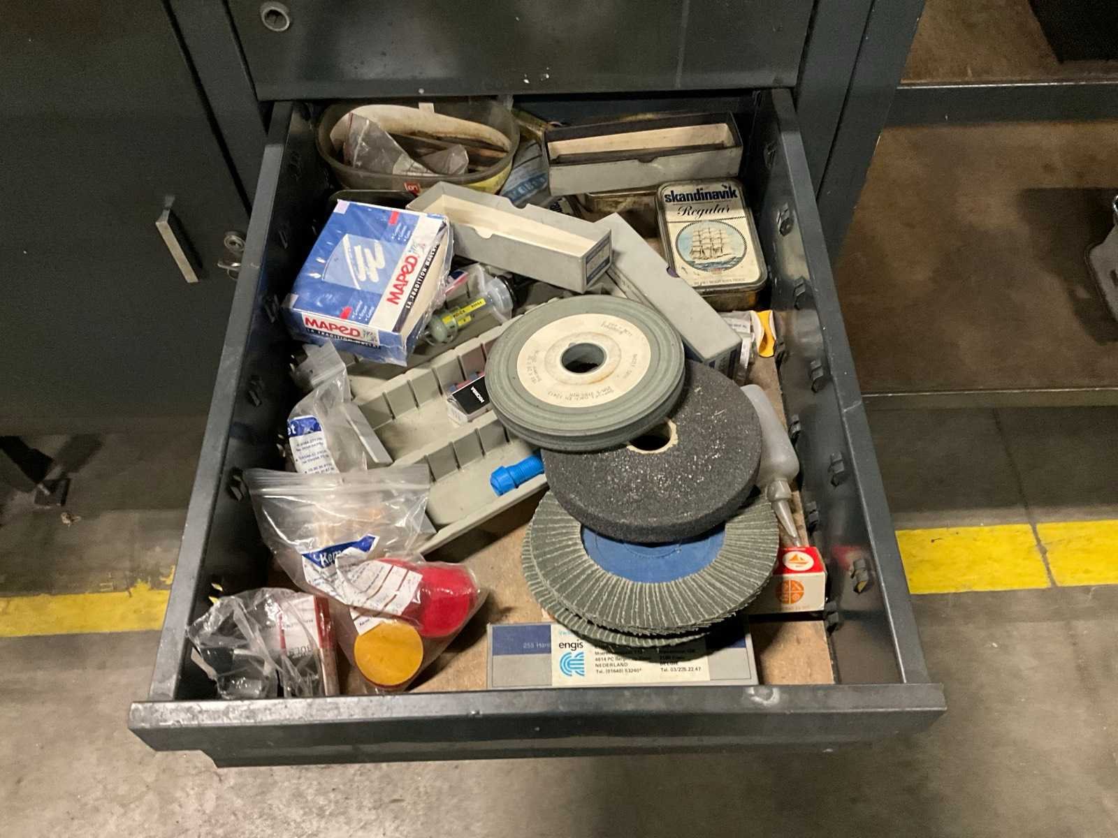Voorzien van 1 kast, 4 laden en diverse inhoud met hemklem bankschroef en verlichting en diversen op werktafel, zonder slijpmachine Lengte: 200cm Breedte: 75cm Hoogte: 92cm