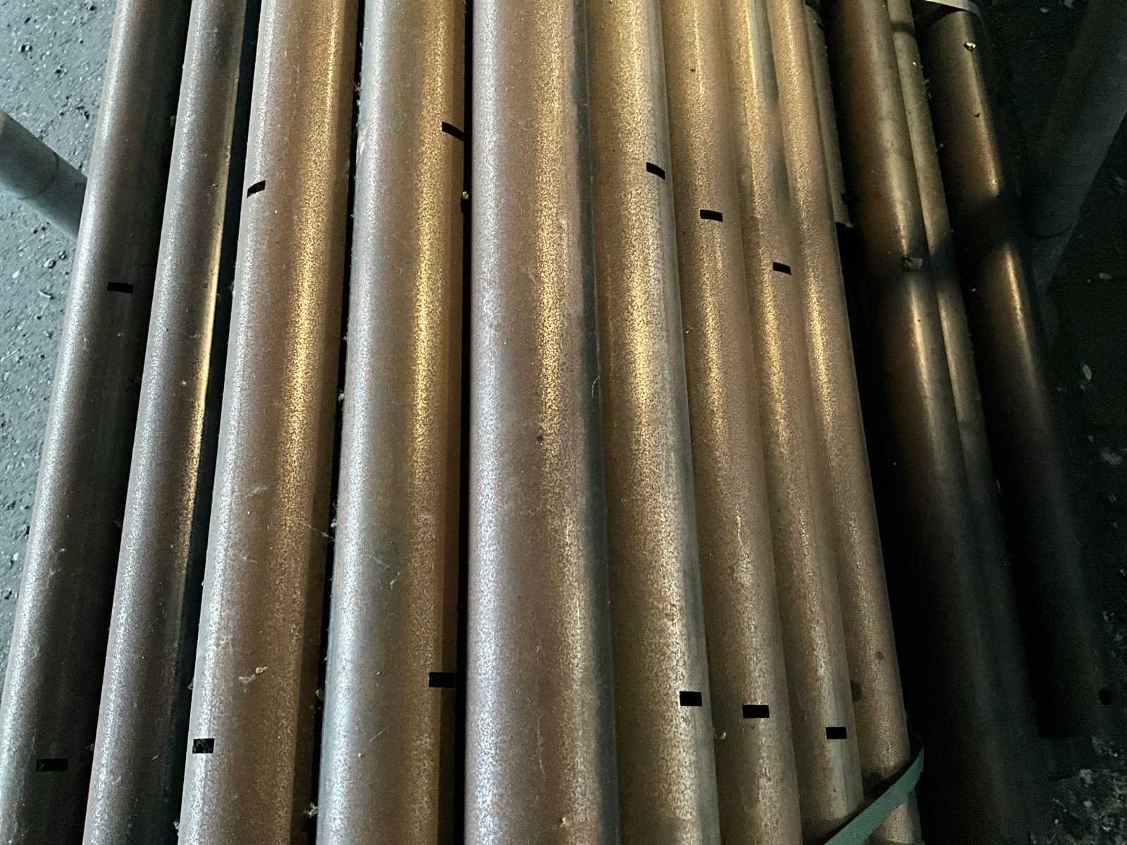 Diameter 70 mm, wanddikte 2,9 mm, totaal circa 100 stuks, waarvan circa 8 stuks lengte 3860mm, voorzien van diverse boor en sleufgaten in en met transportjuk Merk: MCB Type: Staal Afmeting l: 2980mm