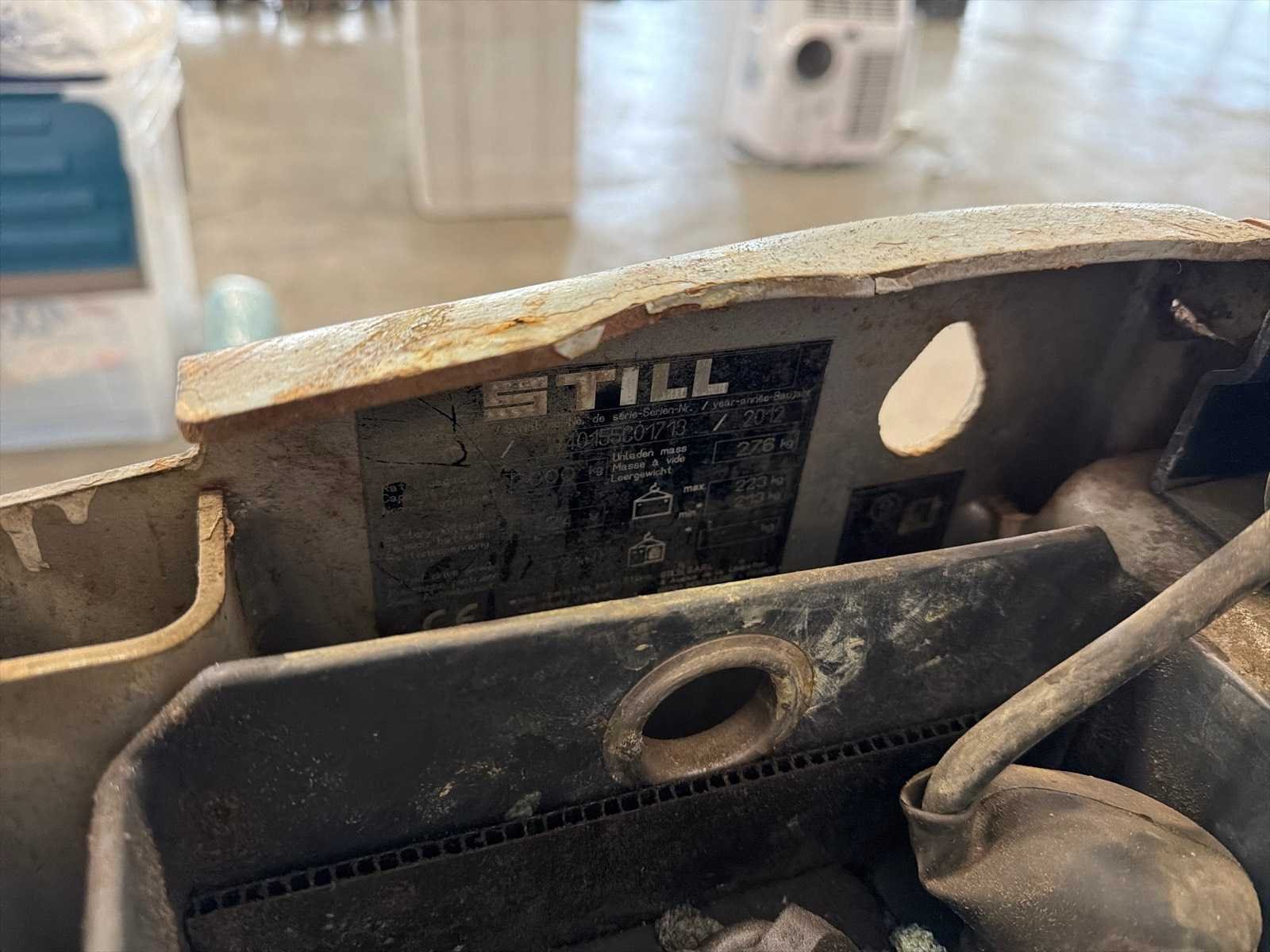 Storing in batterij (laad niet op) Merk: STILL Type: E212 Bouwjaar: 2012 Serienummer: 5015060178 Hefvermogen: 2000kg Lepellengte: 1150mm