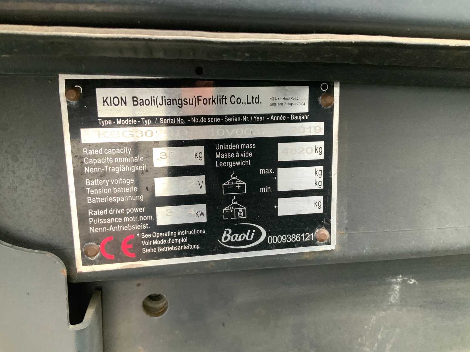 Baoli is een merknaam van de KION GROUP die ook Linde en Still vorkheftrucks bouwen, z.g.a.n. met bijzonder lage urenstand. Merk: Baoli/Kion Type: KBG30 Bouwjaar: 2019 Serienummer: B16010V00372 Brandstof: LPG Mast: Triple Soort band: Volrubber banden Aantal wielen: 4 Afgelezen urenstand: 423 Free-lift: true Side-shift: true Triple mast: true Eigen gewicht: 4820kg Hefvermogen: 3000kg Lepellengte: 1200mm Max. hefhoogte: 6000mm Vol rubber banden: true Minimale doorrijhoogte: 2250mm Totale afmeting L: 3950mm Totale afmeting Breedte: 1200mm Totale afmeting Hoogte: 2250mm LPG: true Leveringsvoorwaarden: Gratis op vrachtwagen