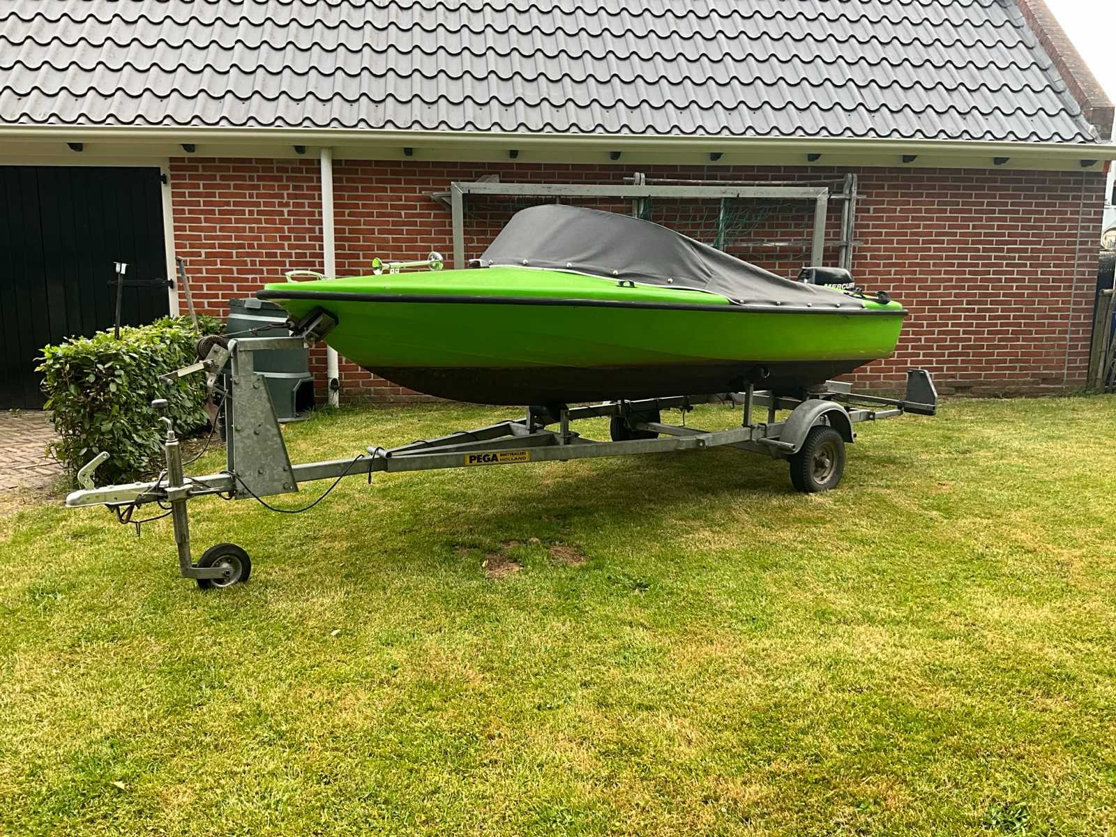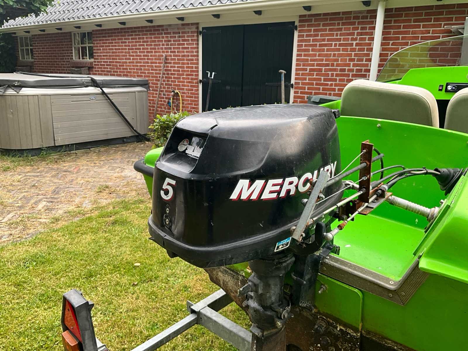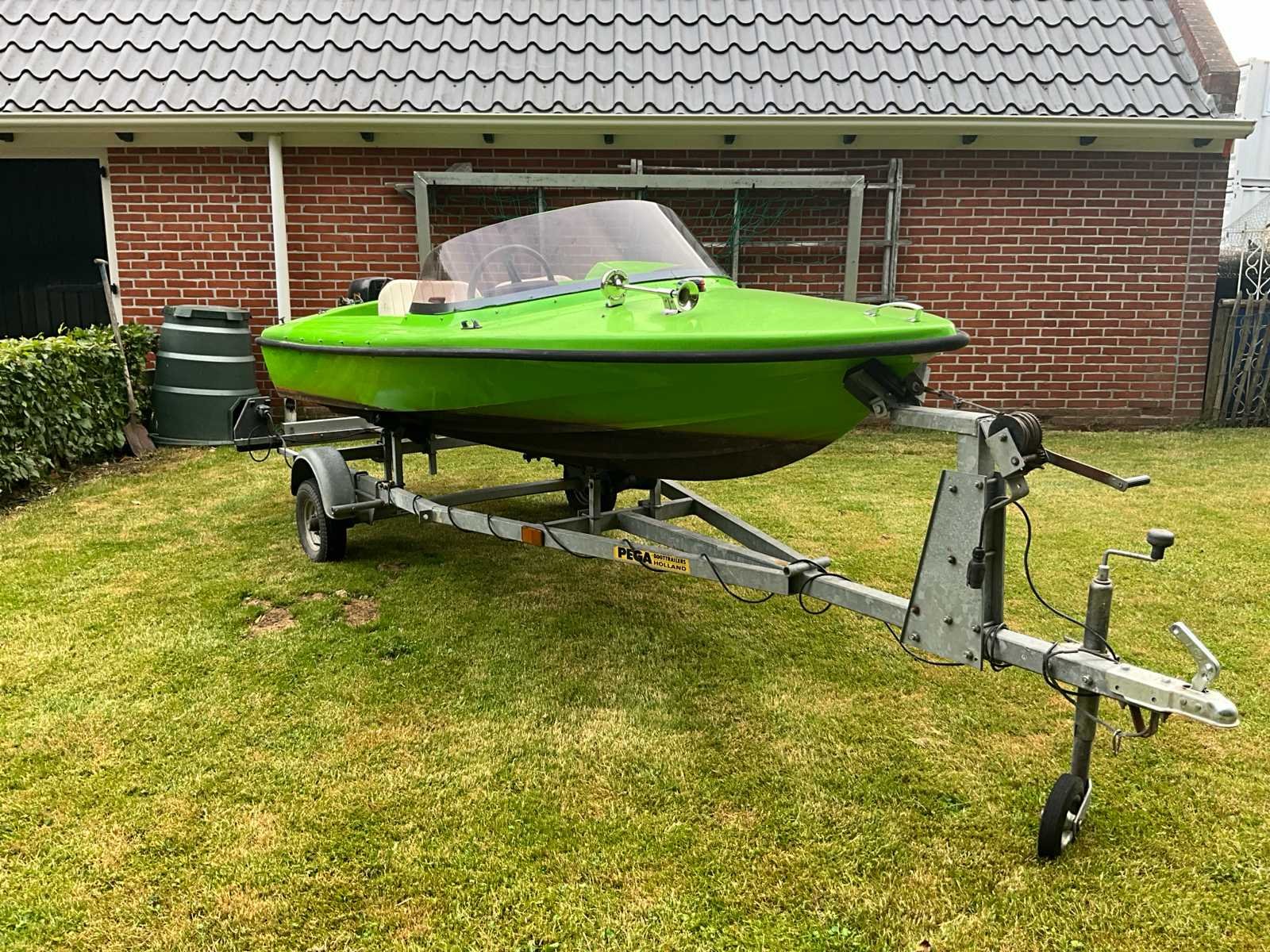 Stijlvolle groene boot met 2 zitplaatsen, ideaal voor recreatief varen of vissen; 5pk Mercury buitenboordmotor; met trailer: Degelijke boottrailer inbegrepen, klaar voor transport /vaarklaar; op maat gemaakt zeil voor bescherming tegen weersinvloeden; Werkende radio met 2 speakers voor muziek onderweg; Verlichting volledig functioneel, ideaal voor varen in schemer of ’s avonds; Accu inbegrepen, zodat alles direct klaar is voor gebruik; reddingsvest brandblusser vaarklaar Deze boot staat op een trailer en kan achter een auto gekoppeld worden. Na de sluiting van de veiling wordt er contact met u opgenomen om een afspraak te maken voor het afhalen. Merk: Speedboot Type: Pega boottrailer + 5 pk mercury Rompmateriaal: Polyester Brandstof: Benzine Breedte formaat: 1500m Type motor: 5 pk mercury Trailer merk + type: Pega ELG 4.5 450 kg Chassisnummer trailer: 09210 Lengte: 3850 Breedte: 1500