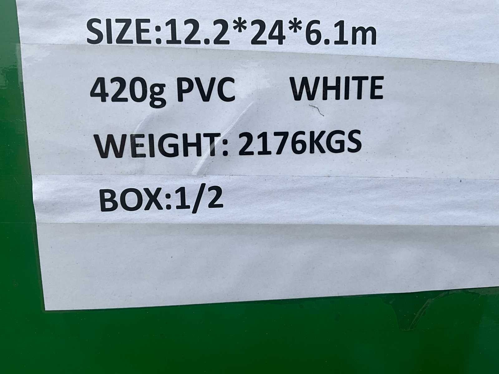 Opslagtent / garage; v.v. buizensysteem; gegalvaniseerd Ruimte tussen bogen 2400 mm Maat boog Φ 56x86x2 mm Maat gording Φ 48x1,5 mm; deur (afm. 396x451 cm); materiaal 420 gram PVC; kleur wit; inclusief montage handleiding; ongebruikt in 2 metalen kisten Zie voor meer info downloads; Transportafmeting metalen krat: 2950x750x1000 mm (lxbxh) Merk: Easy-Going Type: (24x12,20x6,10 meter) Bouwjaar: 2025 Eigen gewicht: 2240kg Totale afmeting L: 24000mm Totale afmeting Breedte: 12100mm Totale afmeting Hoogte: 6100mm GS Code: 63062200