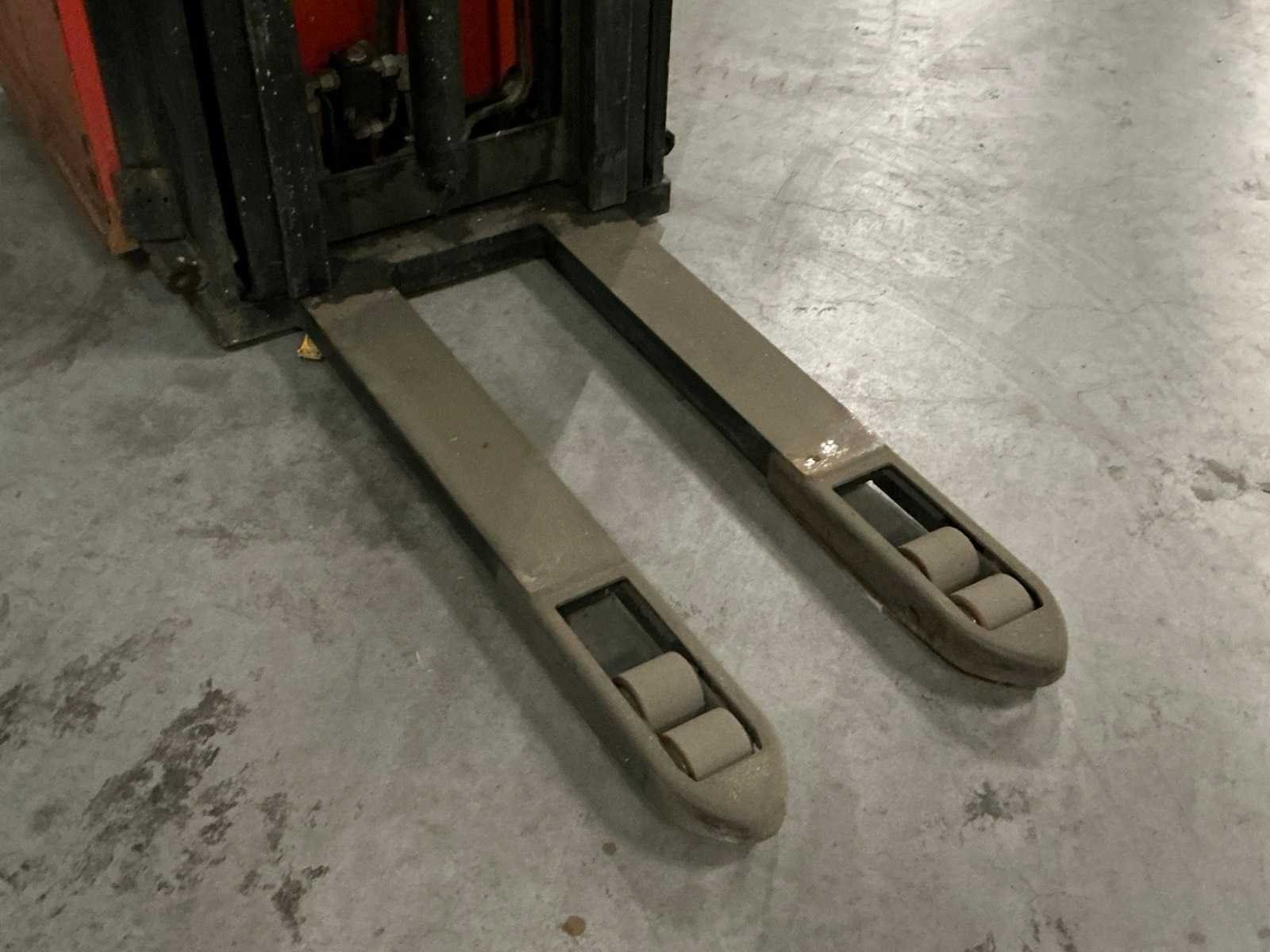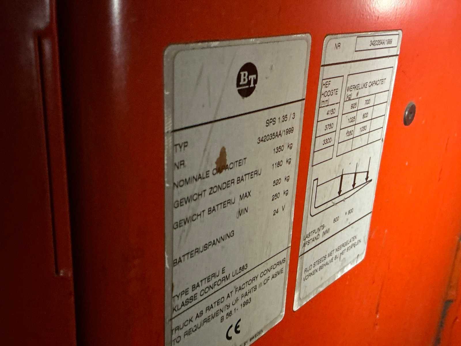 Merk: BT Type: SPS 1.35 / 3 Bouwjaar: 1999 Serienummer: 342035AA/1999 Hefvermogen: 1350kg Hefhoogte: 4150mm Lepellengte: 1150mm Afgelezen urenstand: 923 Eigen gewicht: 1590kg Minimale doorrijhoogte: 2620mm Meerij stapelaar: true Accu lader: true