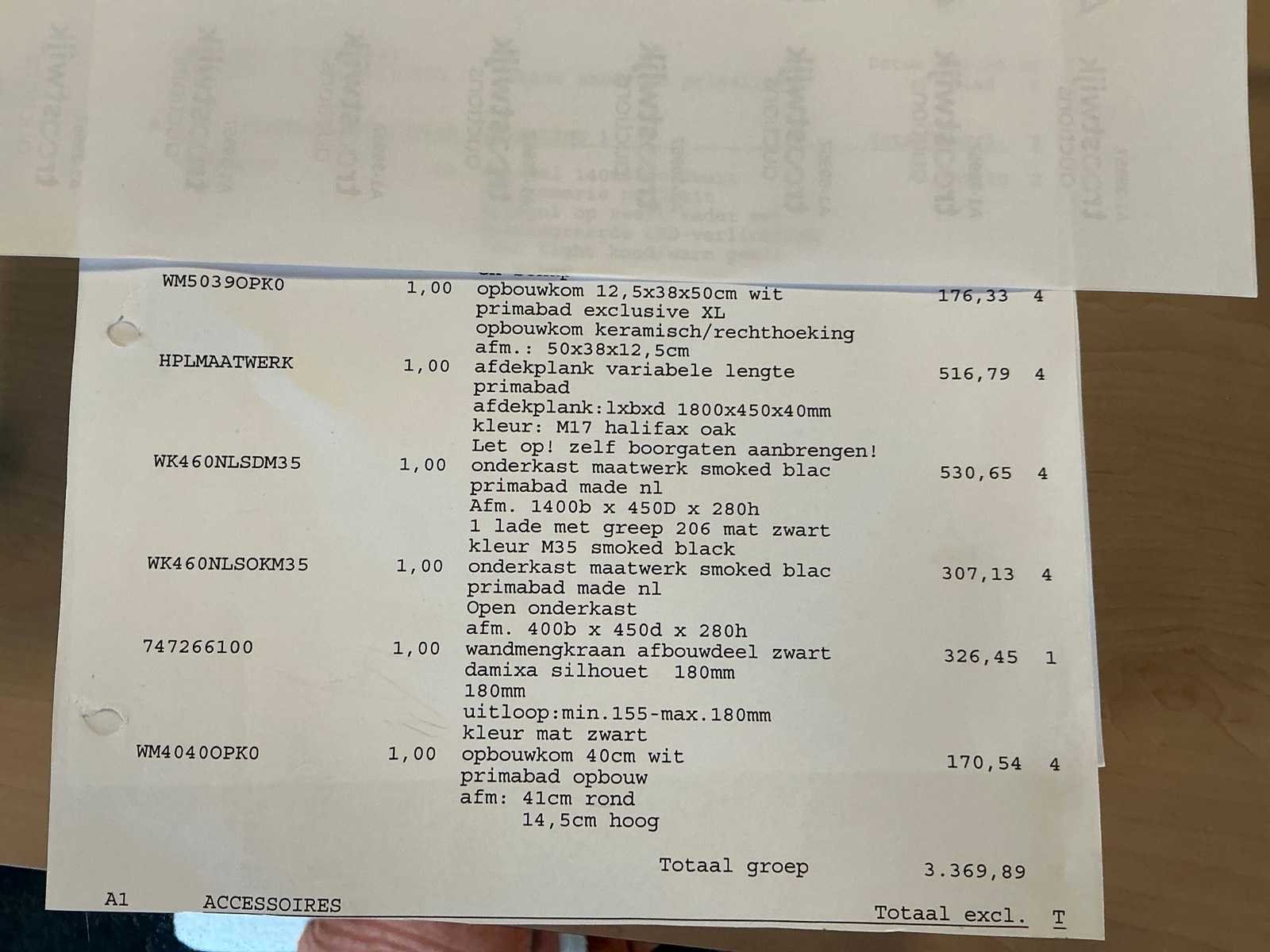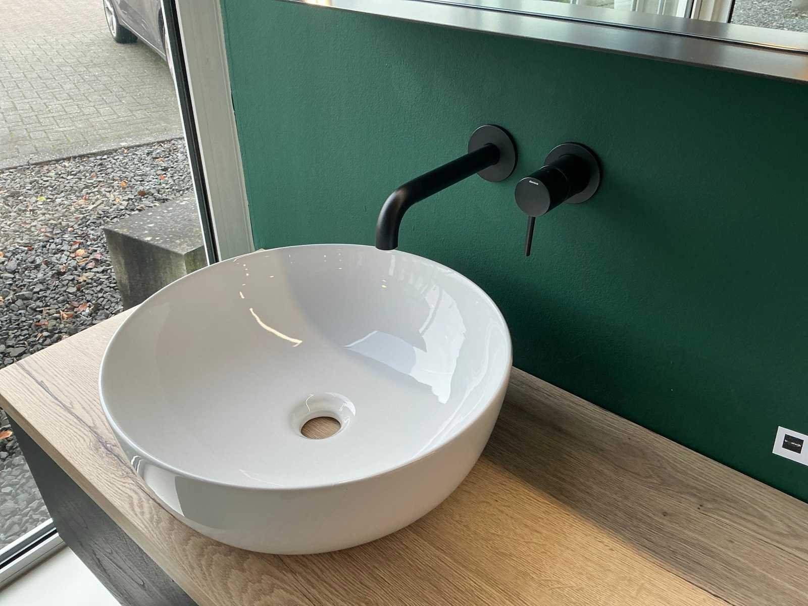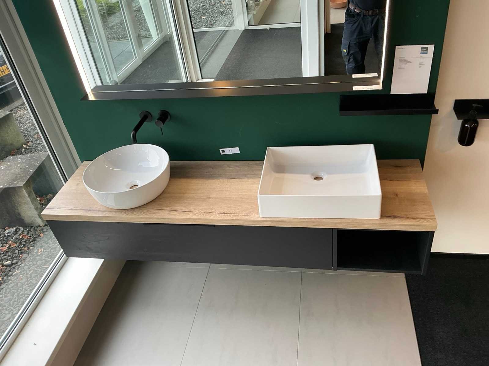 Bestaande uit Smoked black onderkast 1400x450x280mm + open onderkast 400x450x280mm , Halifax Oak afdekplank 1800x450x40mm, Eclusive XL Opbouwkom 50x38x12,5cm, Opbouwkom 41cm rond 14,5 hoog , Alape assist plank met accessoires. Zonder de los verkavelde spiegel (kavel 500). Kraan zonder binnenwerk alleen afbouwdeel. Merk: Primabad