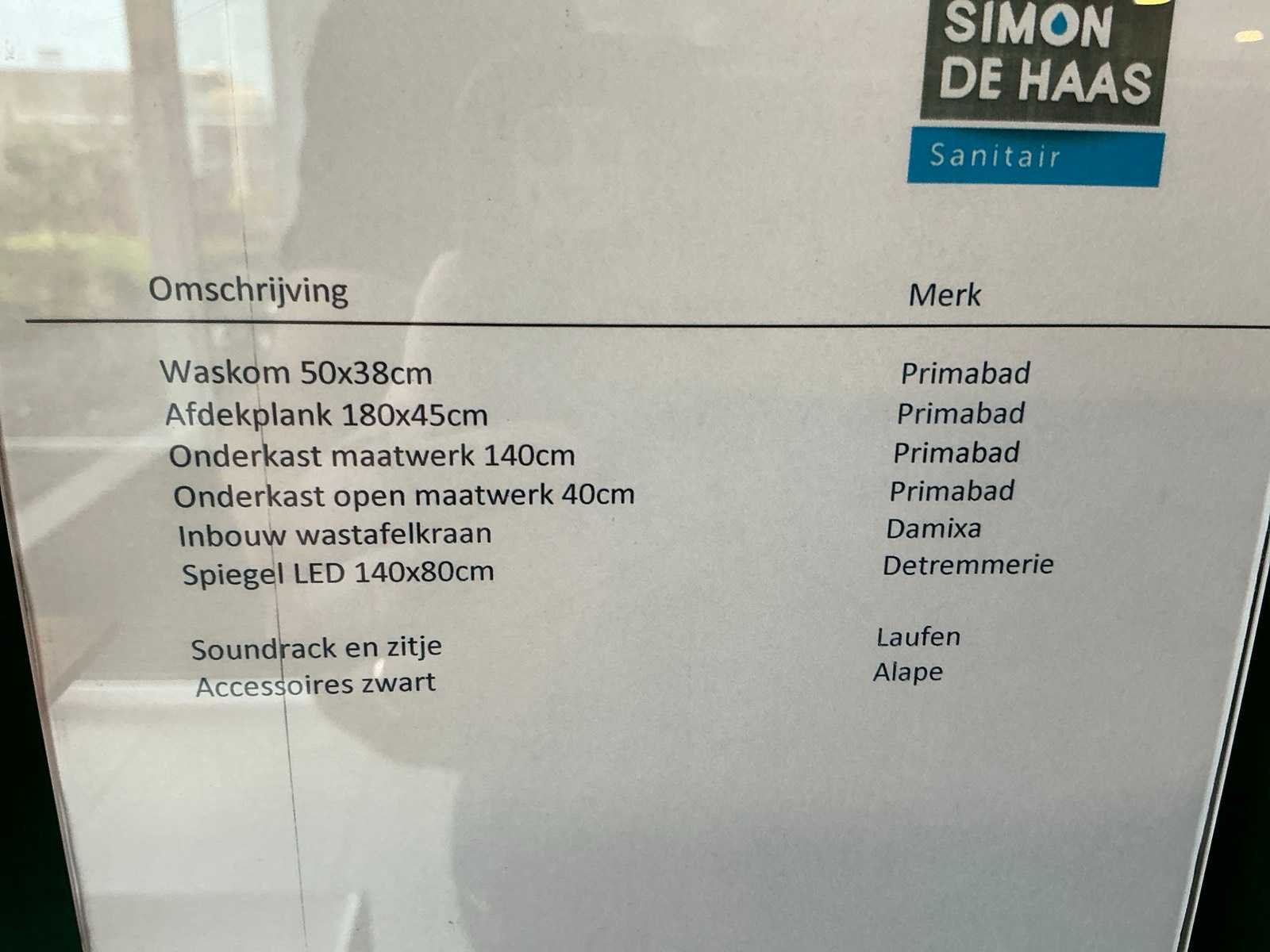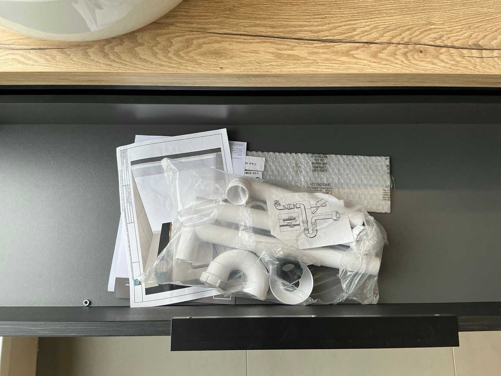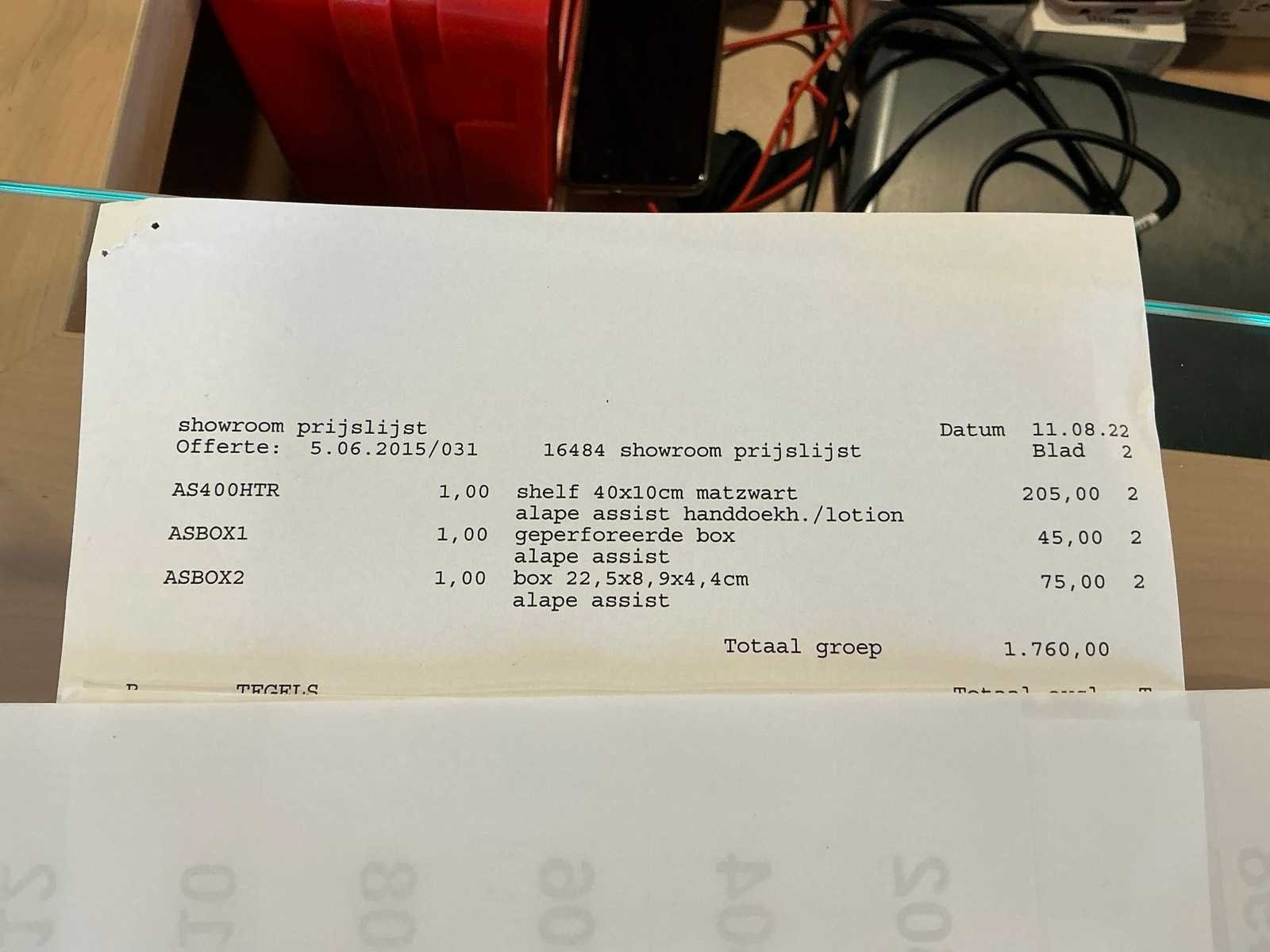 Bestaande uit Smoked black onderkast 1400x450x280mm + open onderkast 400x450x280mm , Halifax Oak afdekplank 1800x450x40mm, Eclusive XL Opbouwkom 50x38x12,5cm, Opbouwkom 41cm rond 14,5 hoog , Alape assist plank met accessoires. Zonder de los verkavelde spiegel (kavel 500). Kraan zonder binnenwerk alleen afbouwdeel. Merk: Primabad