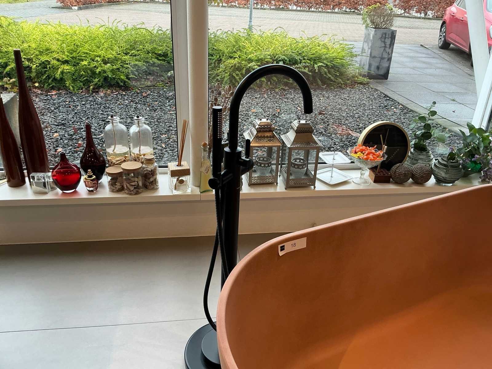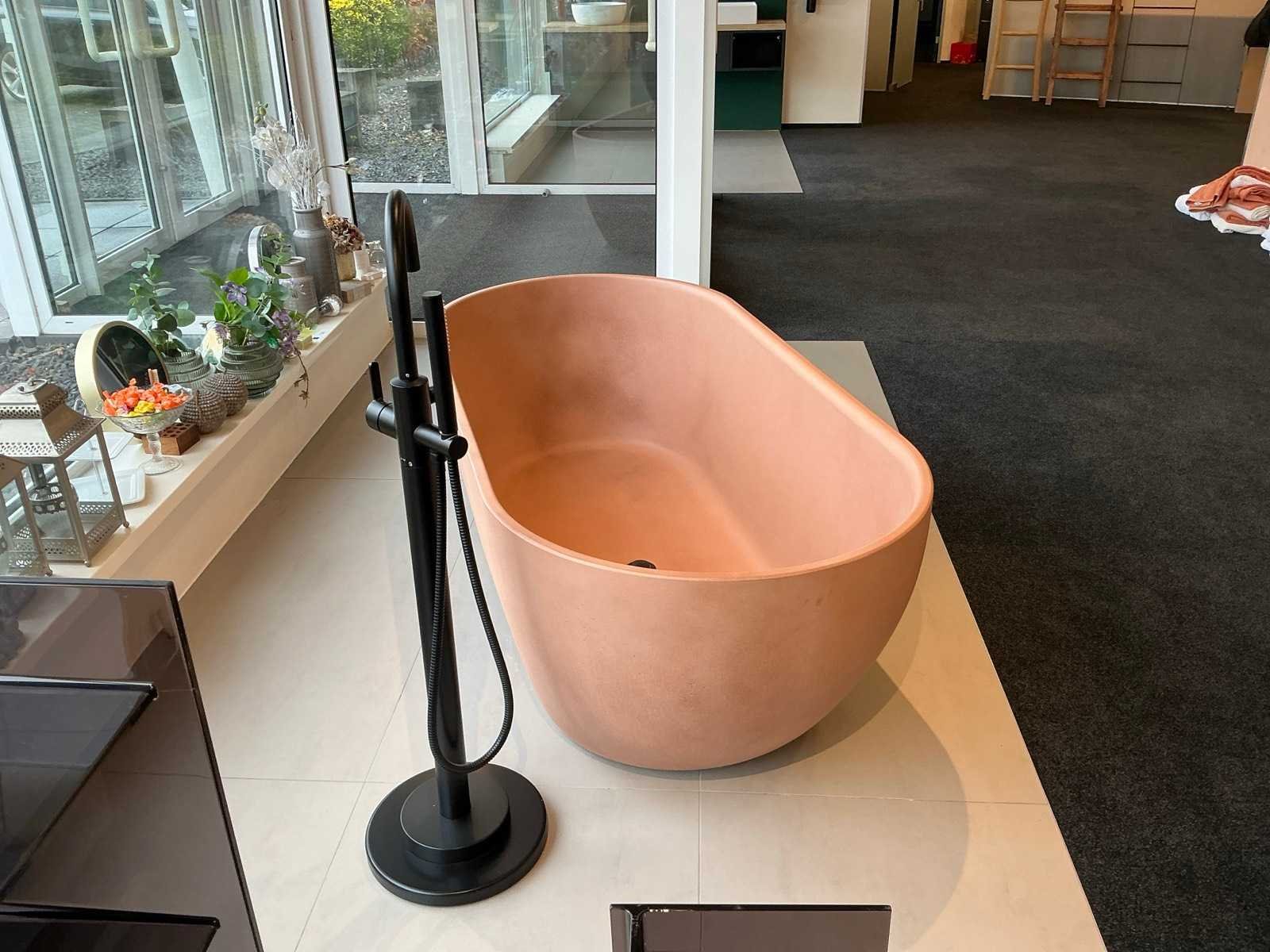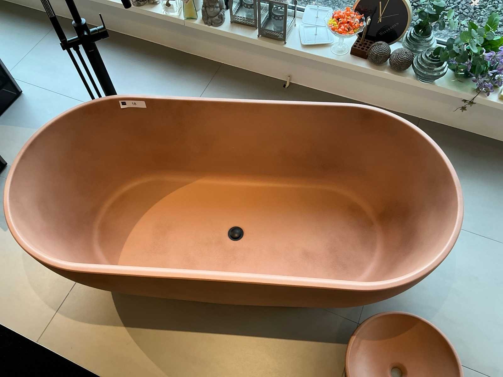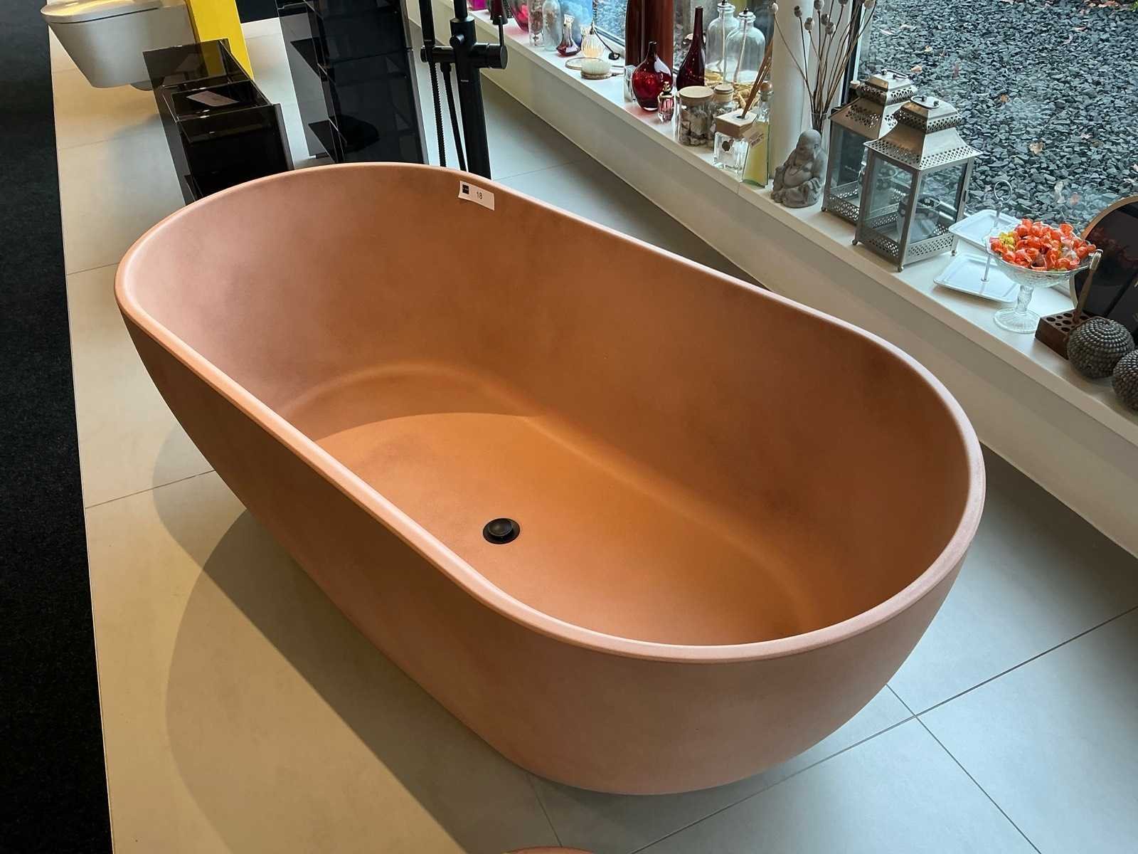 Gewicht 150KG, inhoud 200L. Voorzien van vrijstaande Damixa Silhouet badmengkraan inclusief handdouche ( zonder binnenwerk) en opbouw waskom 42,5x12cm. Merk: Detremmerie Model: Clement Beton Kleur: Terracotta Lengte: 160cm Breedte: 75cm Hoogte: 57cm