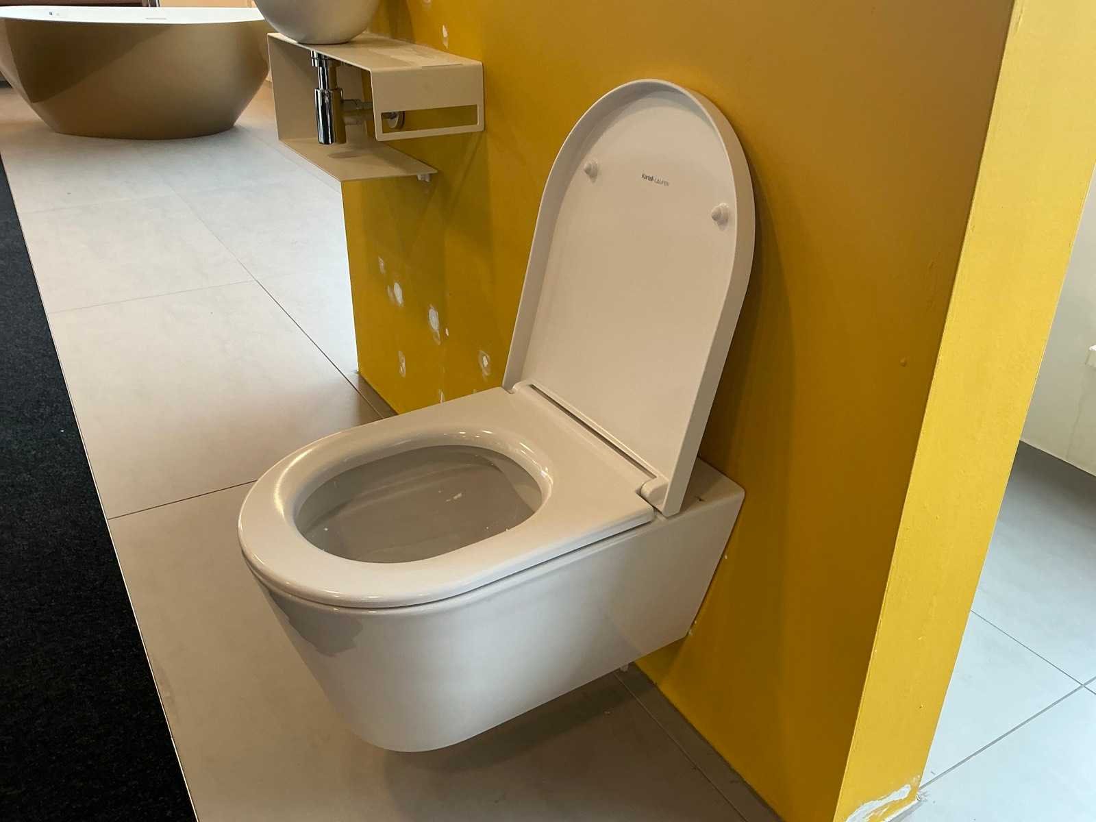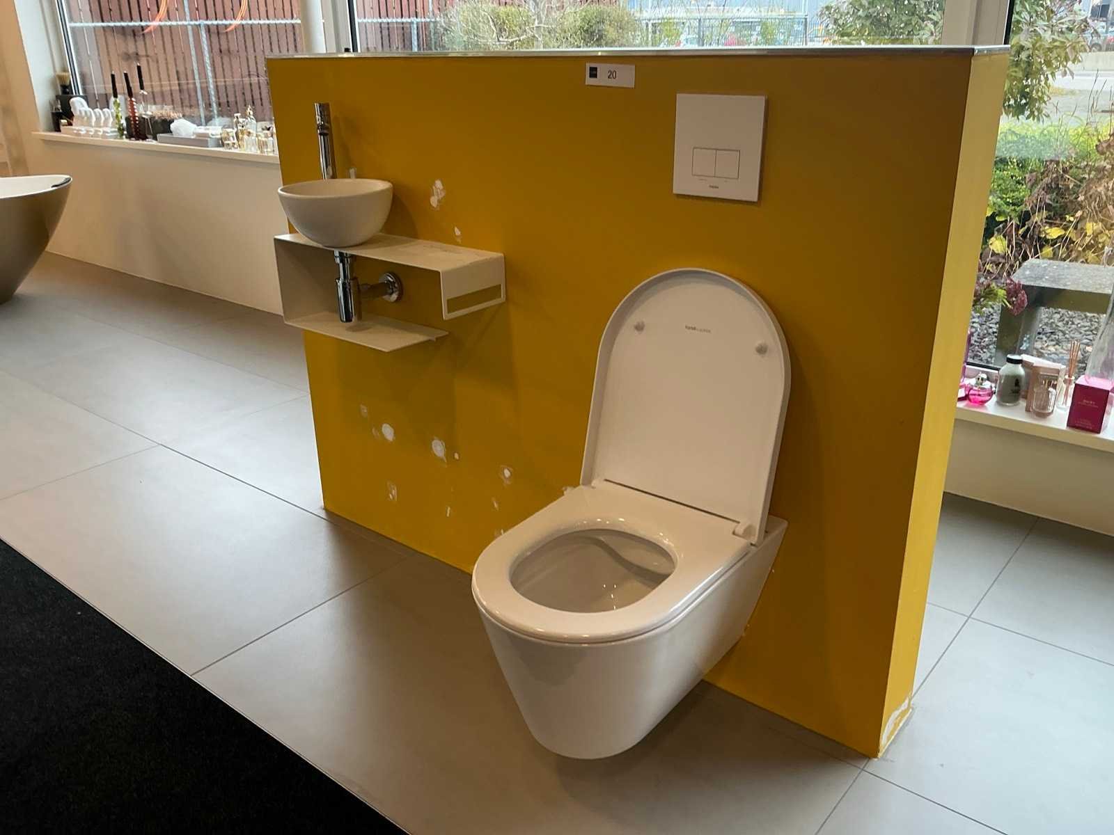 Voorzien van waskom ( Ø24cm), wandplank (54x20cm) en kraan zonder inbouwgedeelte. Drukknop zijn dummy. Let op! Zonder inbouwreservoir. Merk: Laufen Model: Kartell randloos