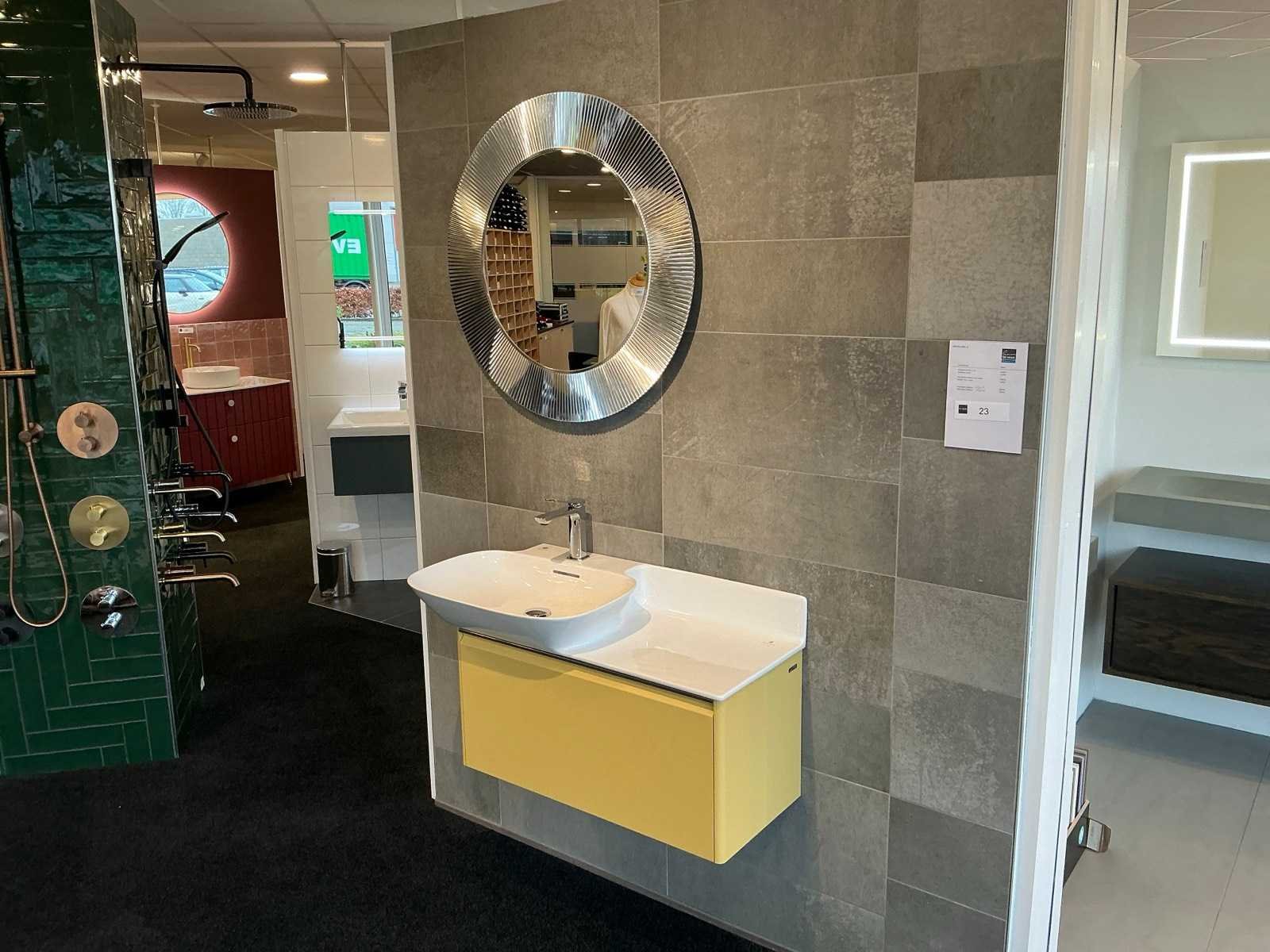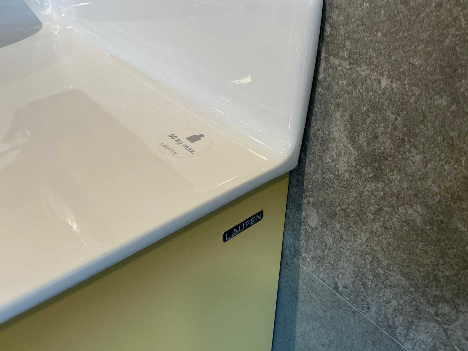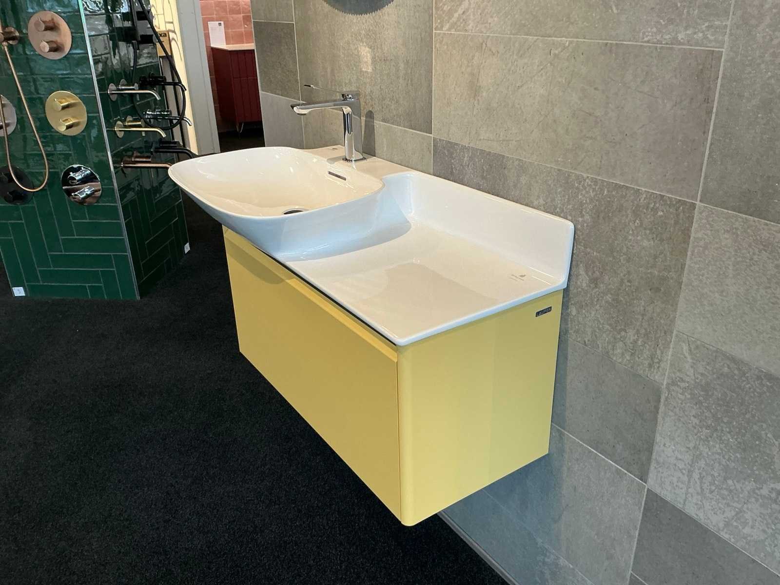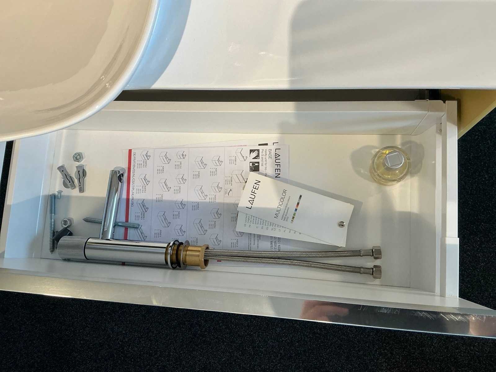 Bestaande uit een spiegel 78cm Kartell, meubelwastafel Ino waskom links (90cm), Ino onderkast 90cm met 1 greeploze lade, Paffoni Tilt wastafelmengkraan. Merk: Laufen Model: Ino