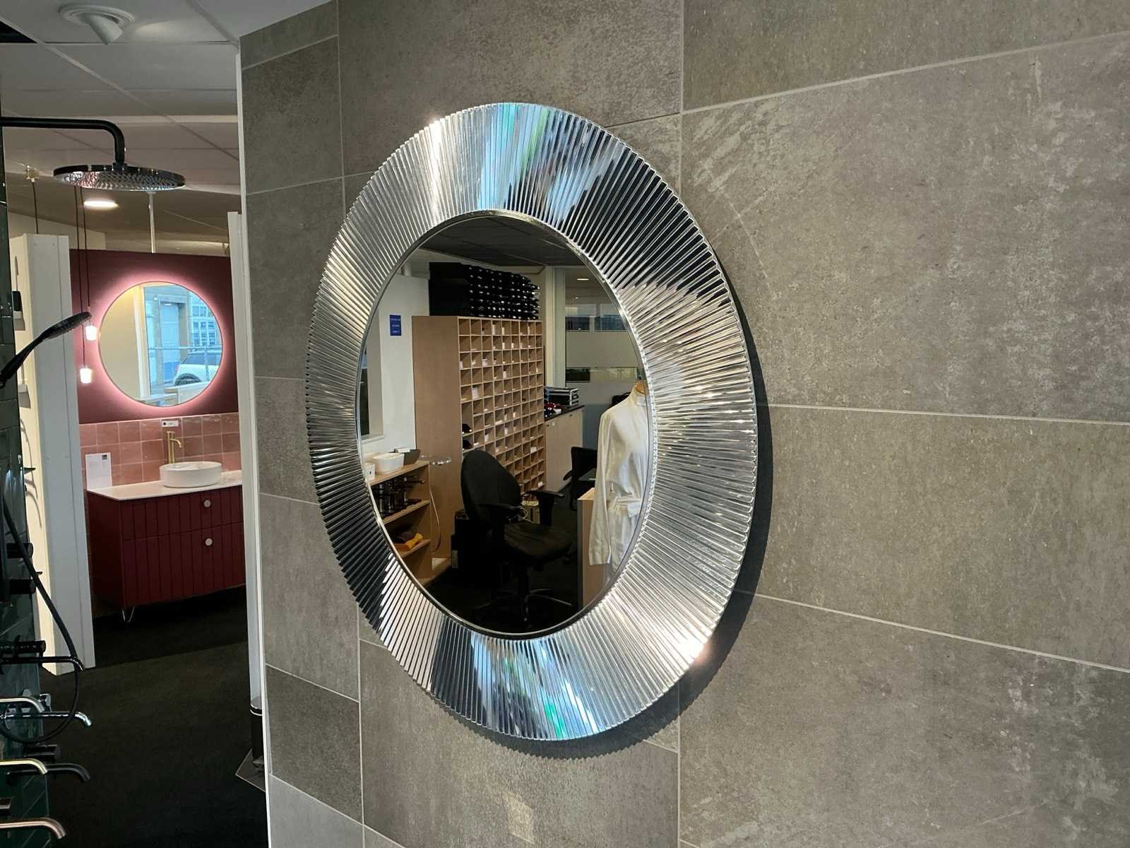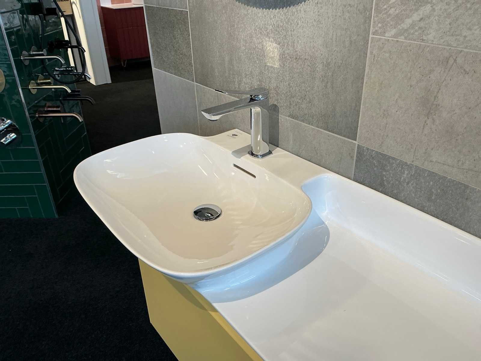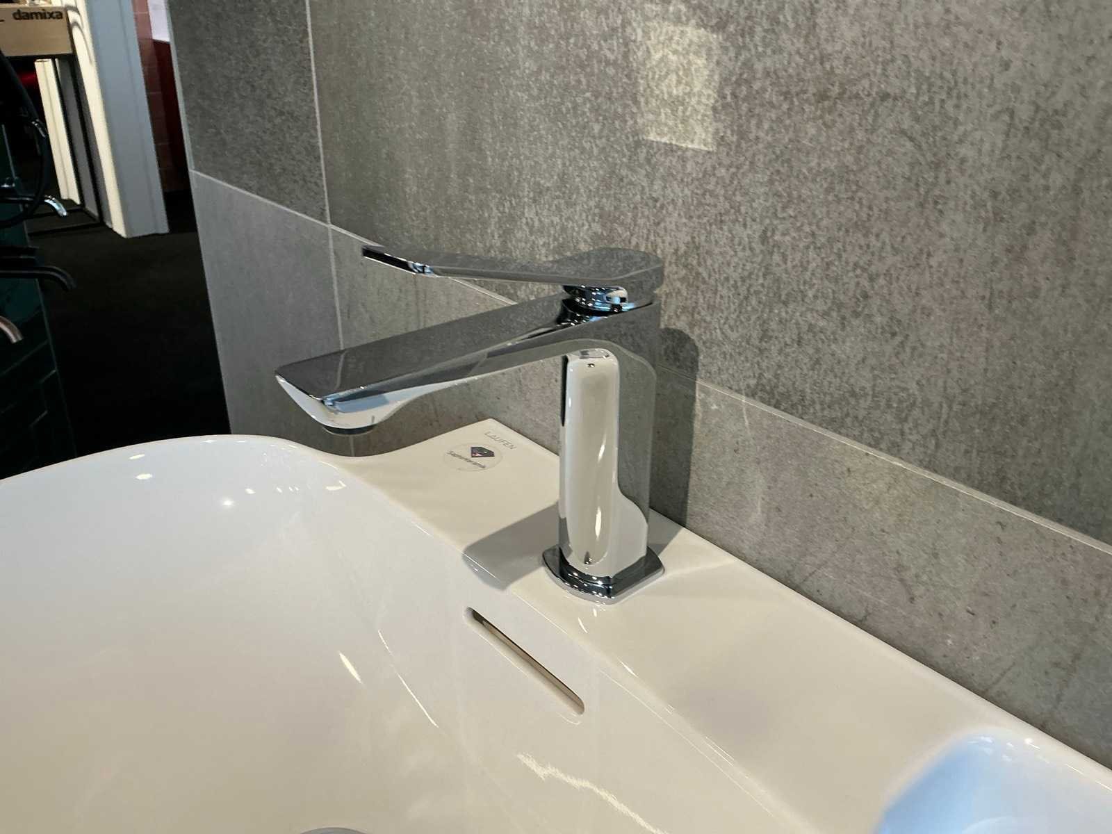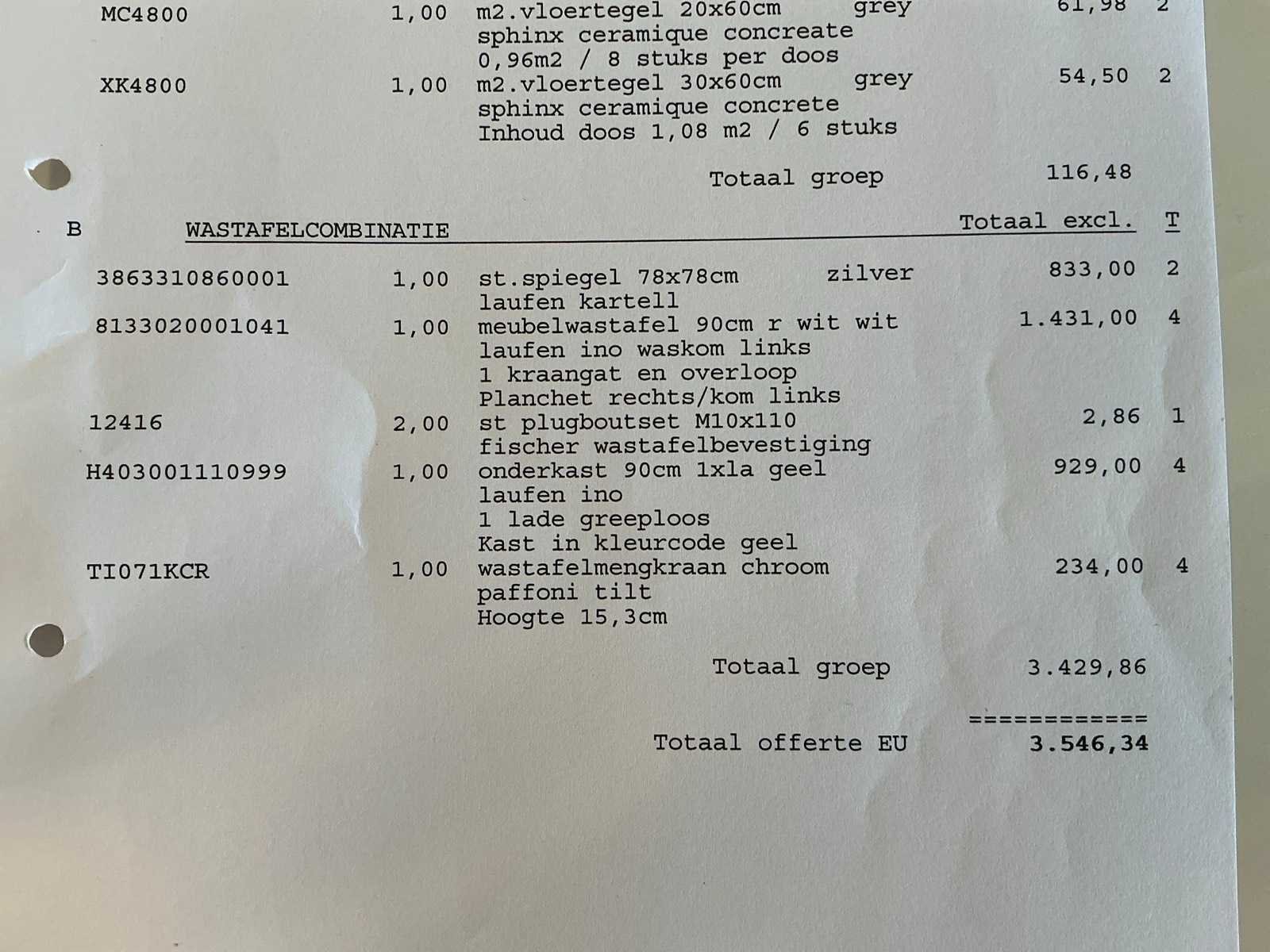 Bestaande uit een spiegel 78cm Kartell, meubelwastafel Ino waskom links (90cm), Ino onderkast 90cm met 1 greeploze lade, Paffoni Tilt wastafelmengkraan. Merk: Laufen Model: Ino
