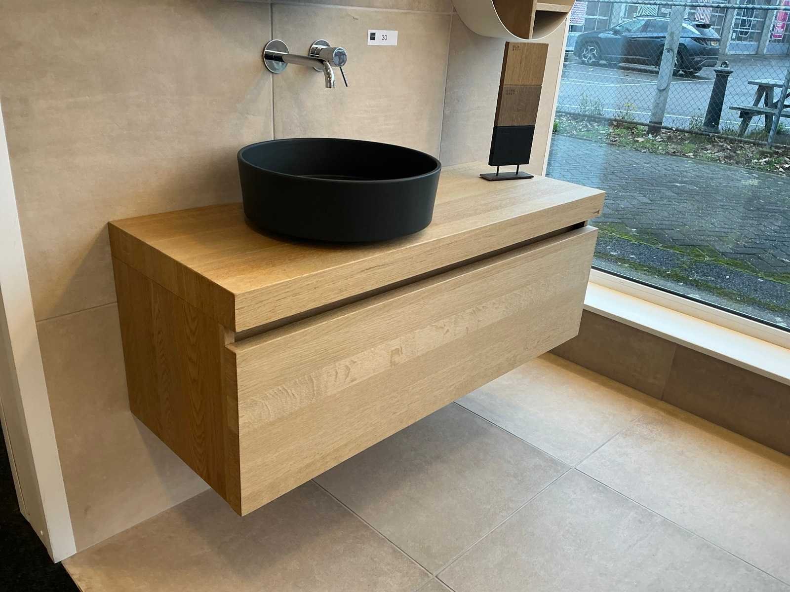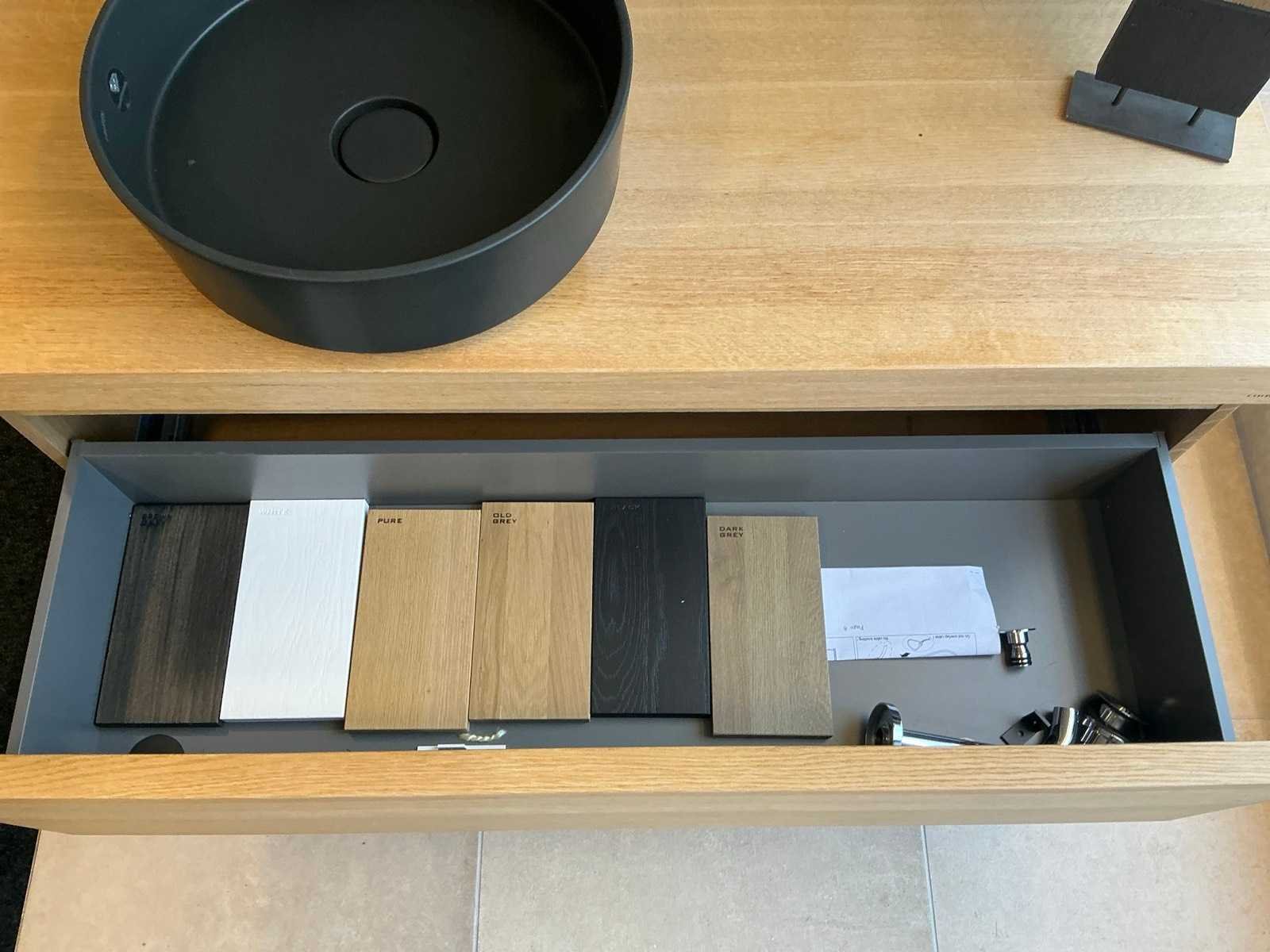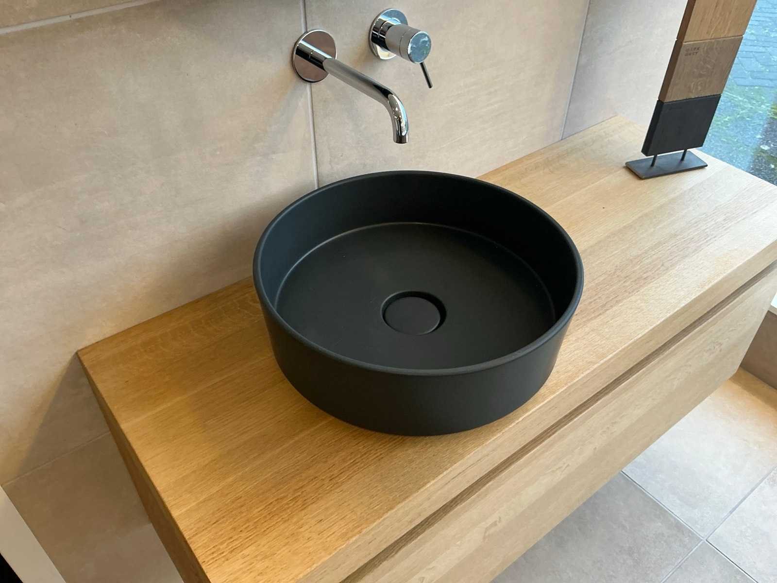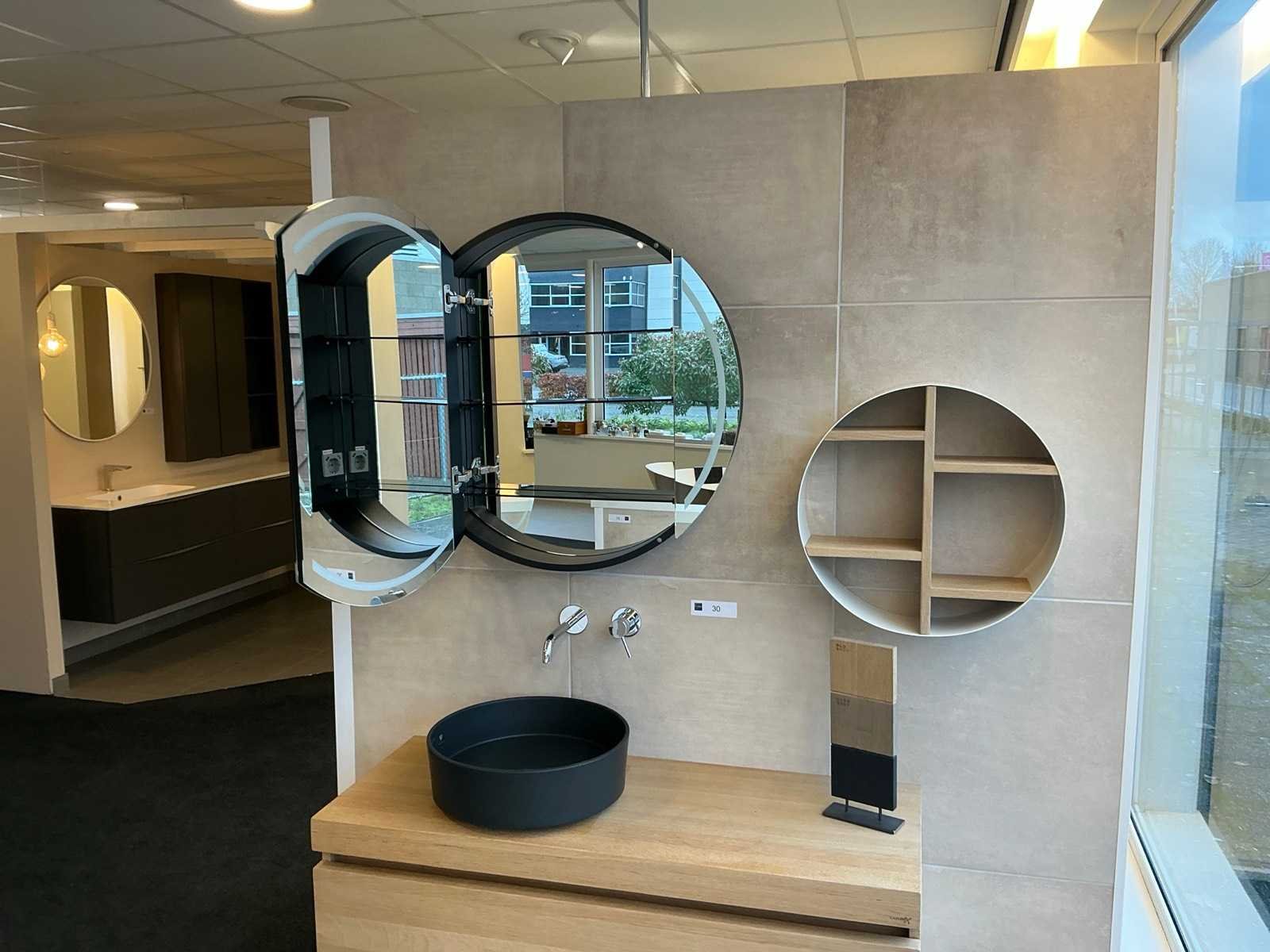 Bestaande uit een Hipp Spiegelkast met verlichting 80cm, Laufen Kartell waskom 42x42x12cm, Lagoo Garda wastafelkraan opbouwdeel zonder inbouwgedeelte, Meubelset 120cm Wooden drawer box 120x45cm met 1 greeploze lade, Looox Wooden Box Round 50cm. Merk: Looox
