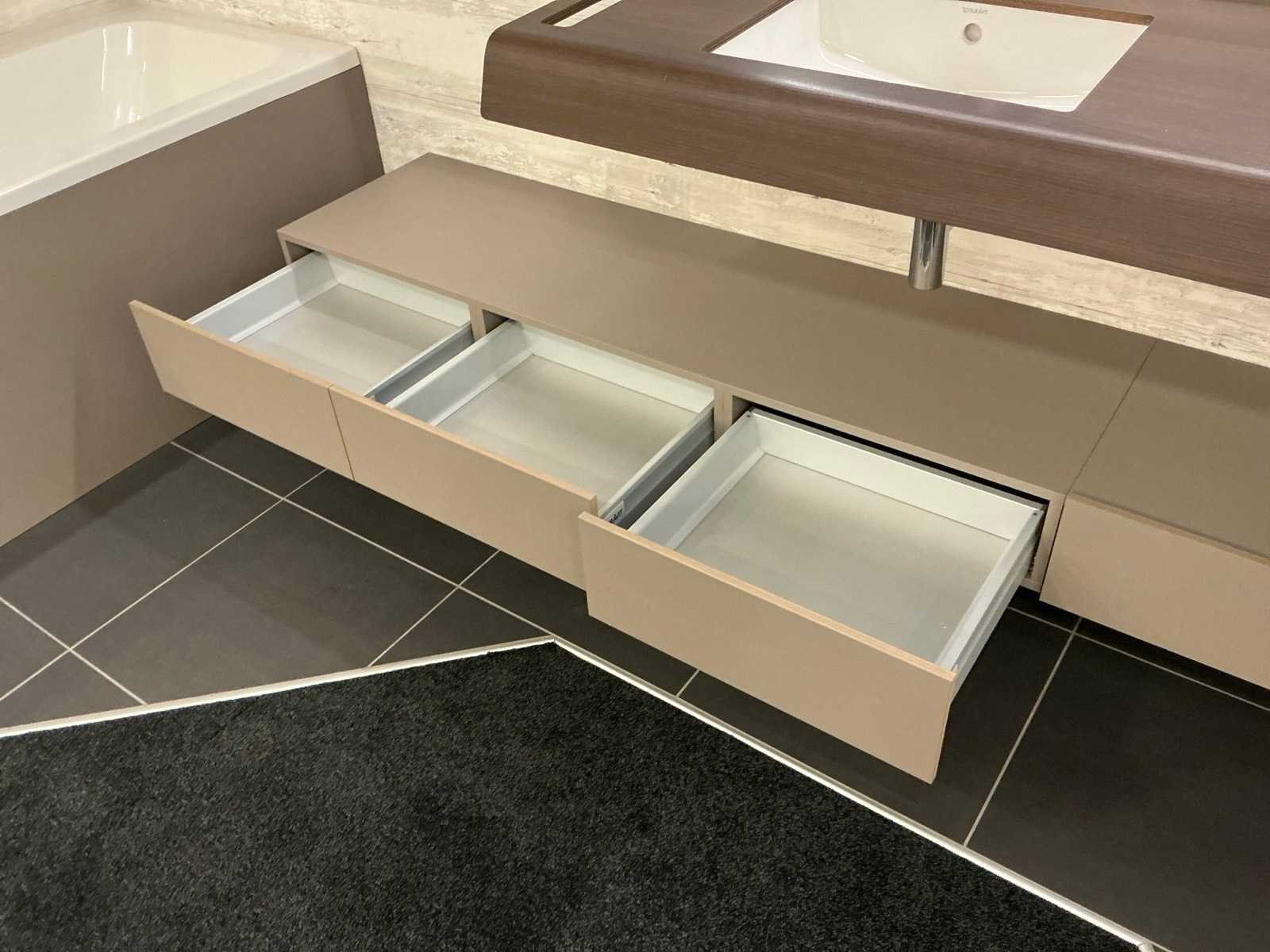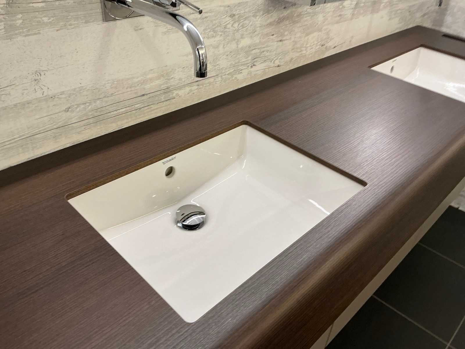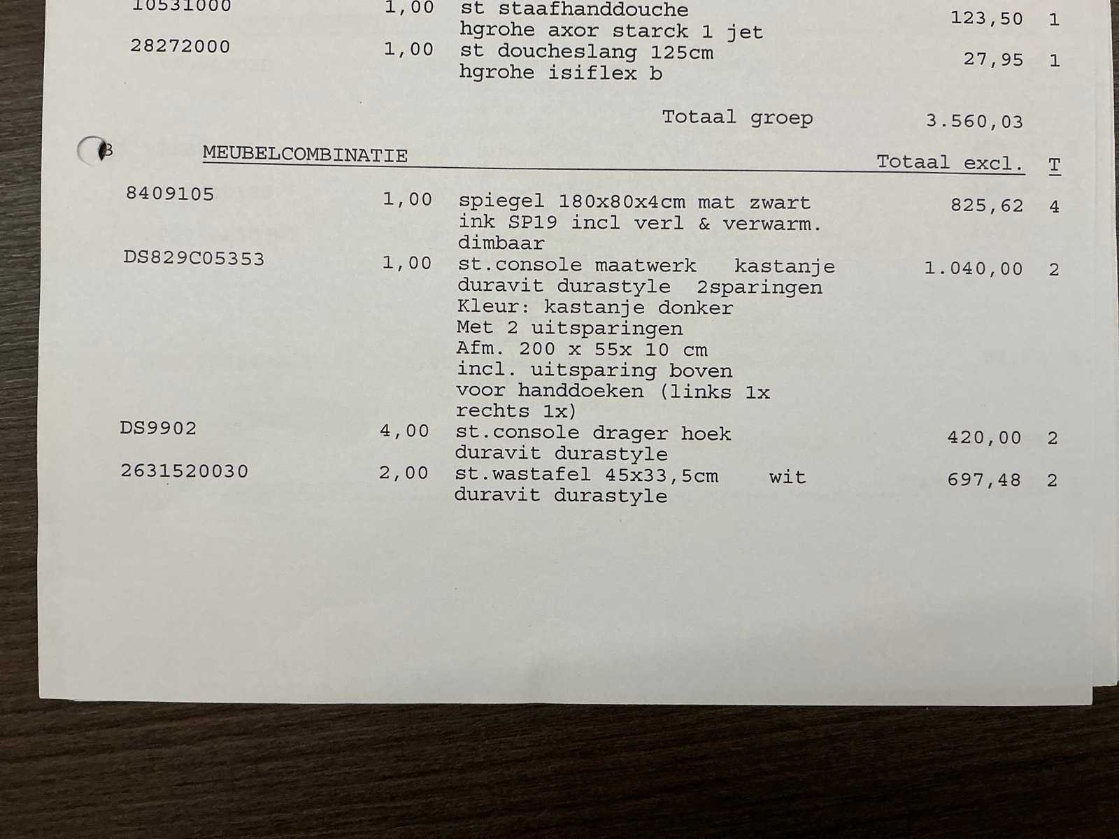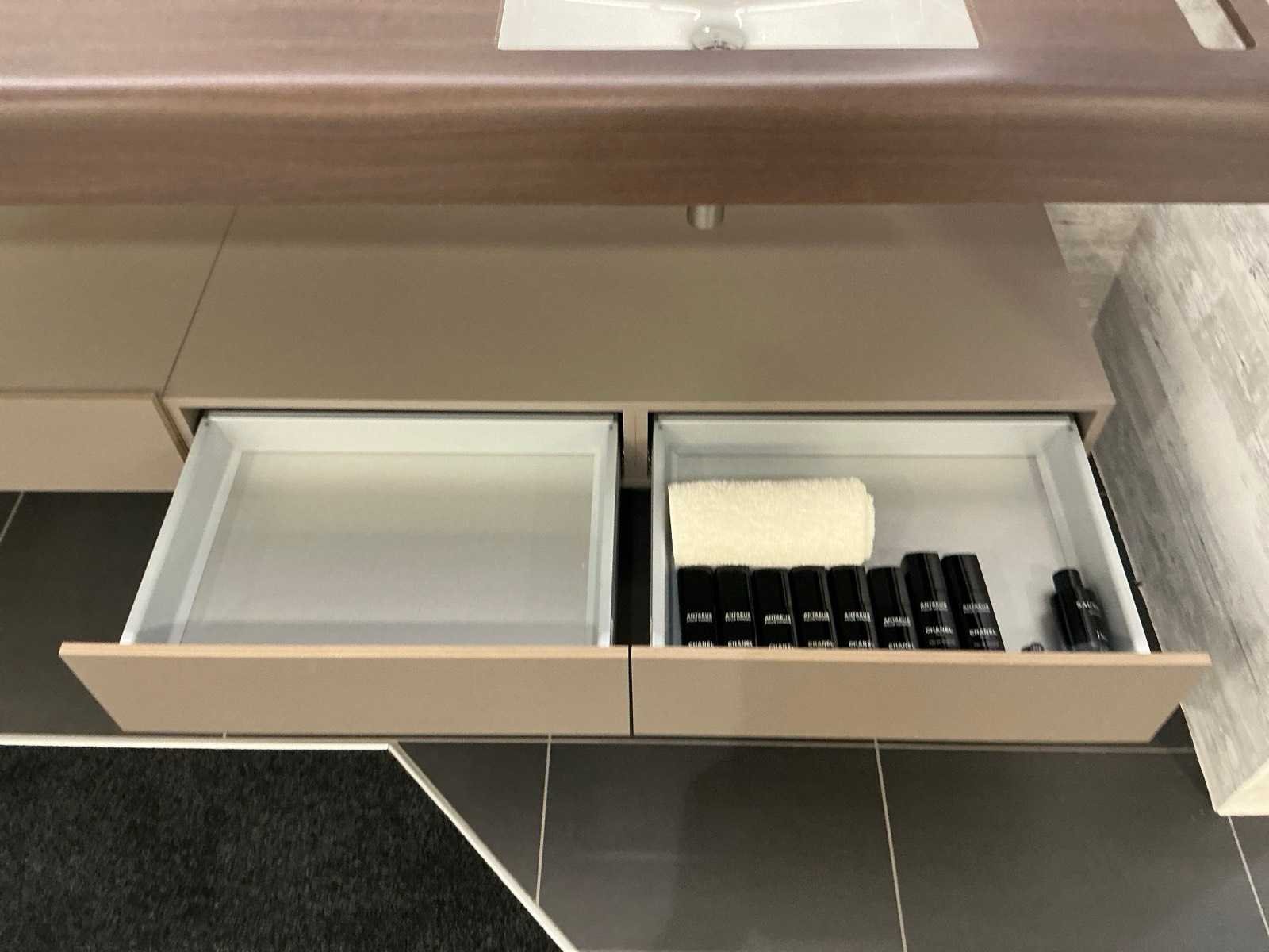 Bestaande uit een spiegel 180x80x4 mat zwart met verwarming en dimbare verlichting, maatwerk kastje donker (2 deuken) met 2 uitsparingen (200x55x10cm), 2x wastafel 45x33,5cm, 2x Onto Basalt onderkast (100x44cm en 150x44cm), 2x afbouwset Hansgröhe wandmengkraan zonder inbouwgedeelte. Merk: Duravit Model: Durastyle