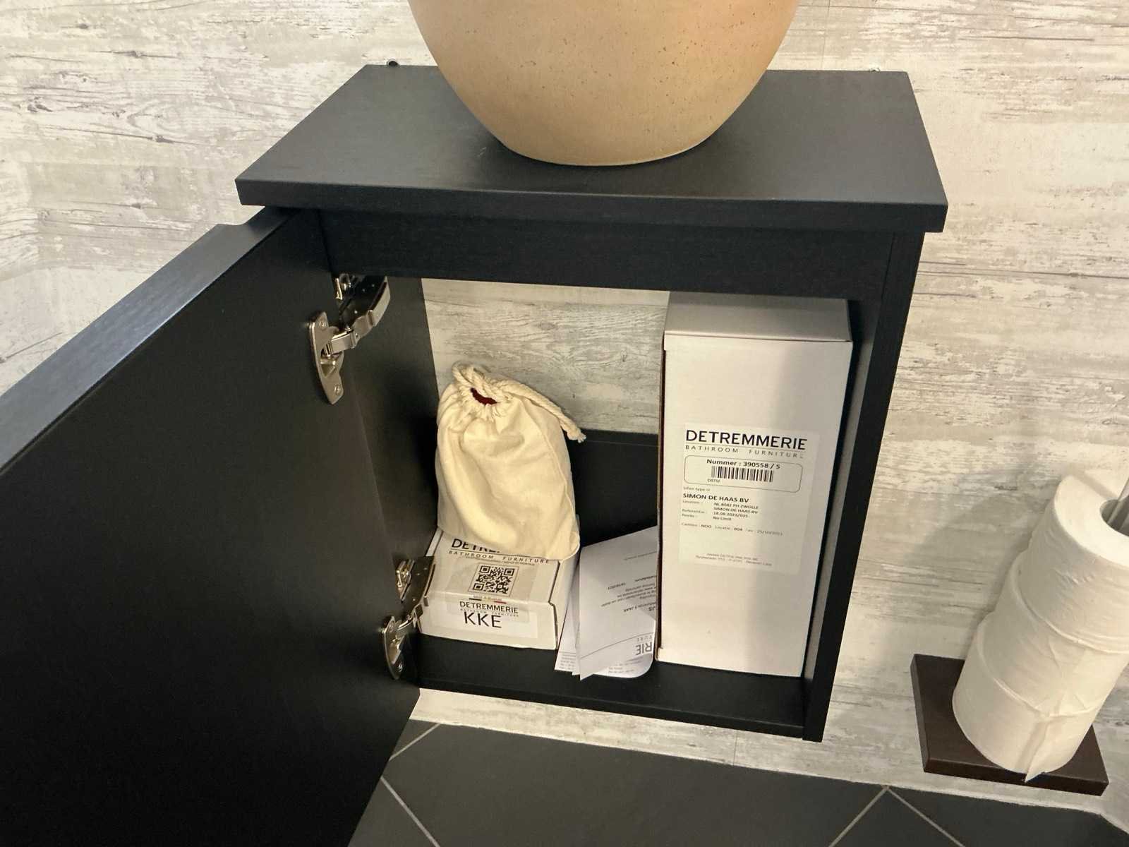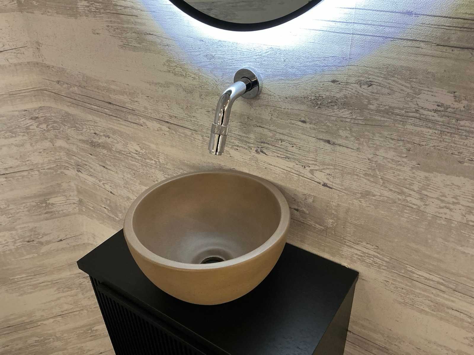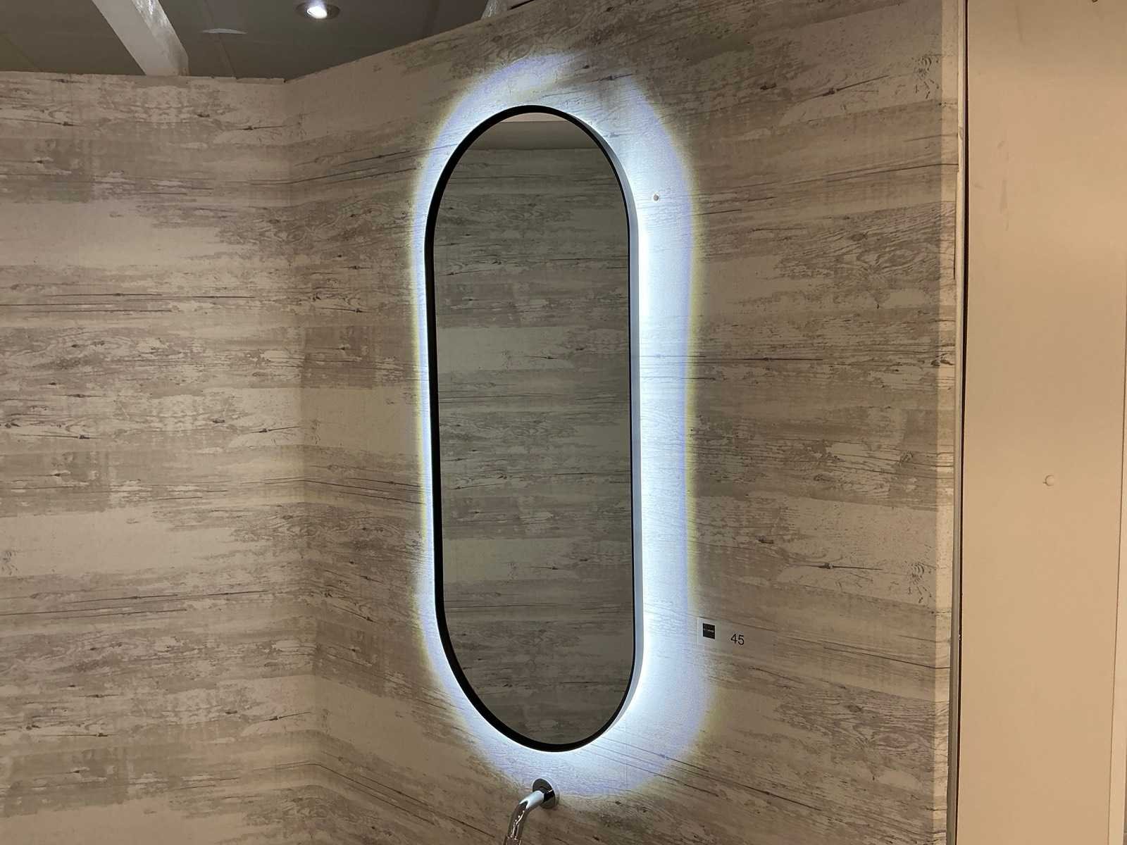Bestaande uit een ovalen spiegel (90x38x4cm) met sensor en verlichting, No Limit waskom 24x13cm, donker Eiken onderkast 40x20x50cm, opbouwgedeelte wandfonteinkraan 9cm zonder inbouwgedeelte. Merk: Detremmerie Model: Design