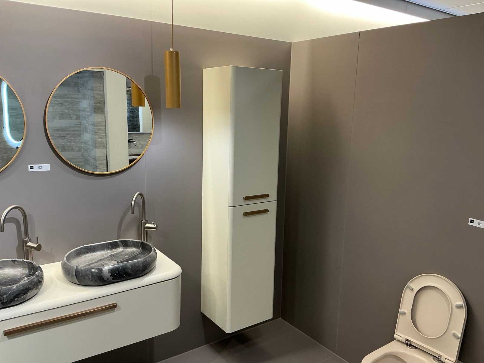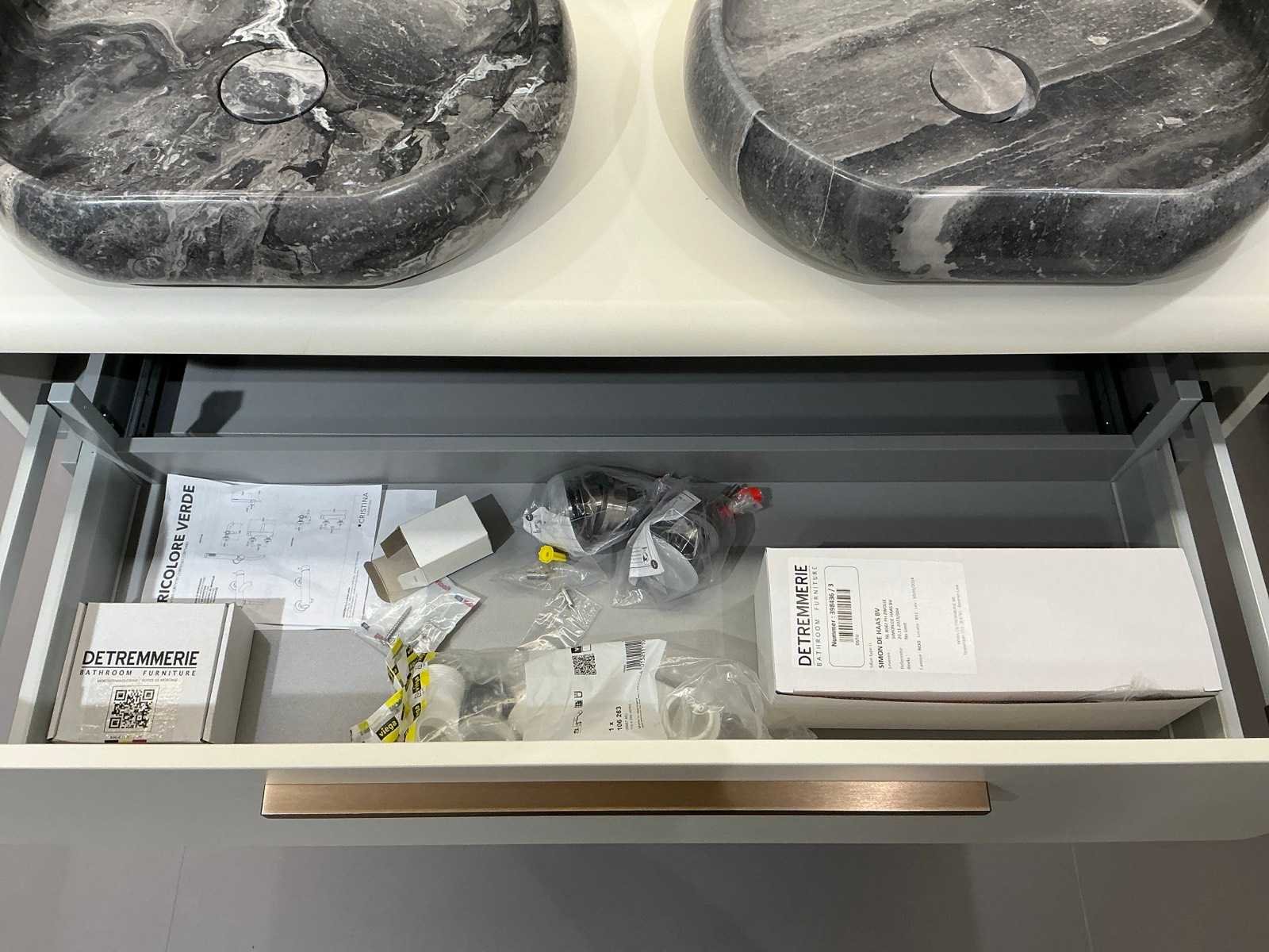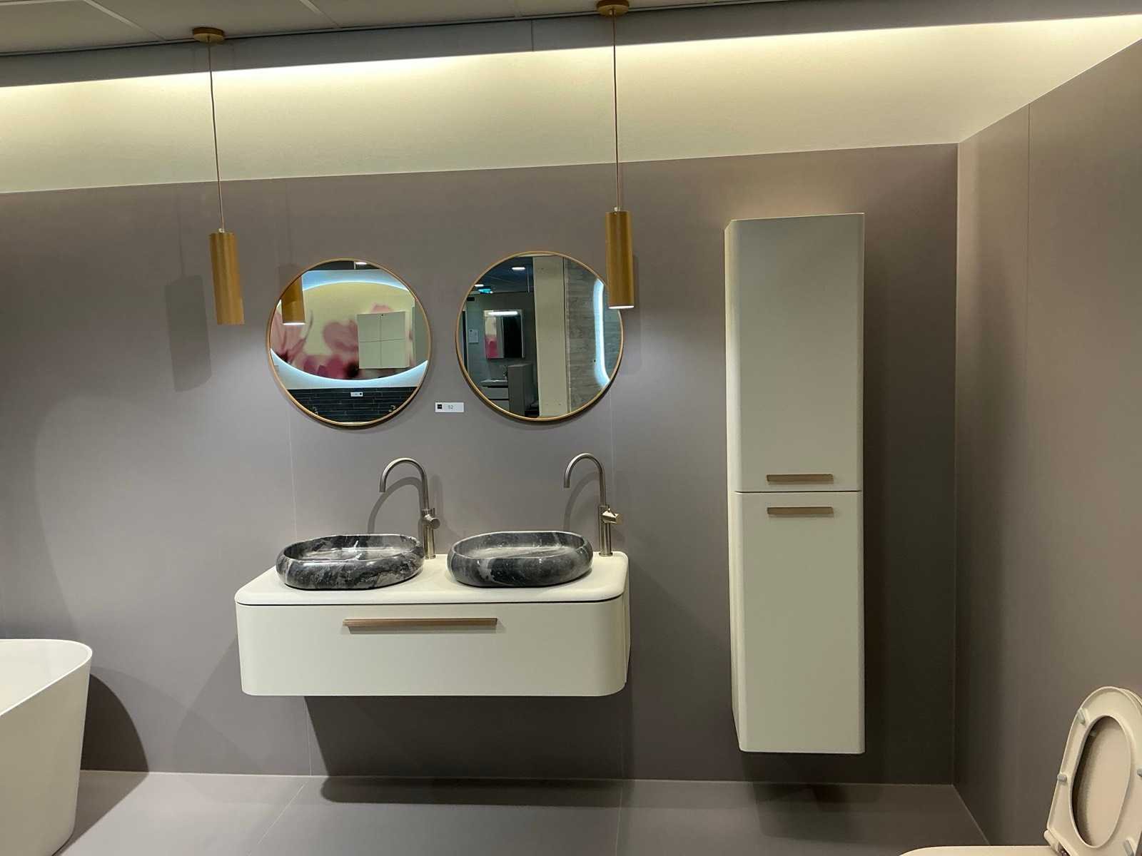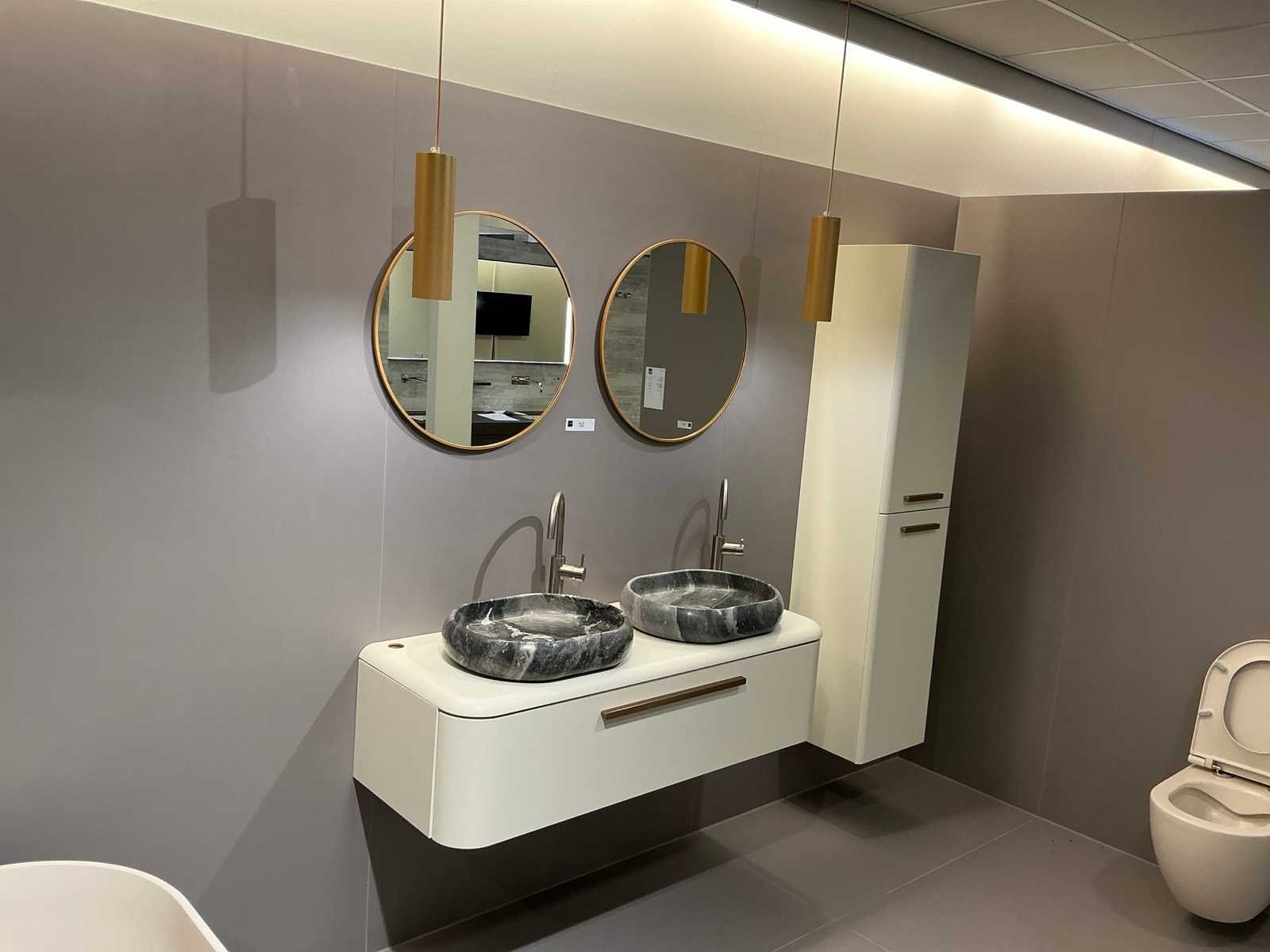 Bestaande uit 2x spiegel Design rond 60cm, 2x waskom ovaal 50cm marmer silver, onderkast ROP50 130x50x48cm kleur rak1013 Parelwit, afdekplaat 130cm, hoge kast 172x35cm voorzien van 4 glazen planchettes , 2 Christina tricolore kranen 38,4cm, 2 LED plafondlampen. Merk: Detremmerie Model: Round