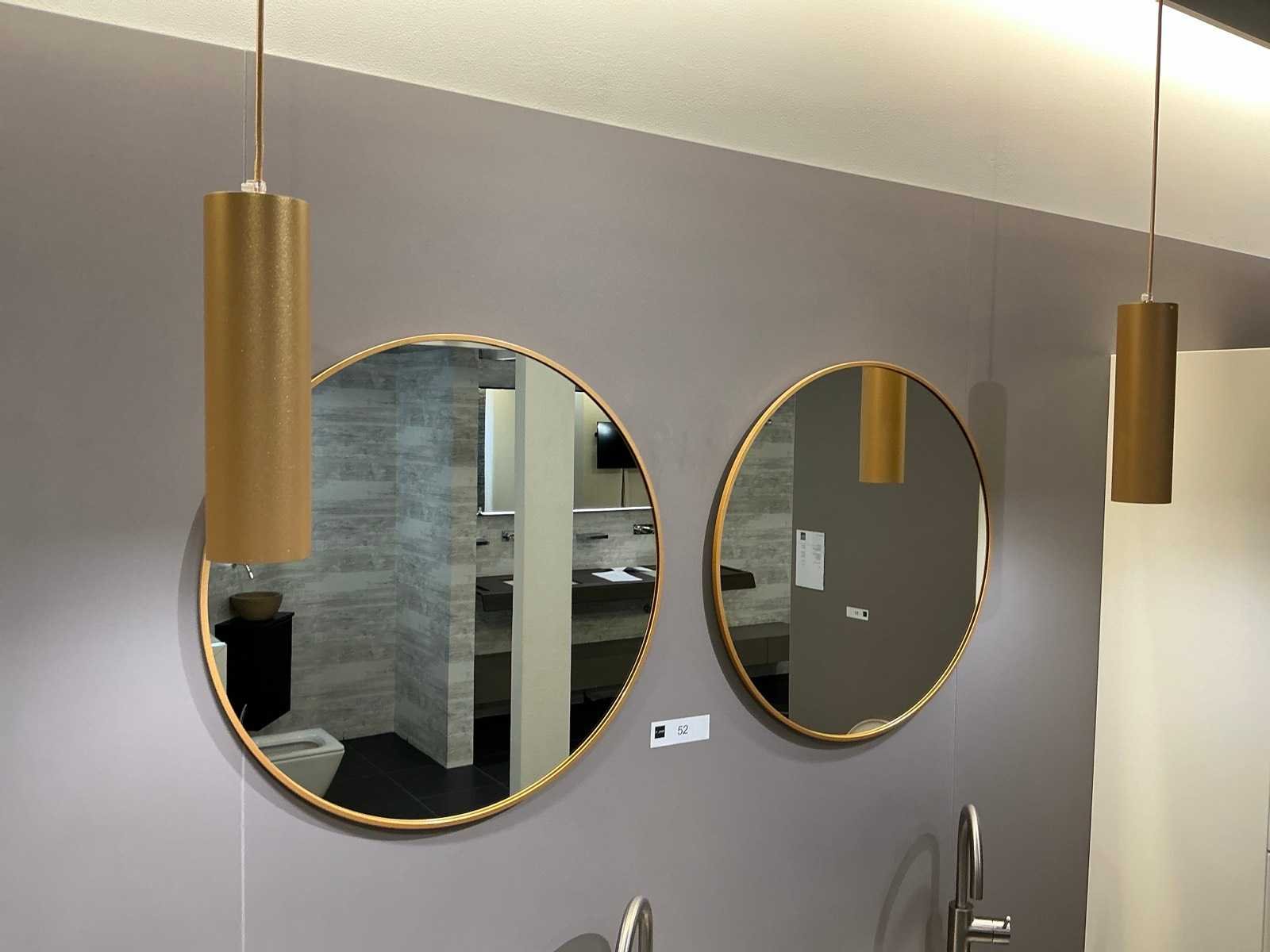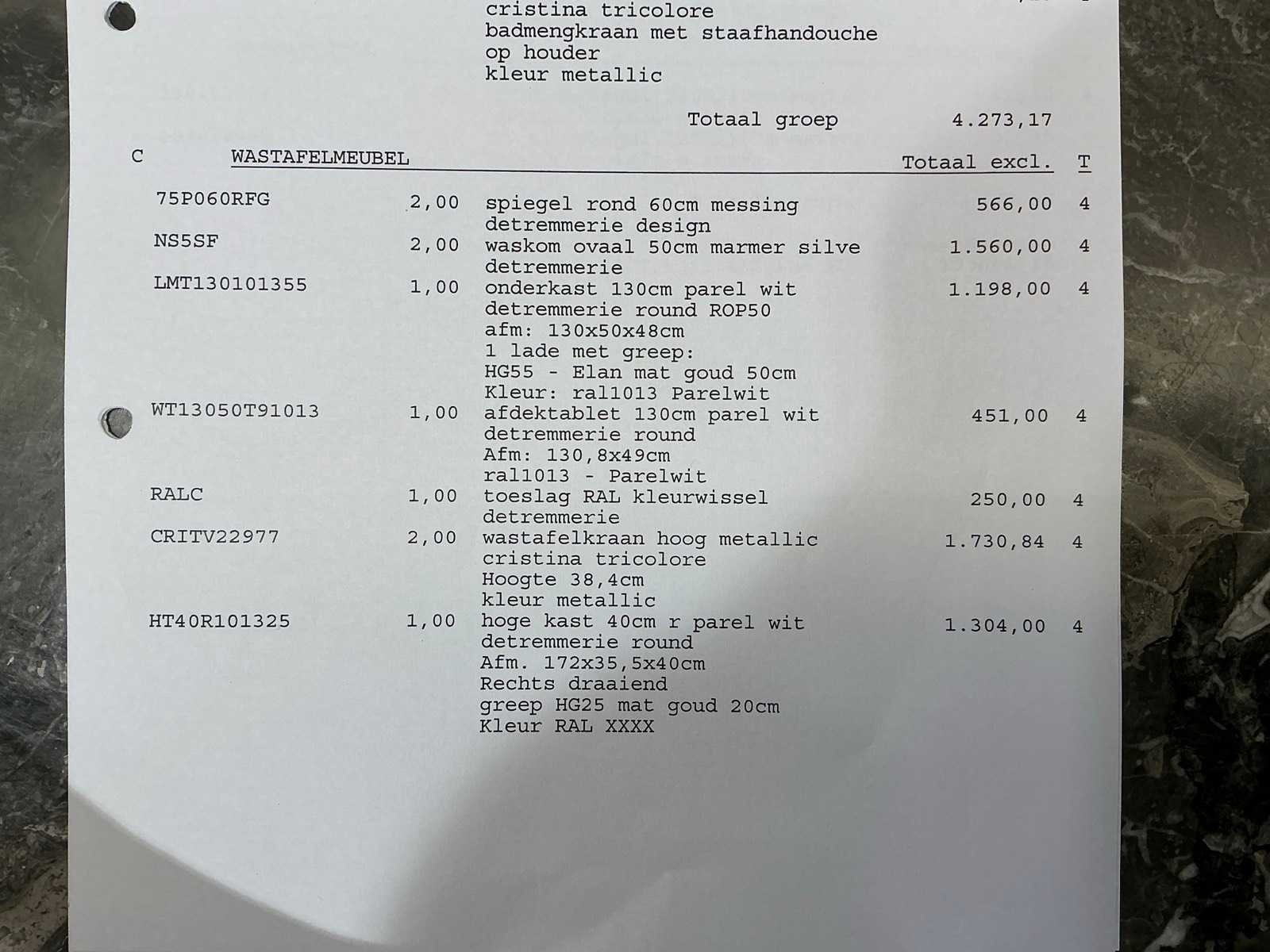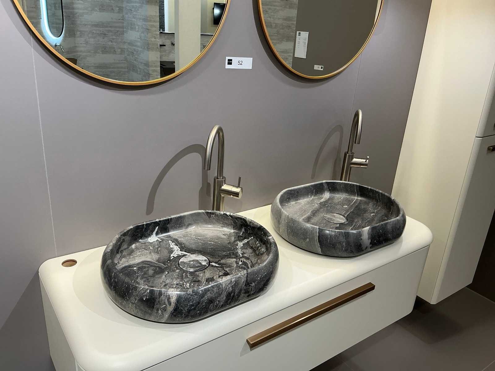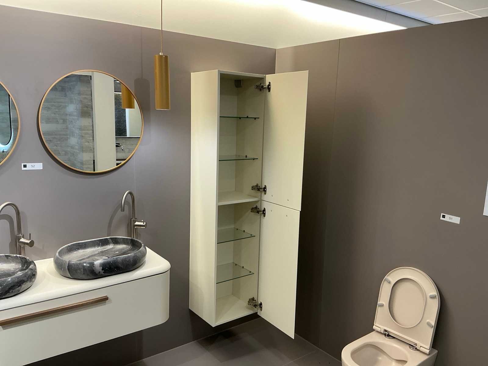 Bestaande uit 2x spiegel Design rond 60cm, 2x waskom ovaal 50cm marmer silver, onderkast ROP50 130x50x48cm kleur rak1013 Parelwit, afdekplaat 130cm, hoge kast 172x35cm voorzien van 4 glazen planchettes , 2 Christina tricolore kranen 38,4cm, 2 LED plafondlampen. Merk: Detremmerie Model: Round