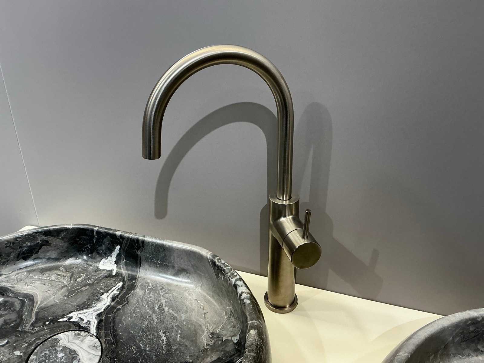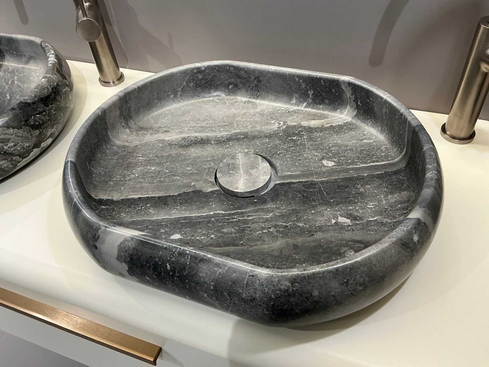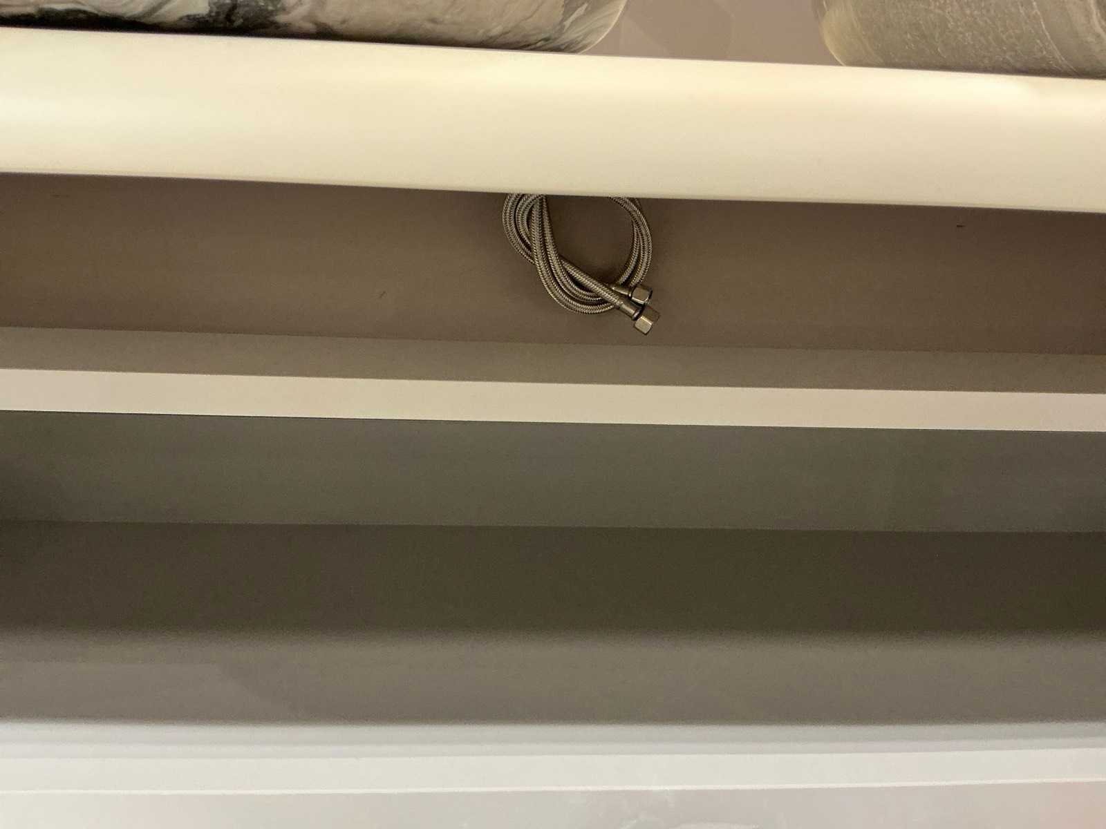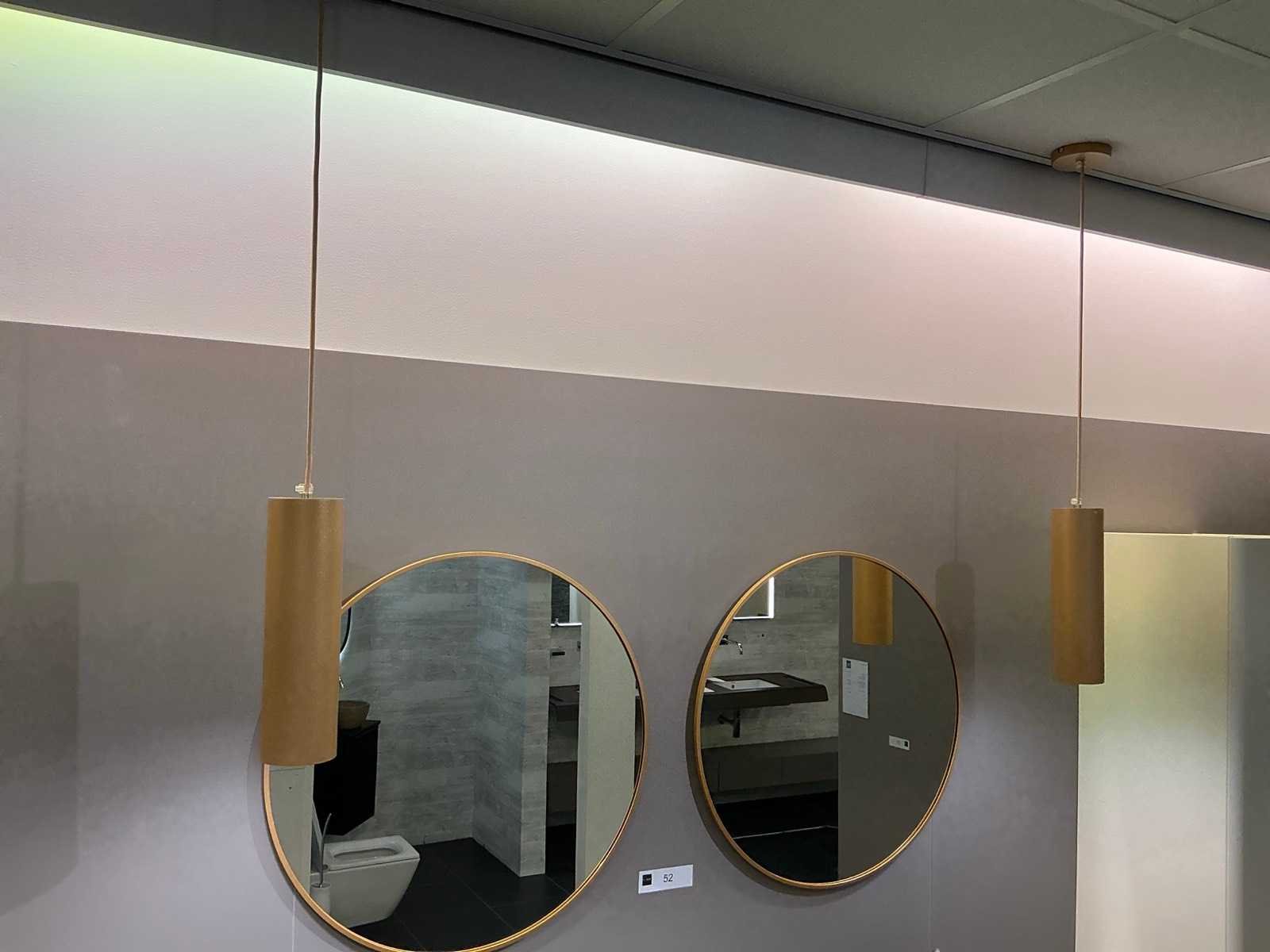 Bestaande uit 2x spiegel Design rond 60cm, 2x waskom ovaal 50cm marmer silver, onderkast ROP50 130x50x48cm kleur rak1013 Parelwit, afdekplaat 130cm, hoge kast 172x35cm voorzien van 4 glazen planchettes , 2 Christina tricolore kranen 38,4cm, 2 LED plafondlampen. Merk: Detremmerie Model: Round