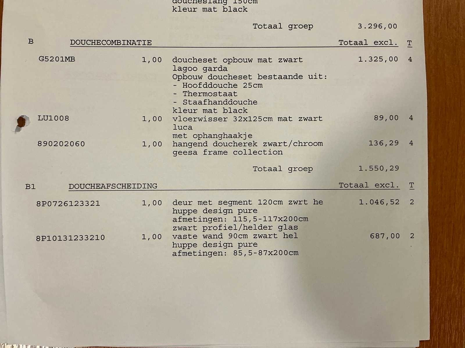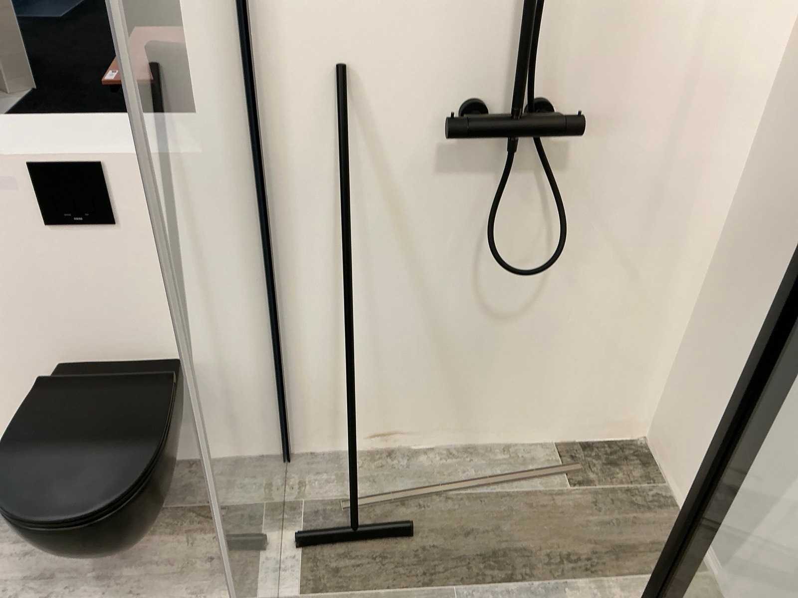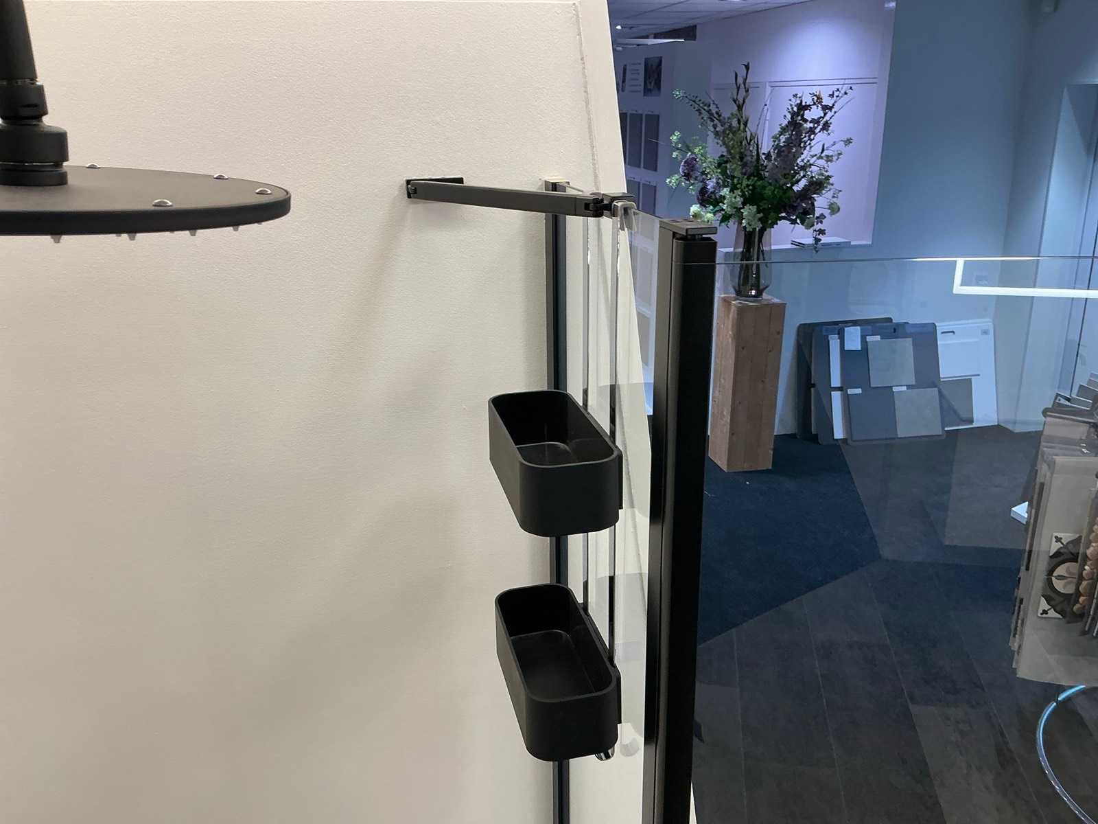 Voorzien van Segment met deur 115,5-117x200cm, vaste wand 90cm zwart hel 85,5-87x200cm, Lagoo Garda opbouwdoucheset zonder binnenwerk met hoofddouche, thermostaat en staafhanddouche, vloerwisser, hangend doucherek Merk: Huppe Model: Design Pure
