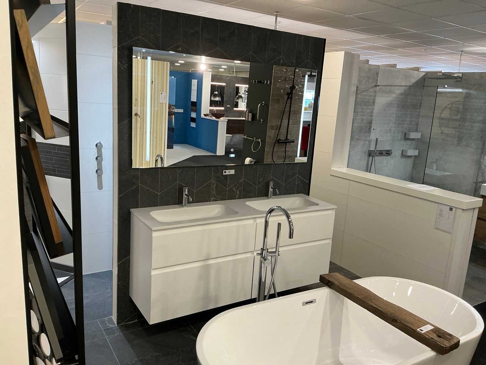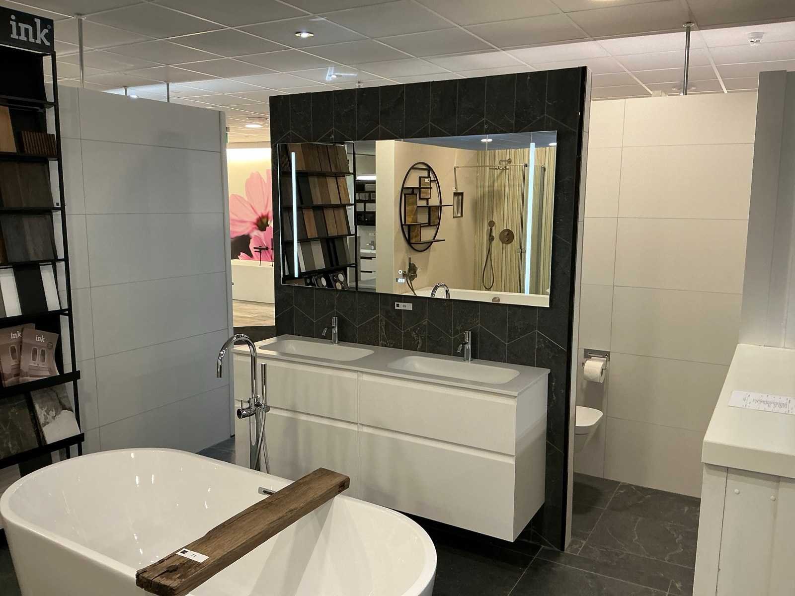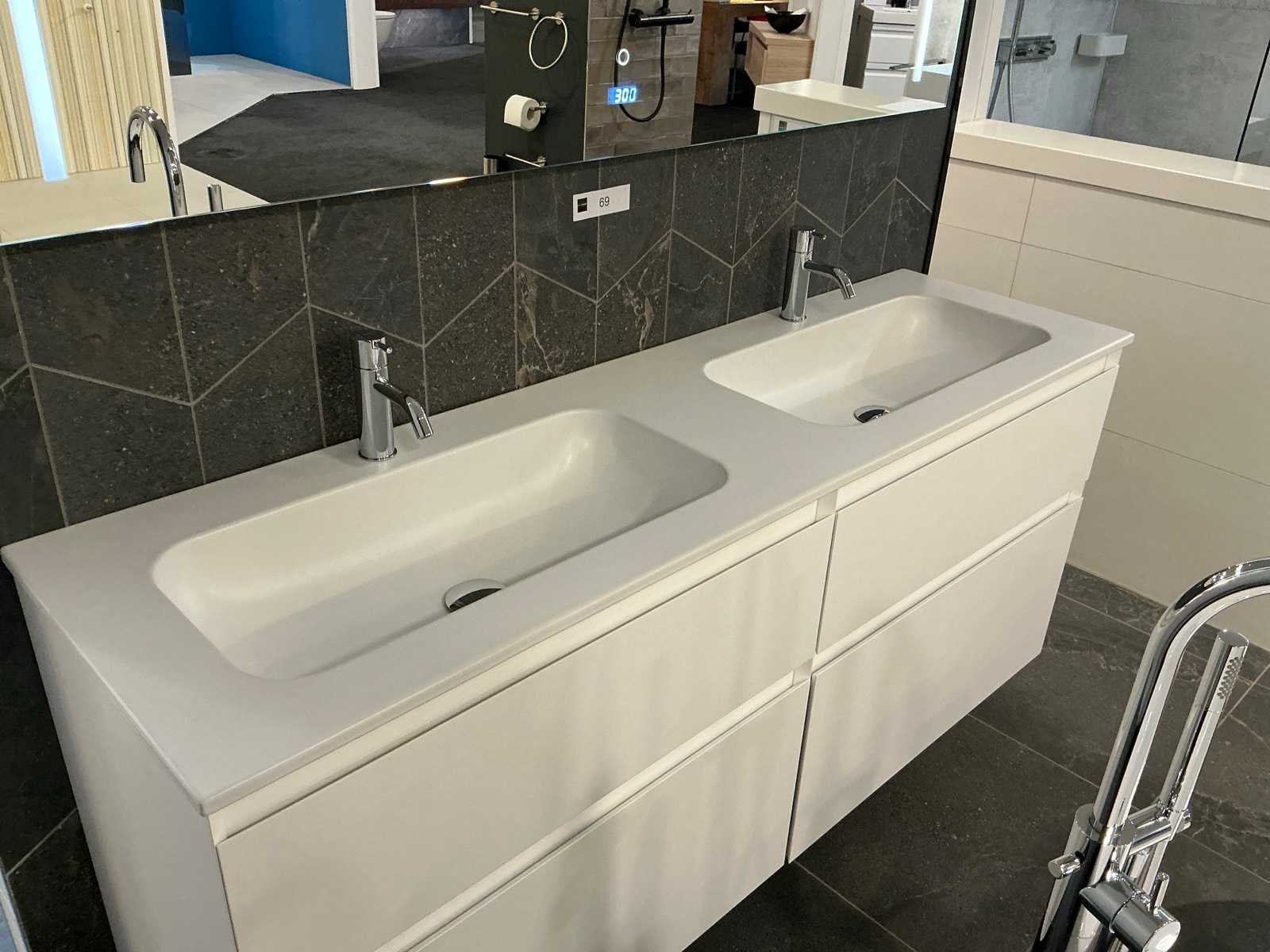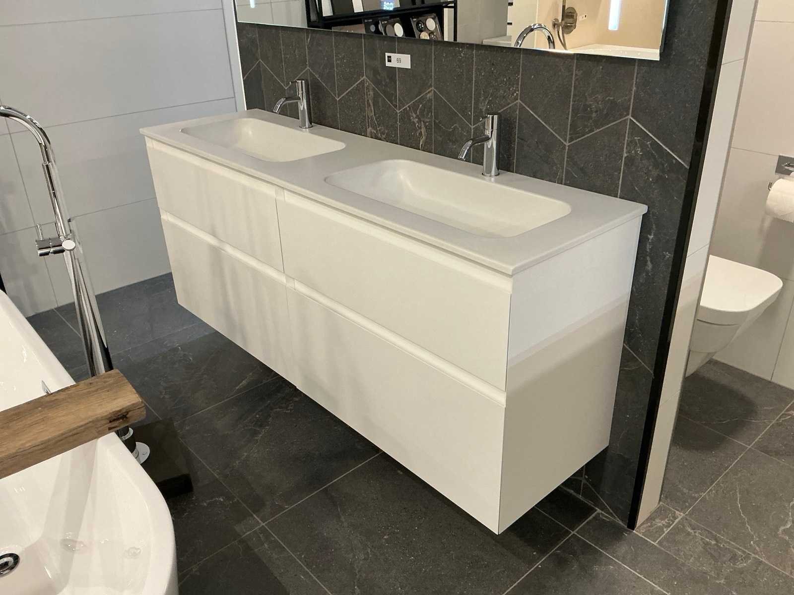 Bestaande uit een maatwerj Hipp SPM5100 spiegel met verlichting en digitale klok (160x80cm), duowastafel 160cm mat wit, 2x onderkast wit 80x45x65cm voorzien van 2 a-symmetrische greeploze lades. Merk: Sanibell Model: Ink