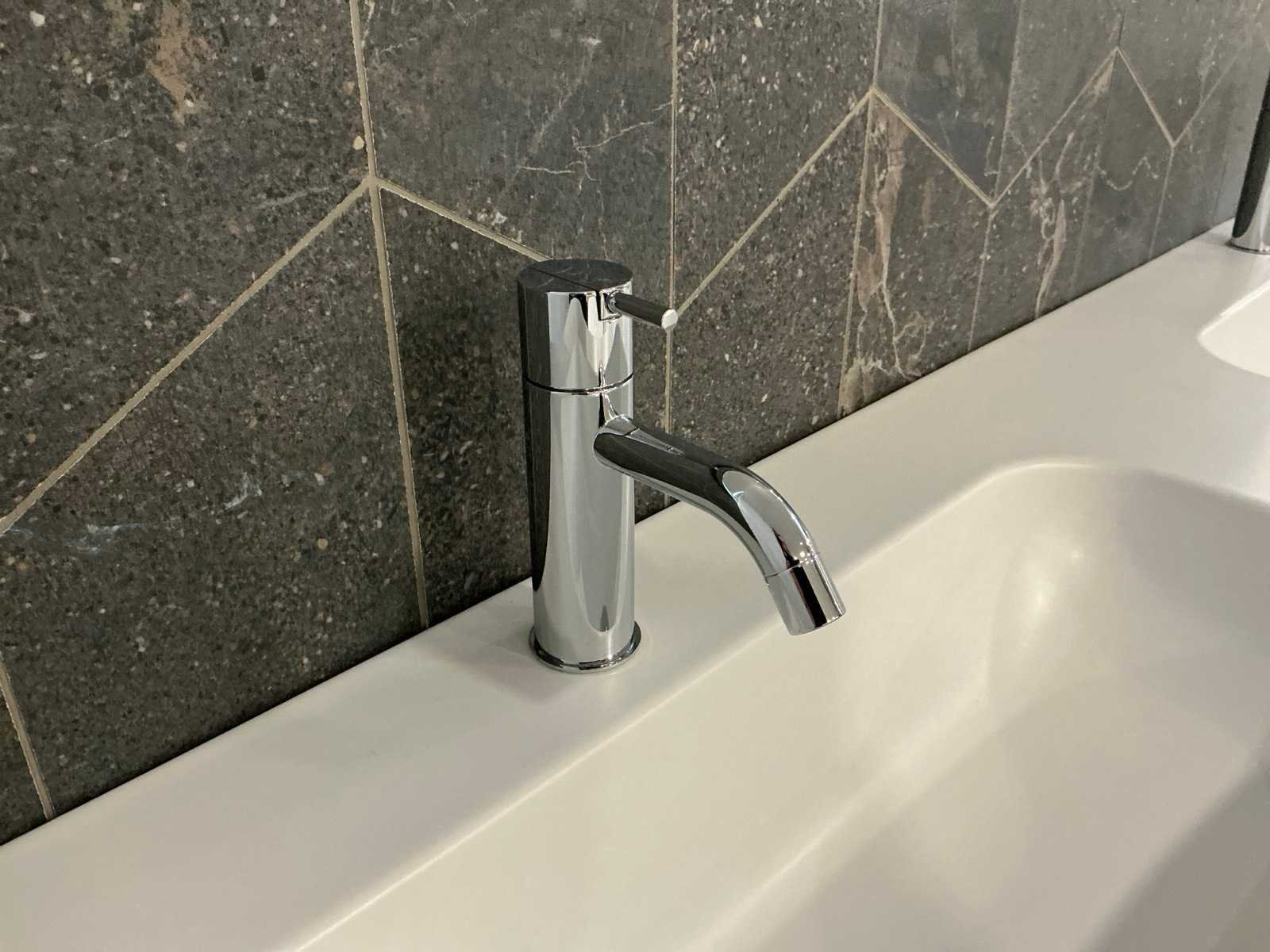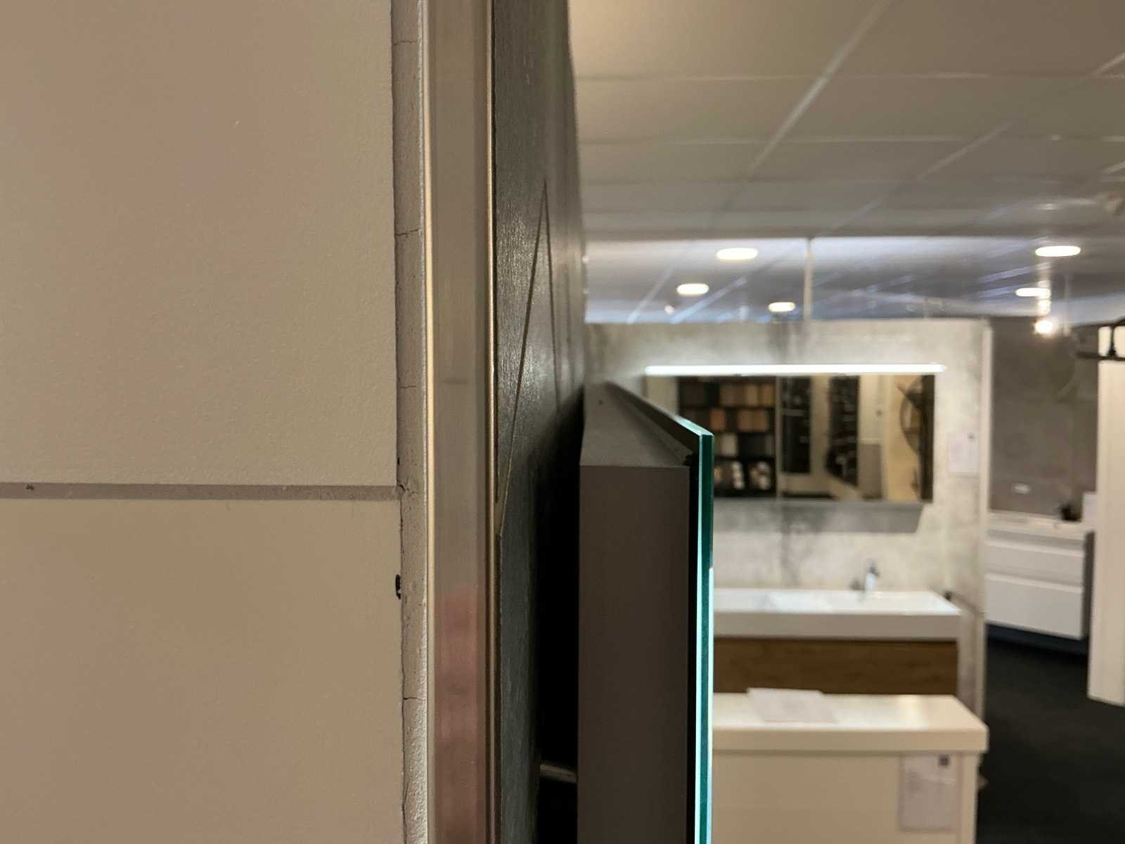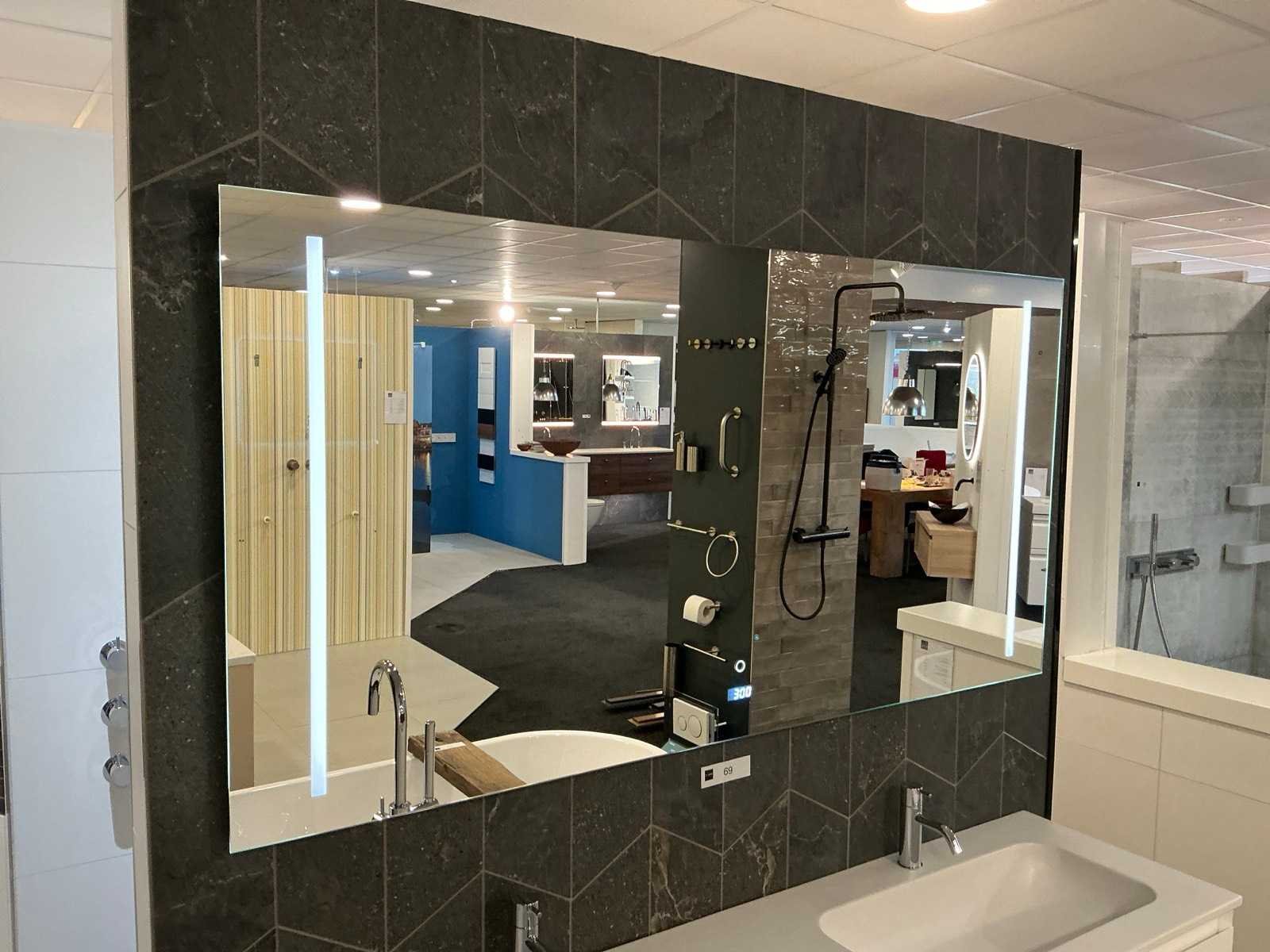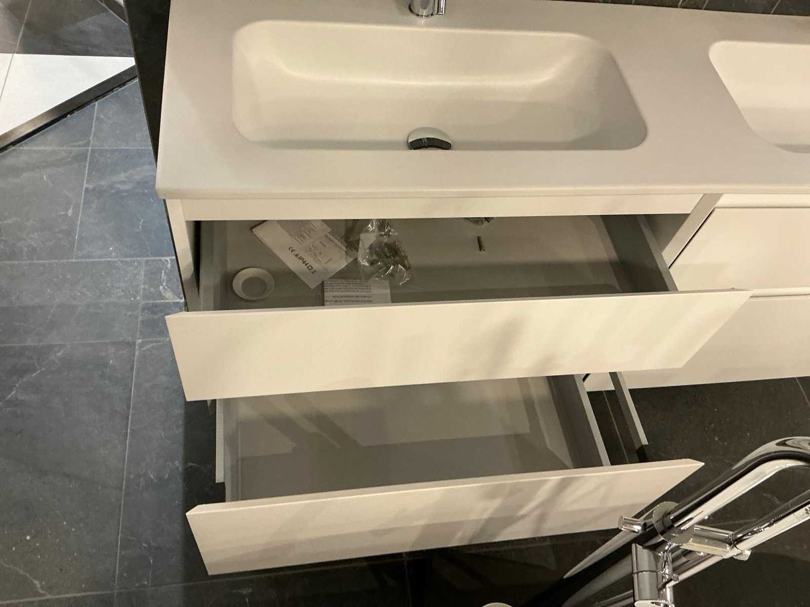 Bestaande uit een maatwerj Hipp SPM5100 spiegel met verlichting en digitale klok (160x80cm), duowastafel 160cm mat wit, 2x onderkast wit 80x45x65cm voorzien van 2 a-symmetrische greeploze lades. Merk: Sanibell Model: Ink