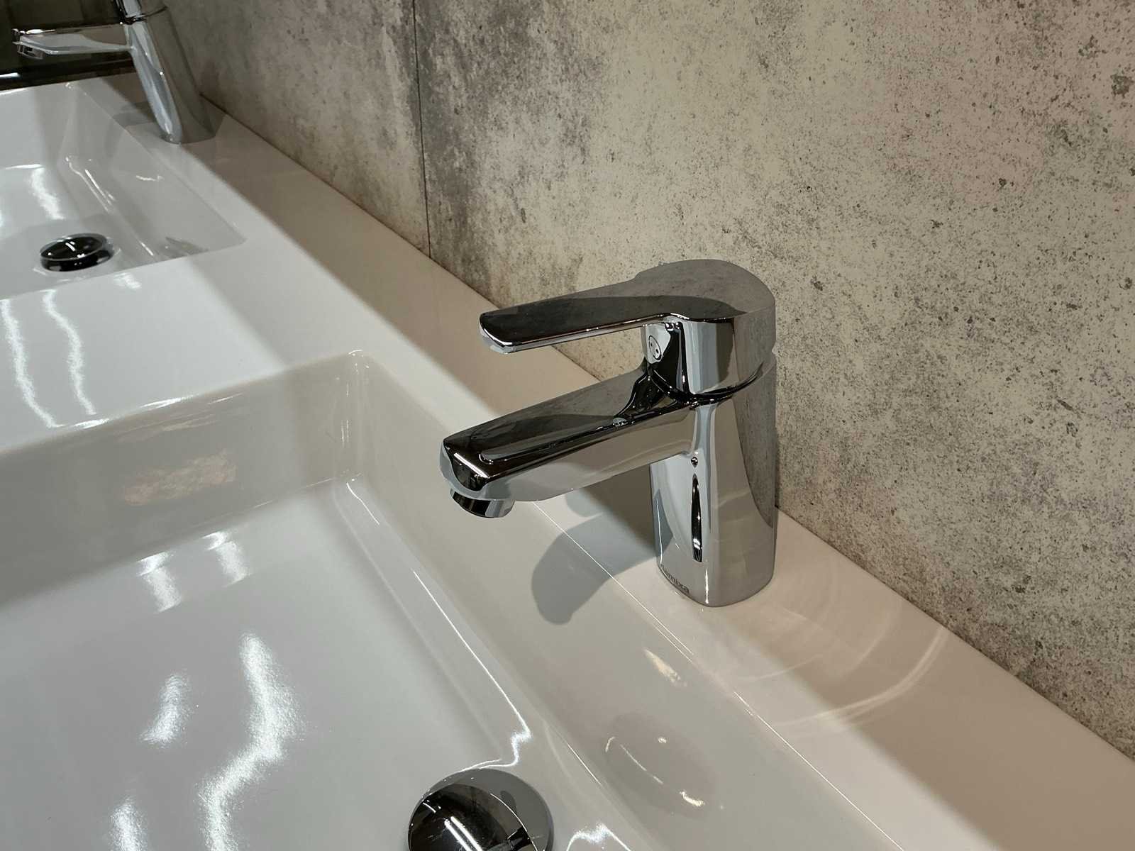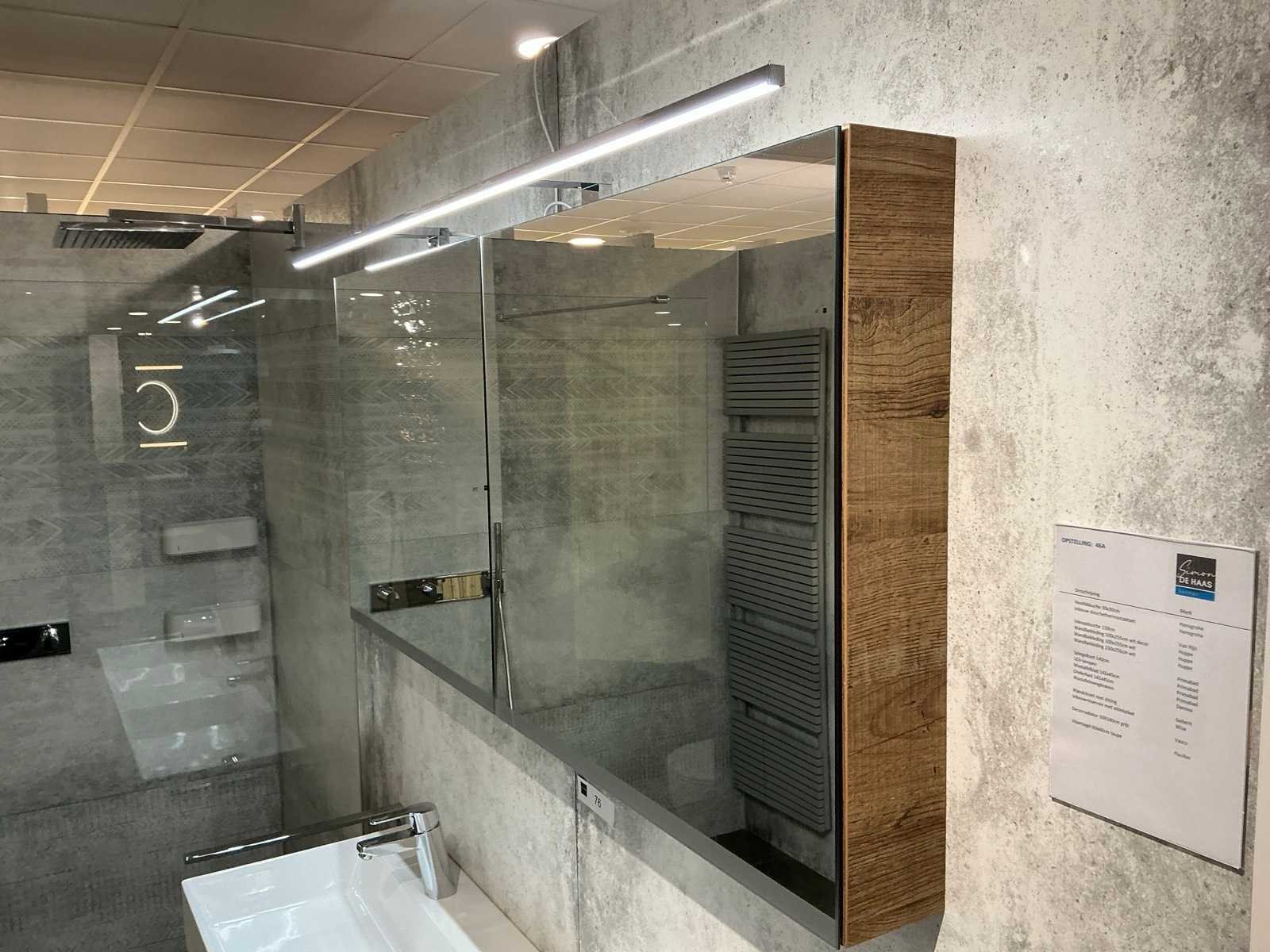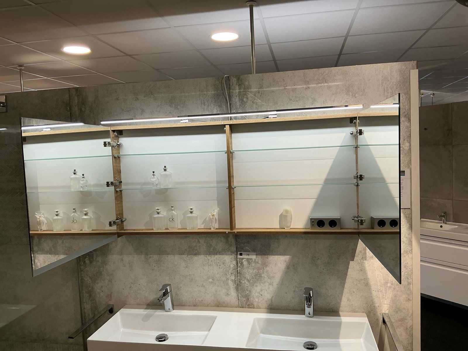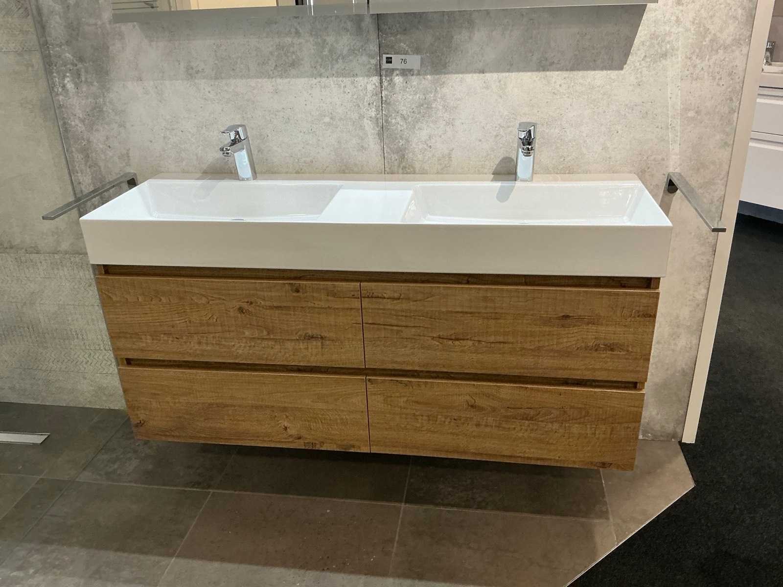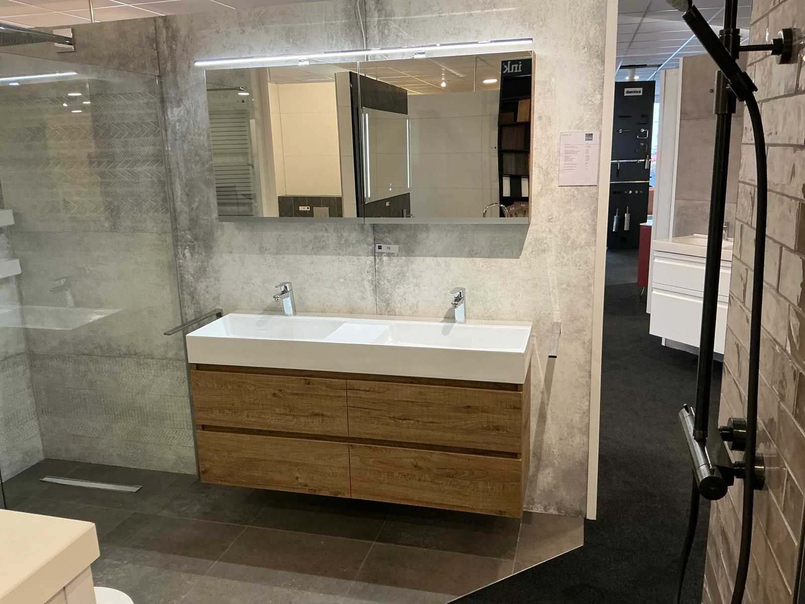 Bestaande uit een spiegelkast Sherwood) met opbouwlamp (140x12x65cm), duowastafel 142cm wit, onderkast (Sherwood) 141x45x56cm met 4 greeploze lades, 2x Damixa Pine wastafelmengkraan. Merk: Primabad Model: Blend