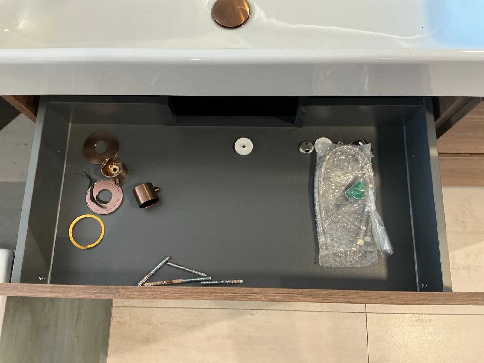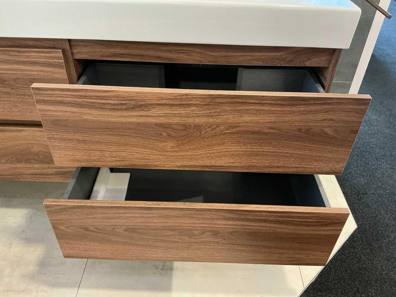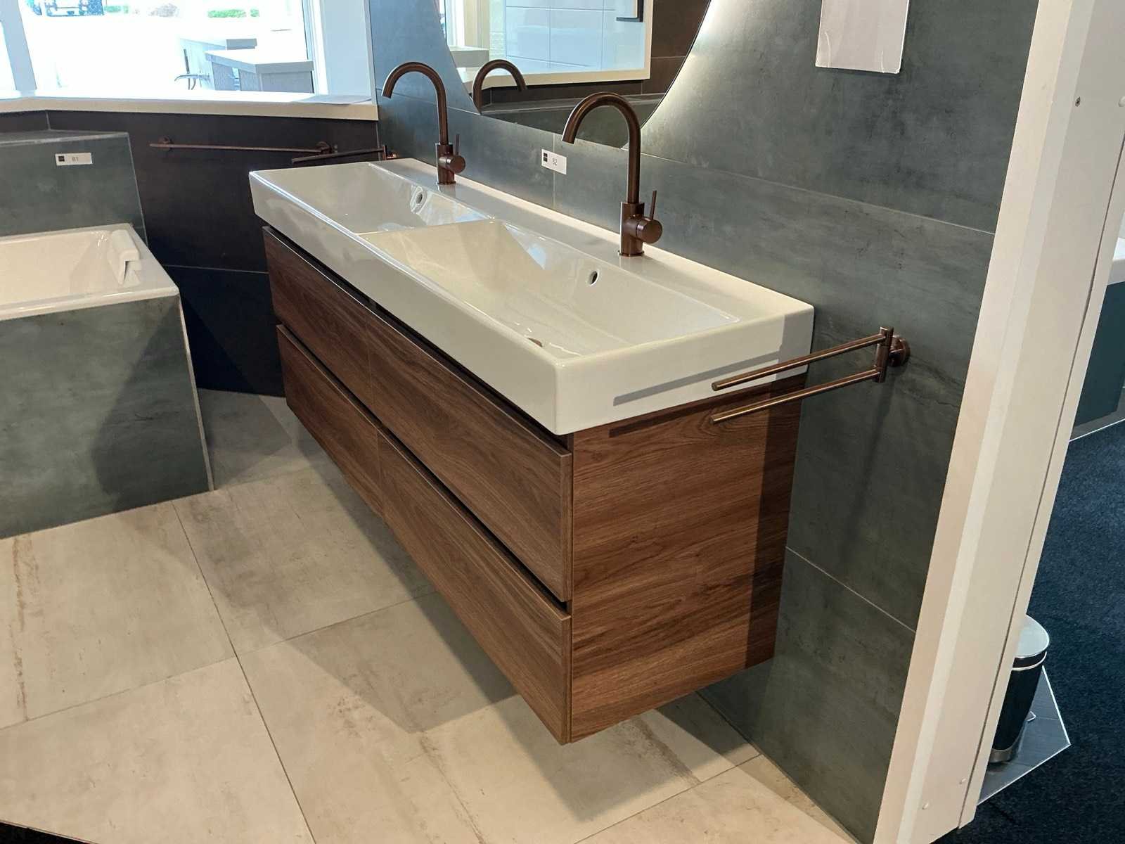 Bestaande uit een Coast duowastafel (160x45x11cm), 2x Coast onderkast (80x45x56cm) kleur Charleston Oak M16 met 2 laden symmetrisch, 2x Lagoo Garda wastafelmengkraan en 2 handiekrekjes.Zonder los verkavelde spiegel ( kavel 737) Merk: Primabad Model: Coast