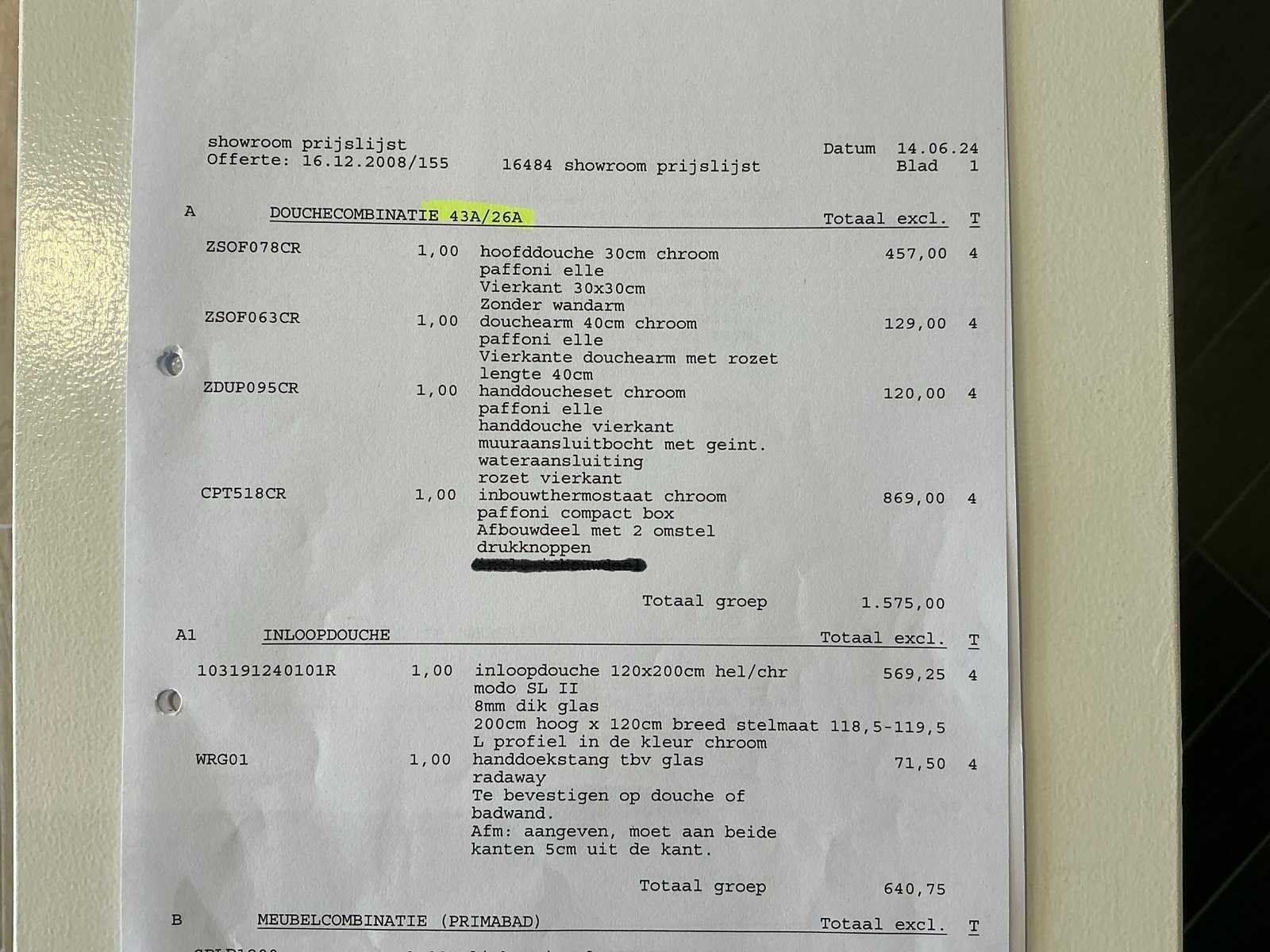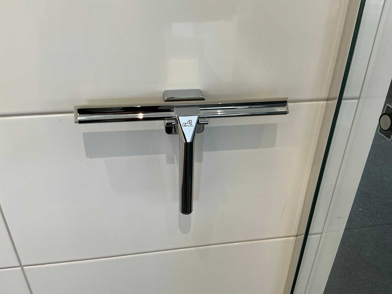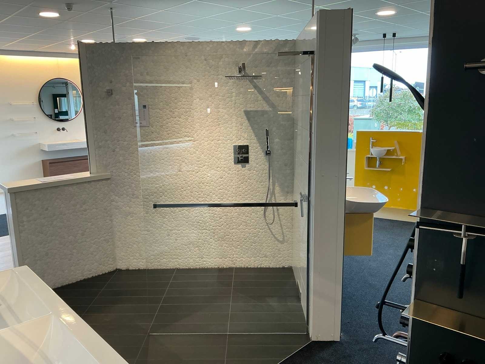 Bestaande uit een inloopdouchewand 120x209cm 8mm dik glas voorzien van handdoekstang, Paffoni (afbouwonderdelen)hoofddouche 30x30cm, handdouche en thermostaat zonder inbouwgedeeltes Merk: Modo Model: SL II