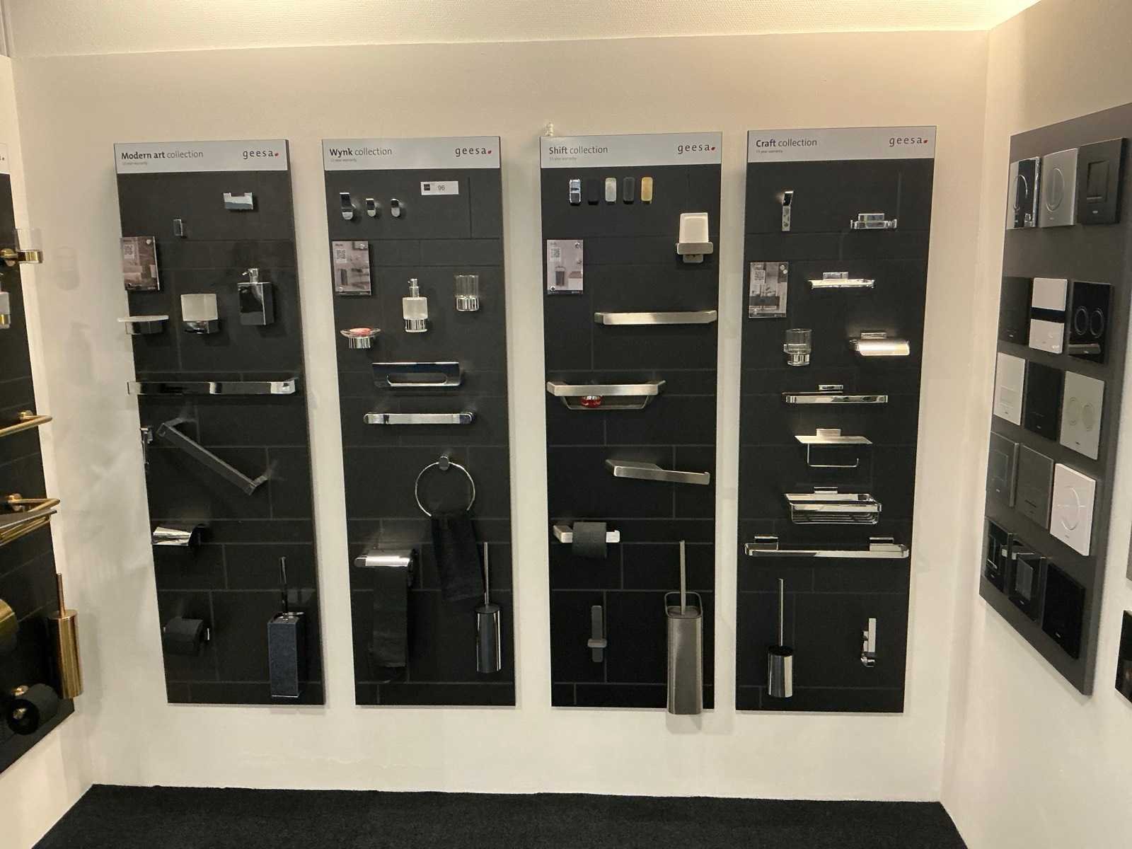 Bestaande uit 9 wandpanelen met Geesa en Wisa Sanitair accessoires, sommige zoals de bedieningspanelen voor toiletten zijn dummy’s. Dit kavel dient schoon en leeg opgeleverd te worden.