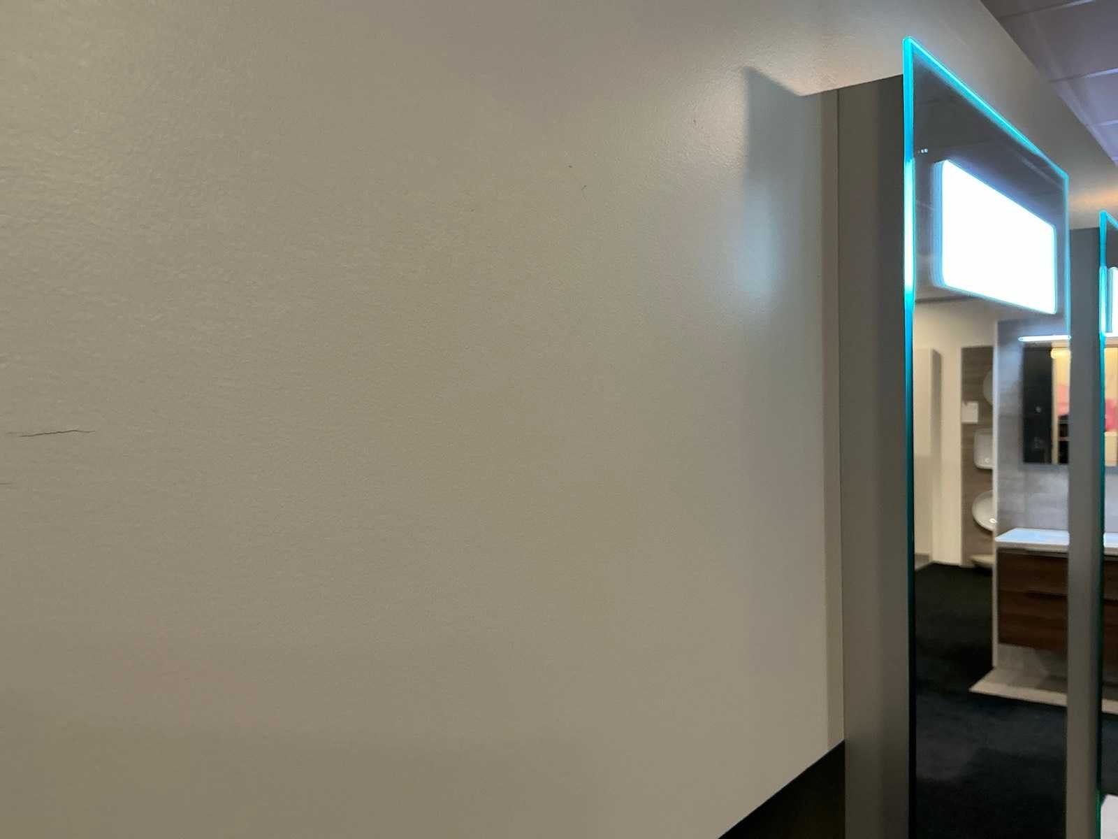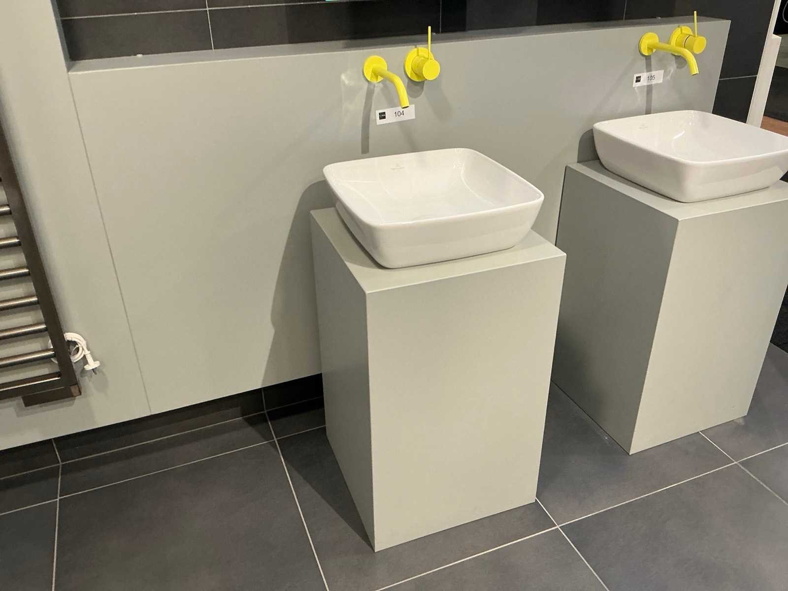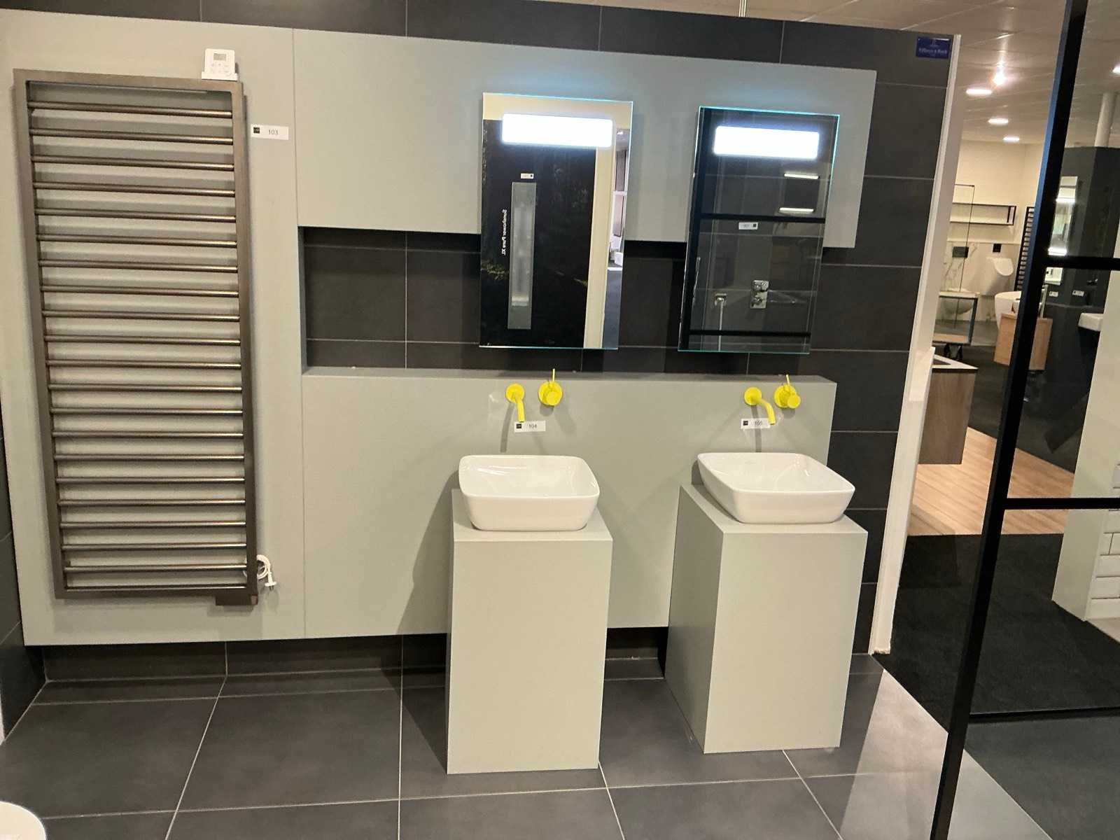 Bestaande uit More to See spiegel met verlichting 45x75cm, 41cm opzetwastafel op losstaande pilaar, afbouwdeel Dornbracht eengreepsinbouwkraan en wandmengkraan zonder inbouwgedeelte Merk: Villeroy&Boch Model: Artis