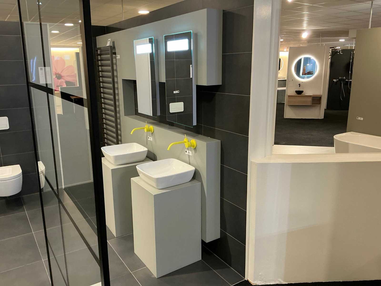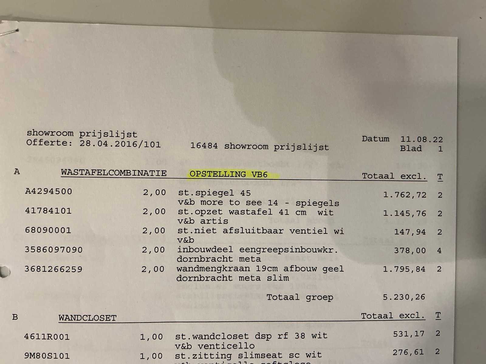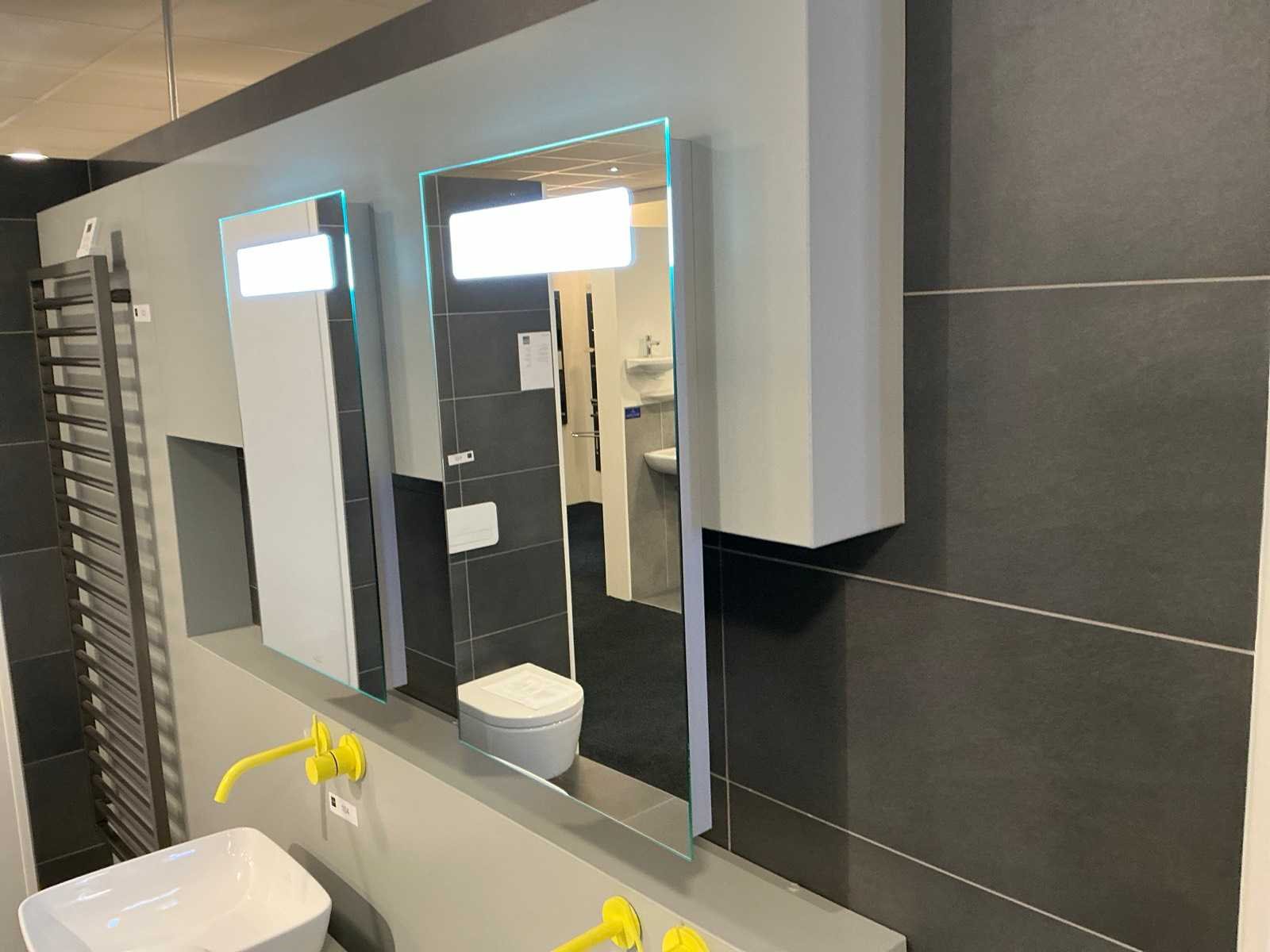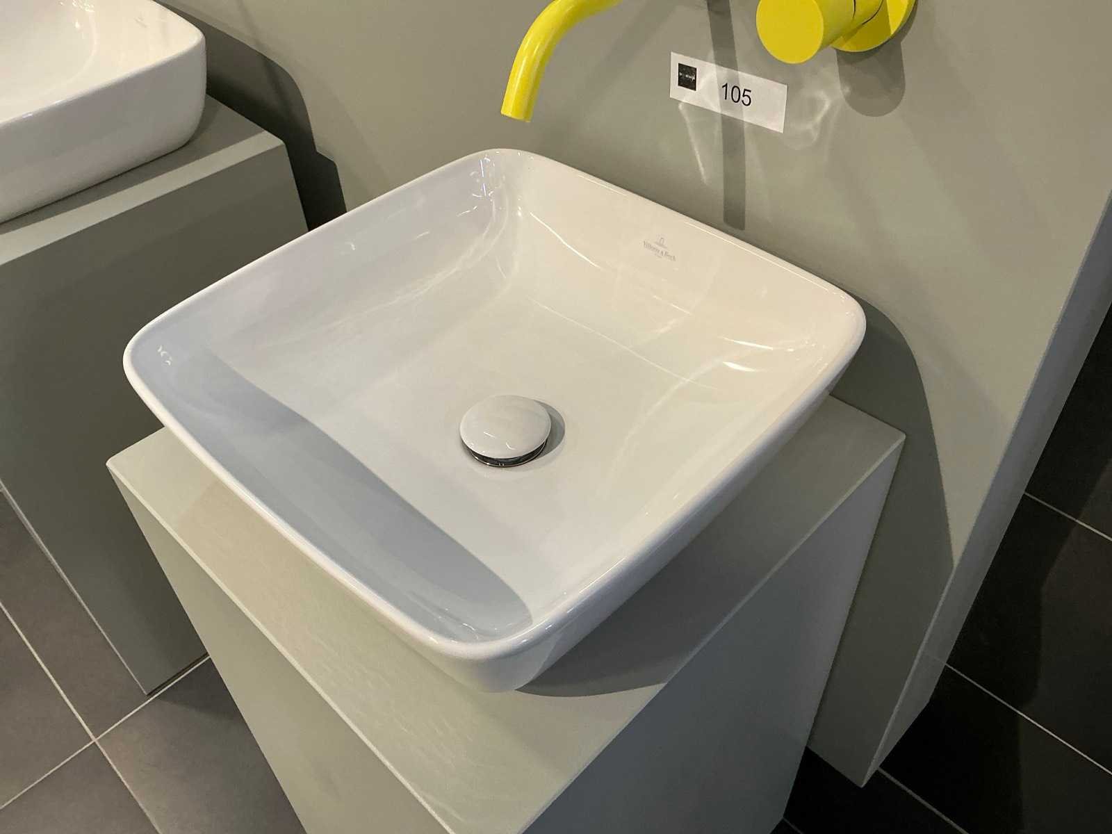 Bestaande uit More to See spiegel met verlichting 45x75cm, 41cm opzetwastafel op losstaande pilaar, afbouwdeel Dornbracht eengreepsinbouwkraan en wandmengkraan zonder inbouwgedeelte Merk: Villeroy&Boch Model: Artis