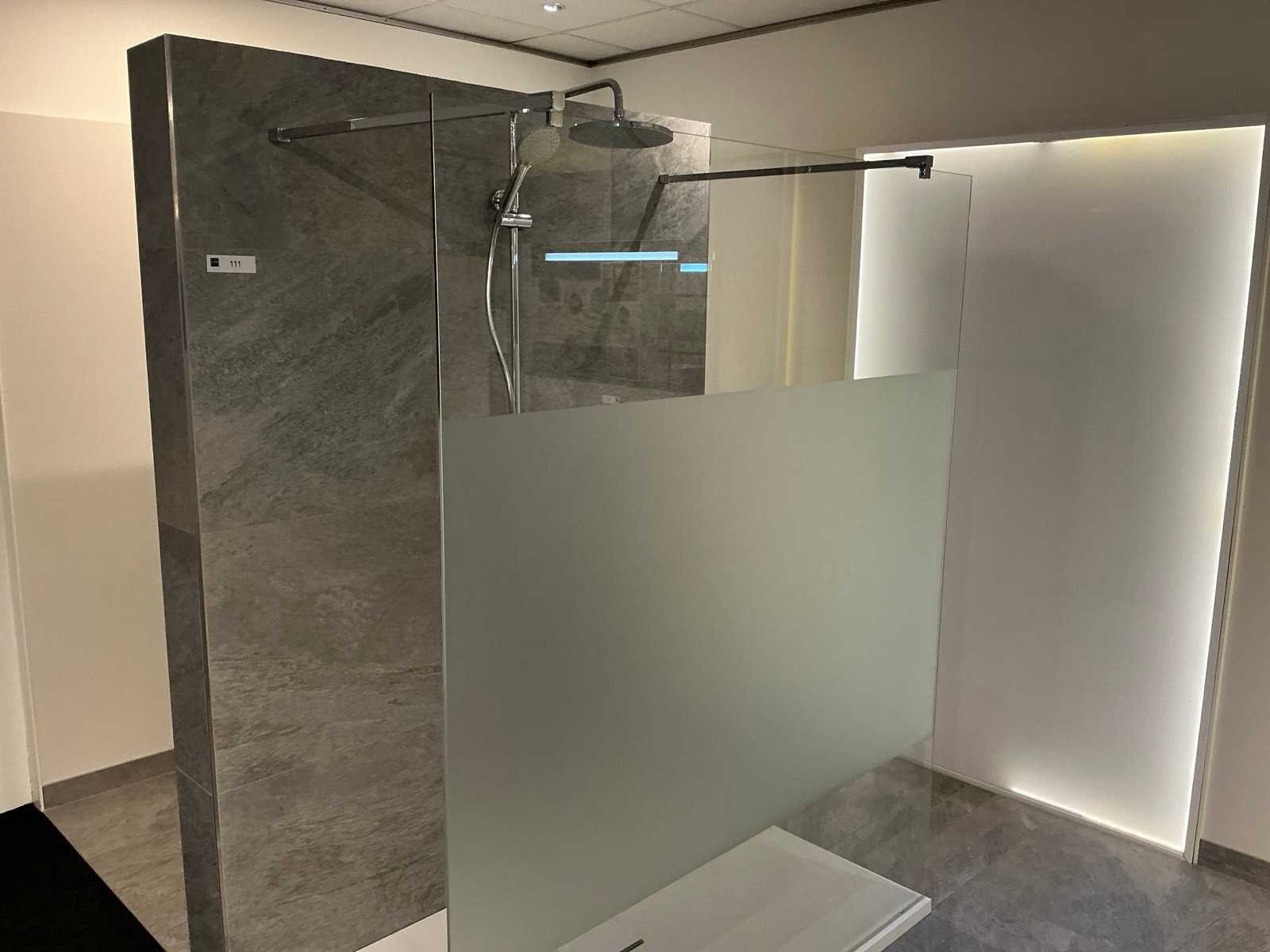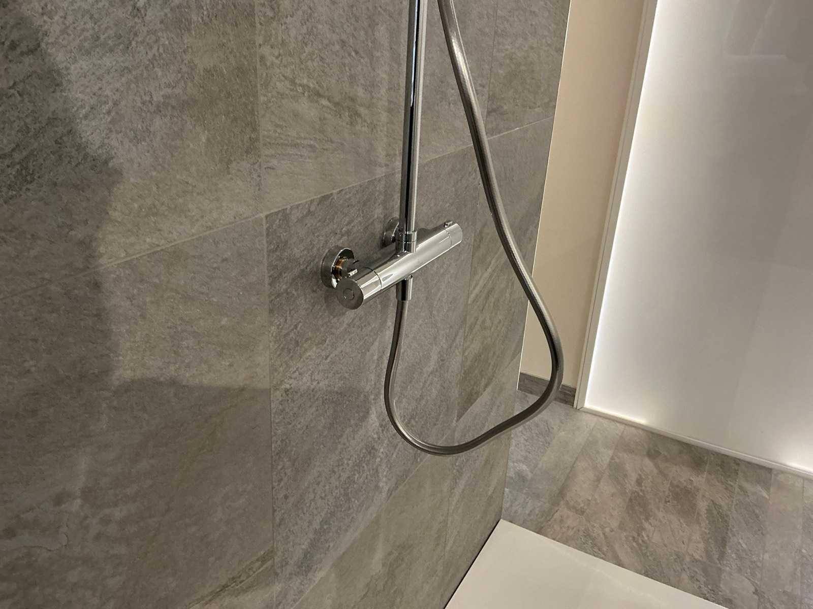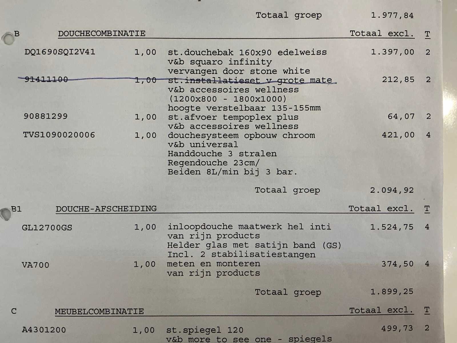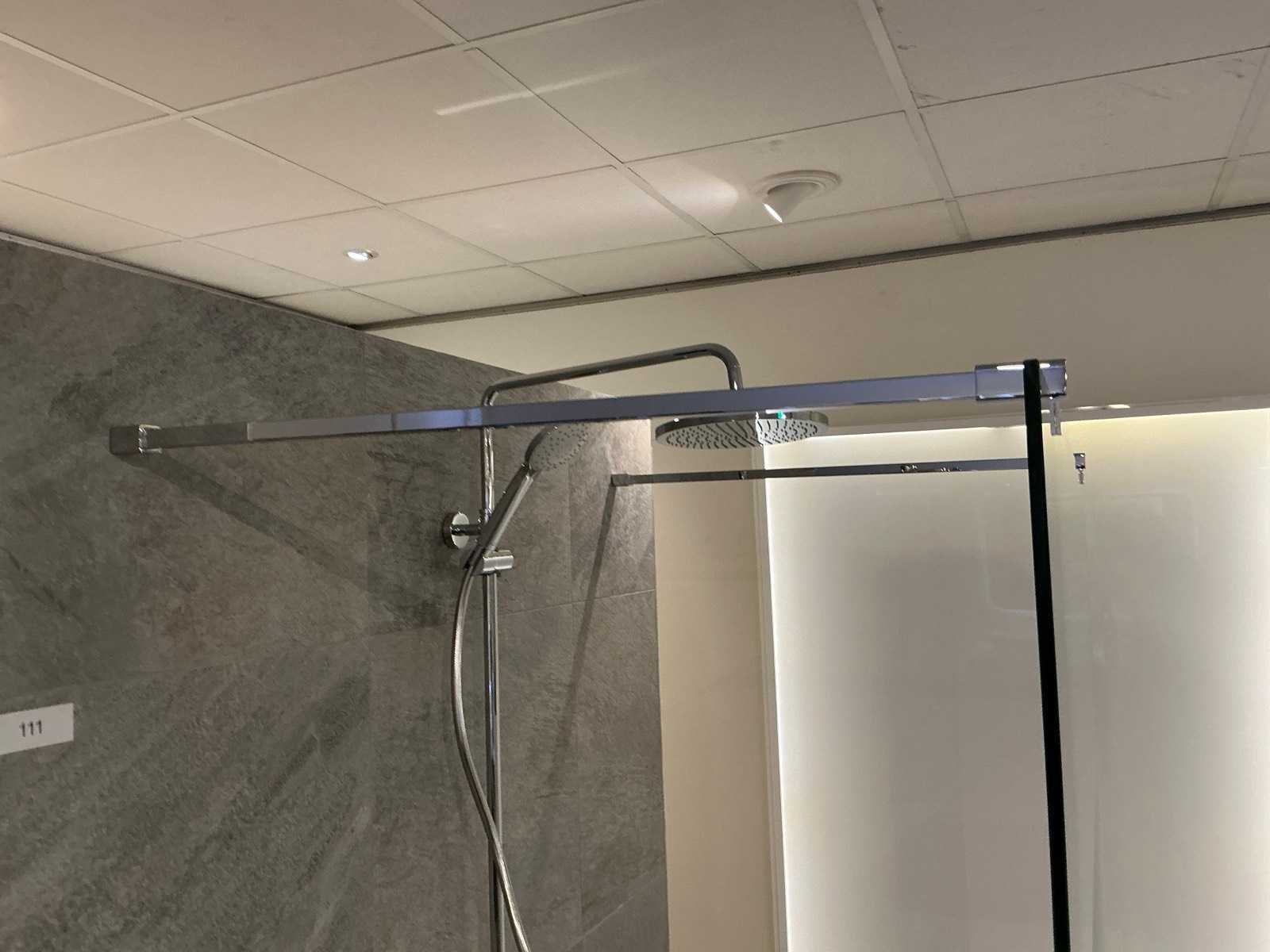 Bestaande uit een Van Rijn maatwerk inloopdouche met helder glas met Satijn band voorzien van 2 stabilisatie stangen, Villeroy&Boch Squaro douchebak (160x90cm), opbouwgedeelte Villeroy&Boch douchesysteem met handdouche, regendouche en thermostaat zonder inbouwgedeeltes. Merk: Van Rijn / Villeroy&Boch