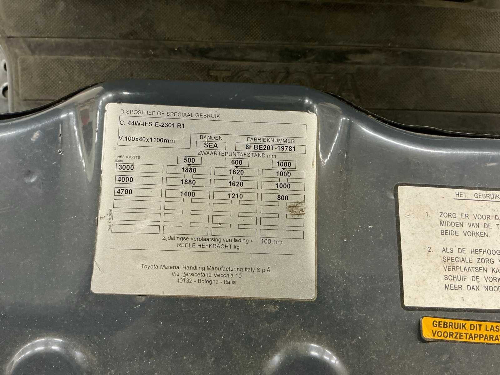 Merk: Toyota Type: 8FBE20T Bouwjaar: 2023 Serienummer: 19781 Side-shift: true Triple mast: true Eigen gewicht: 2592kg Hefvermogen: 2000kg Hefhoogte: 4700mm Vol rubber banden: true