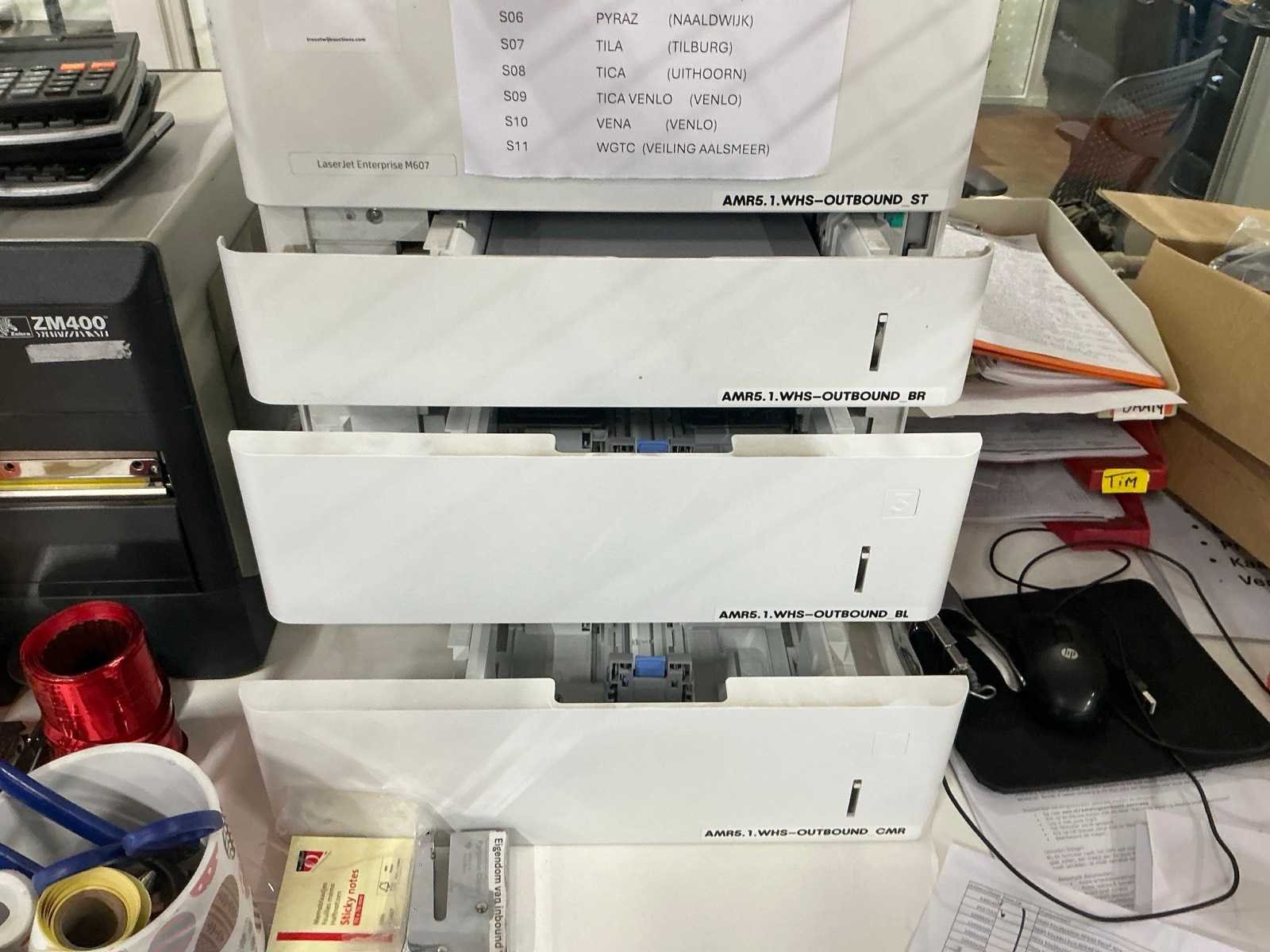 Met 3 papierlades. S/N: CNBVMDL149 Merk: HP Type: LaserJet Enterprise M607
