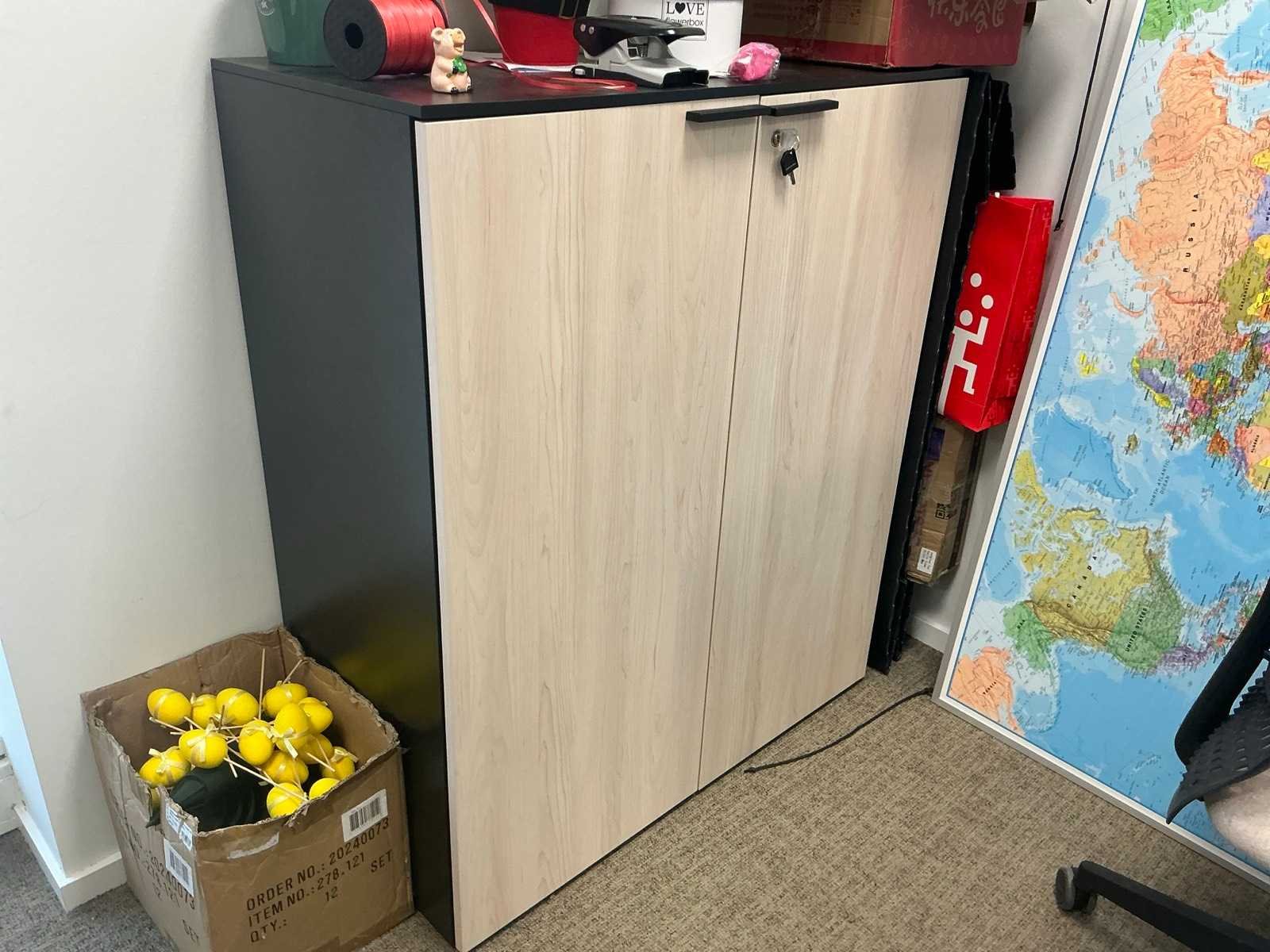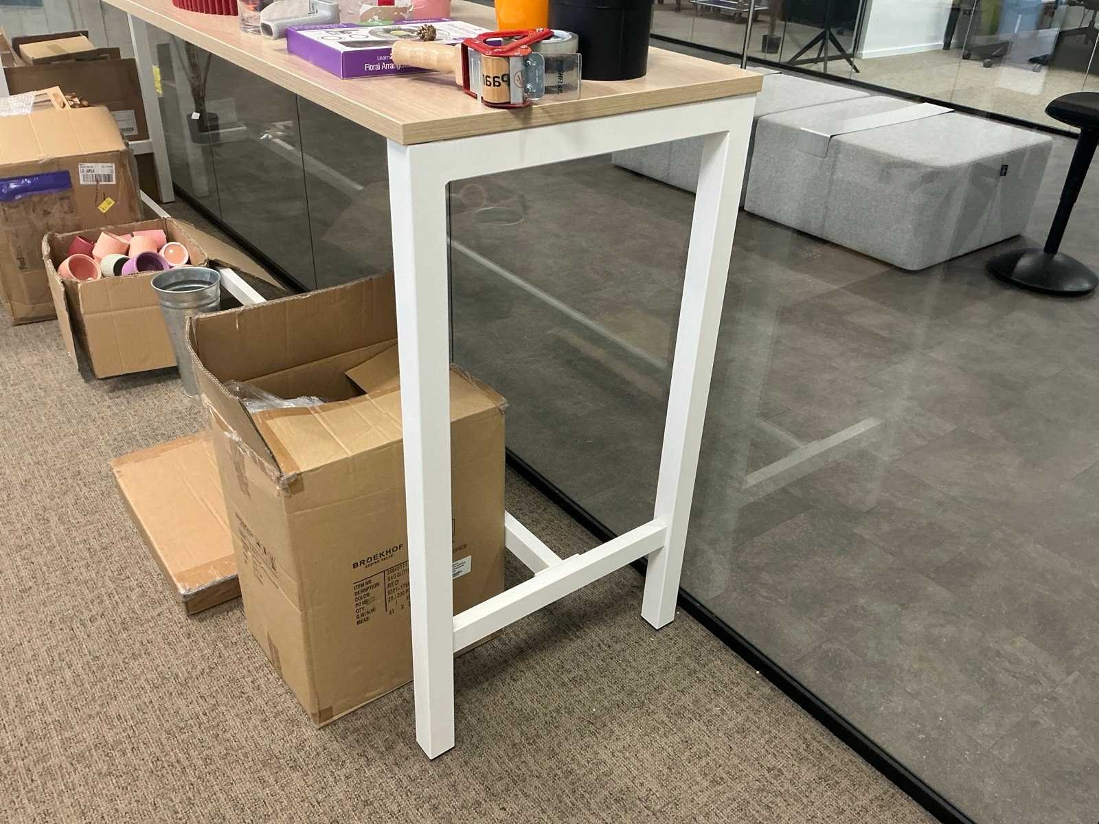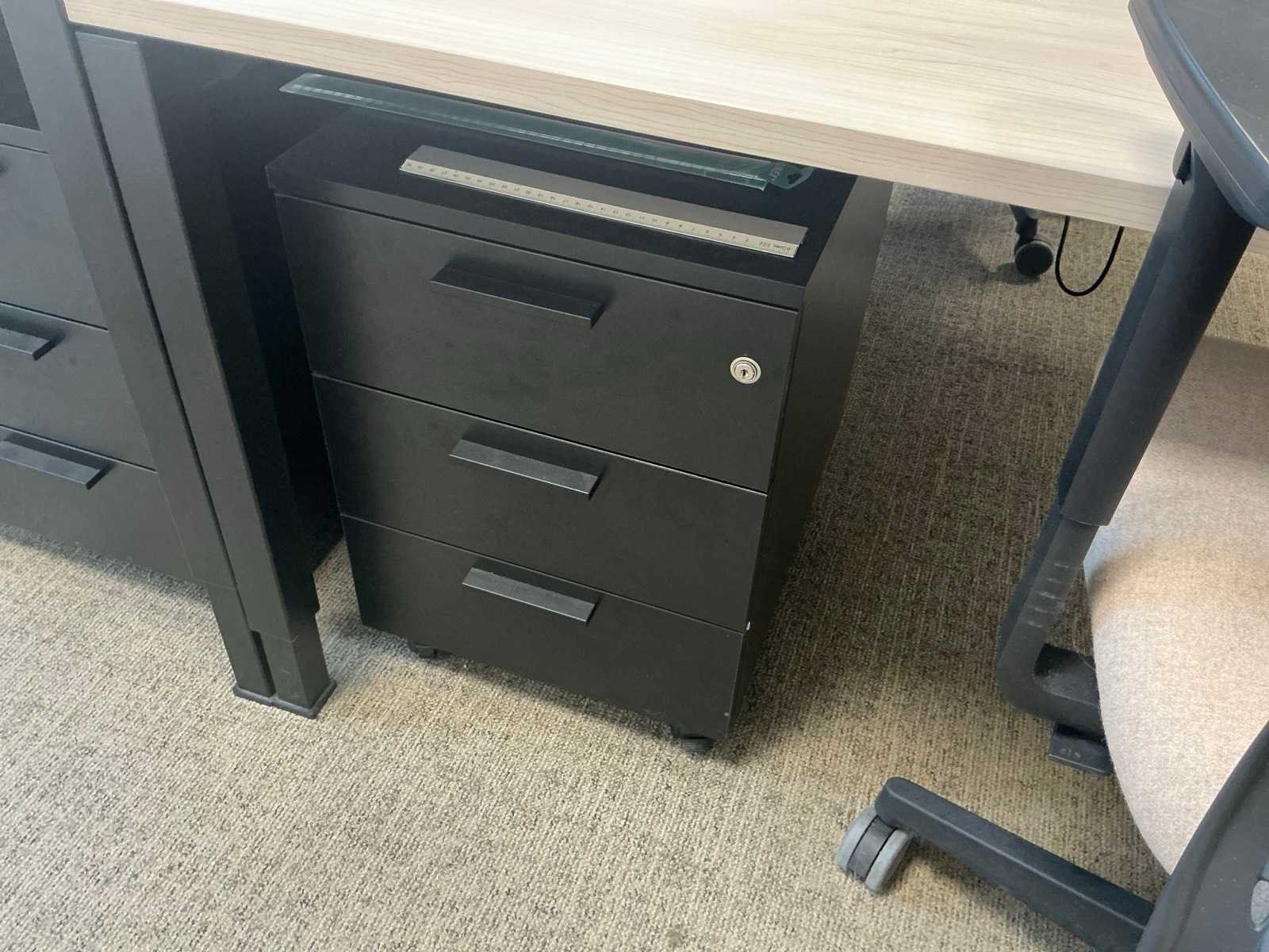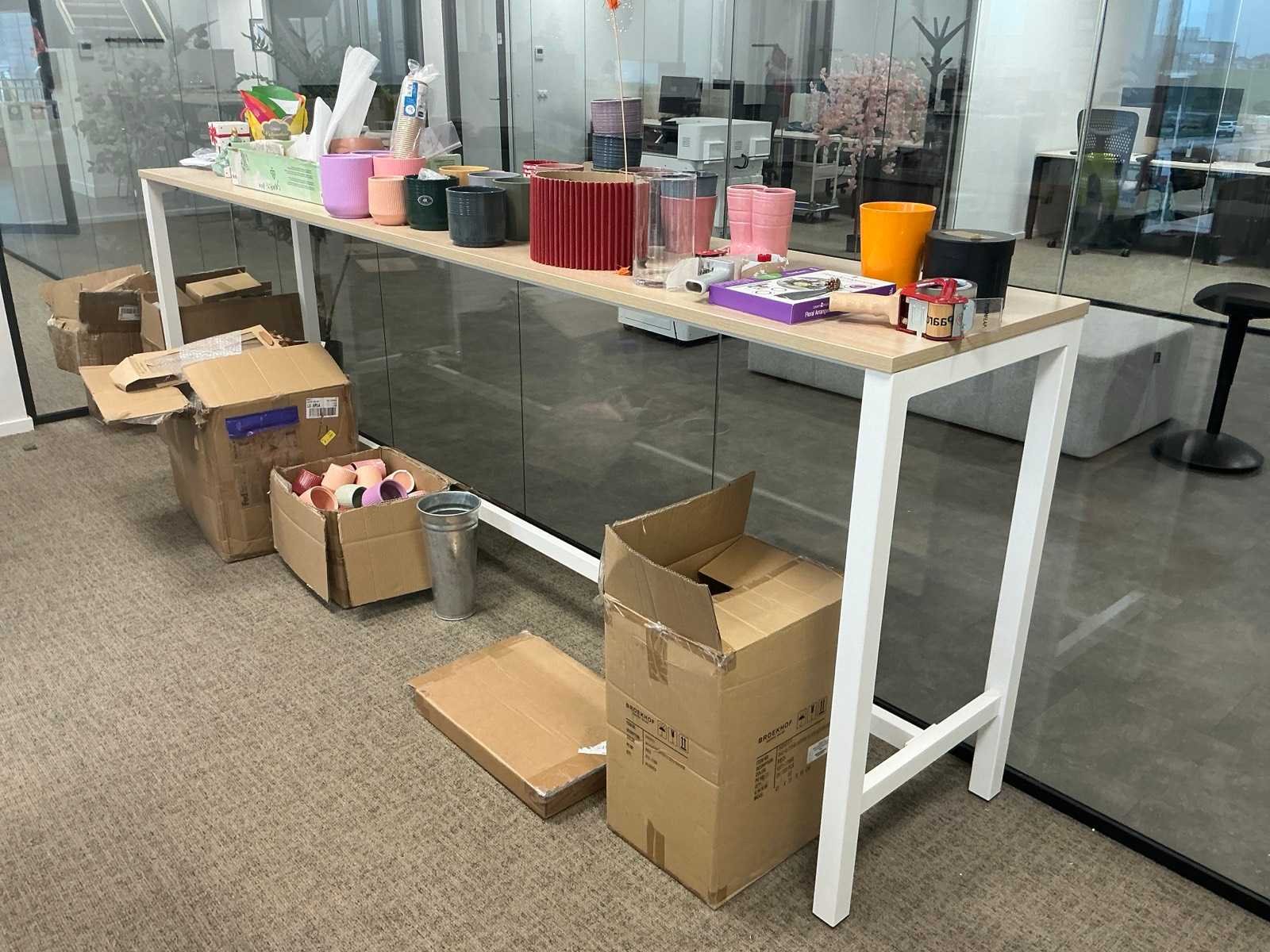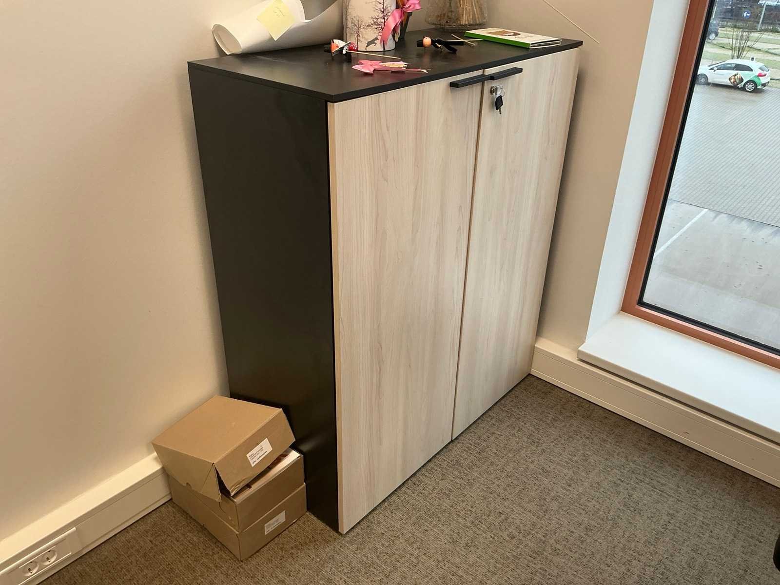 Bestaande uit: Bralco 6x bureau (160x80x75 cm), 2x opbergkast (100x46x118 cm), bartafel (320x60x110 cm), 6x bureaustoel en 6x ladekast. Monitoren, dockingstations en overige goederen zijn niet inbegrepen.