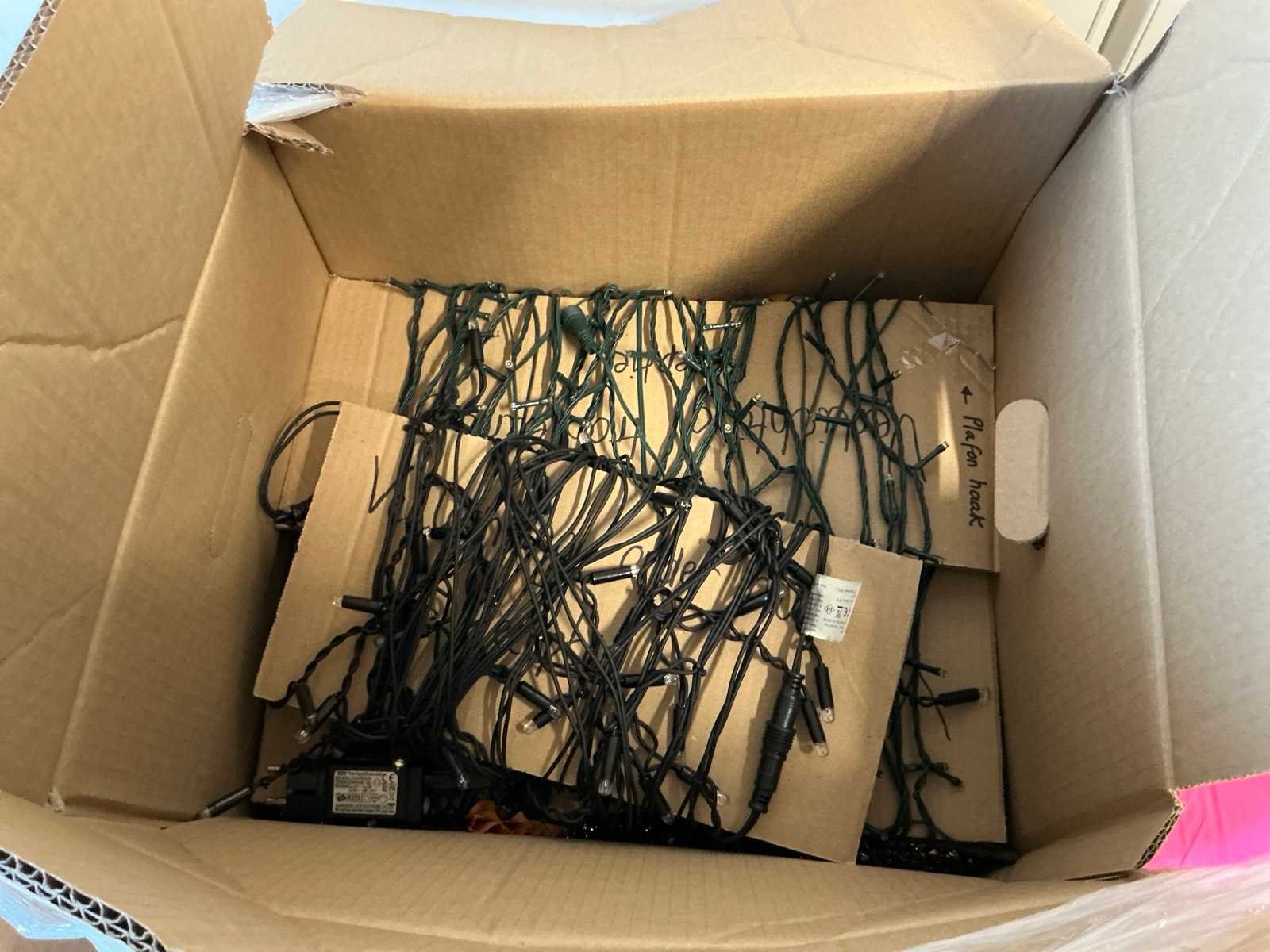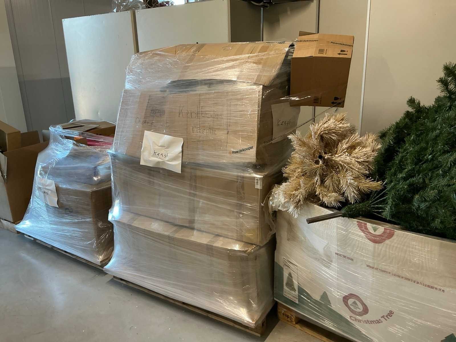 Waaronder: Kunst kerstbomen, kerstverlichting, decoratiematerialen. Op 2 pallets.