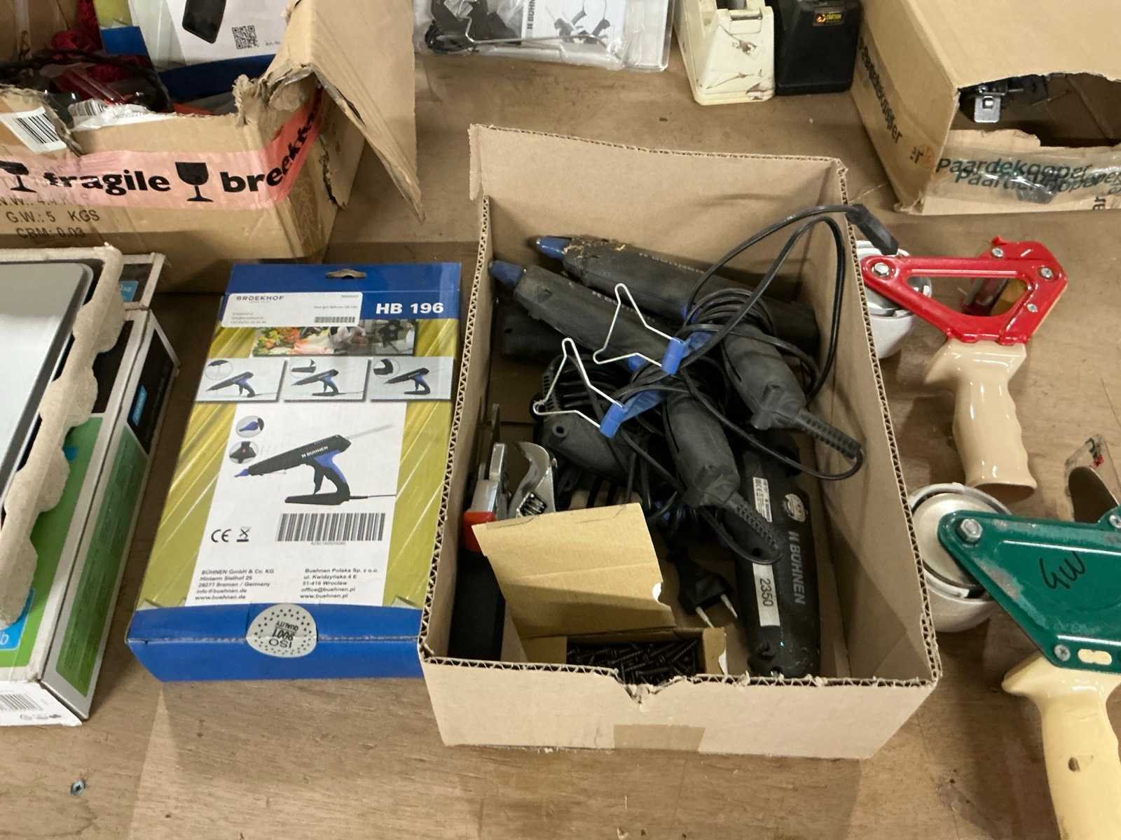 Bestaande uit: Lijmpistolen, 2x verlenghaspel, post weegschaal, tape dispensers.