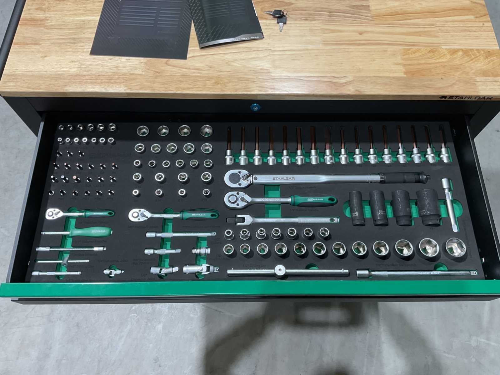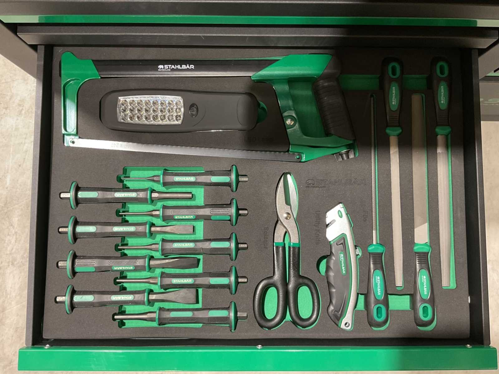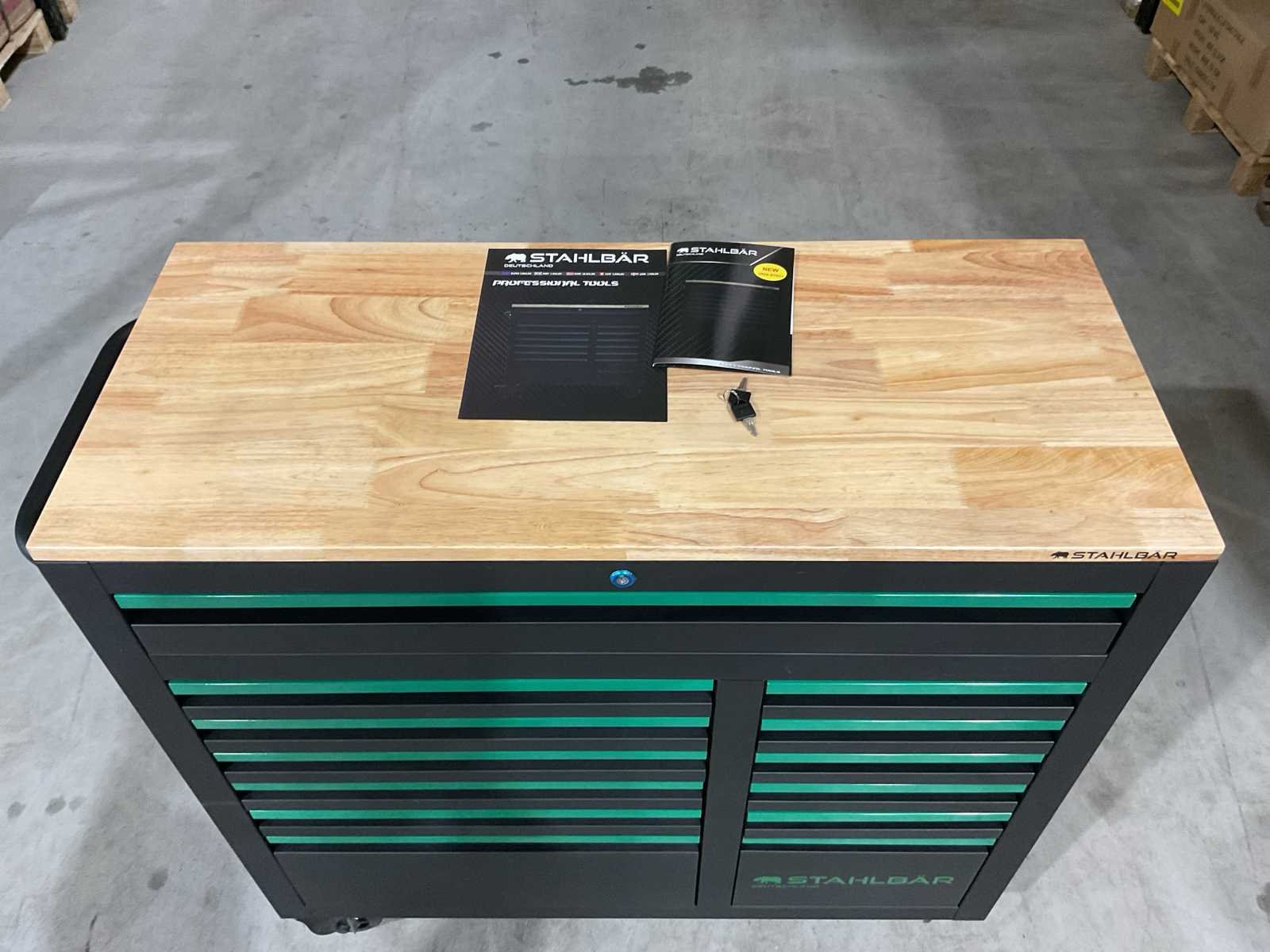 Voorzien van 13 lades waarvan 10 gevuld met gereedschap; professioneel chroom-vanadium gereedschap; heavy duty gereedschapswagen; houten werkblad; 4 wielen; stevig handvat; ongebruikt in doos (transport afmetingen 115x50x100 cm) Merk: Stahlbär Type: Deutschland Bouwjaar: 2025 Aantal laden: 13 Met inhoud: true Eigen gewicht: 134kg Totale afmeting L: 1150mm Totale afmeting Breedte: 500mm Totale afmeting Hoogte: 1000mm