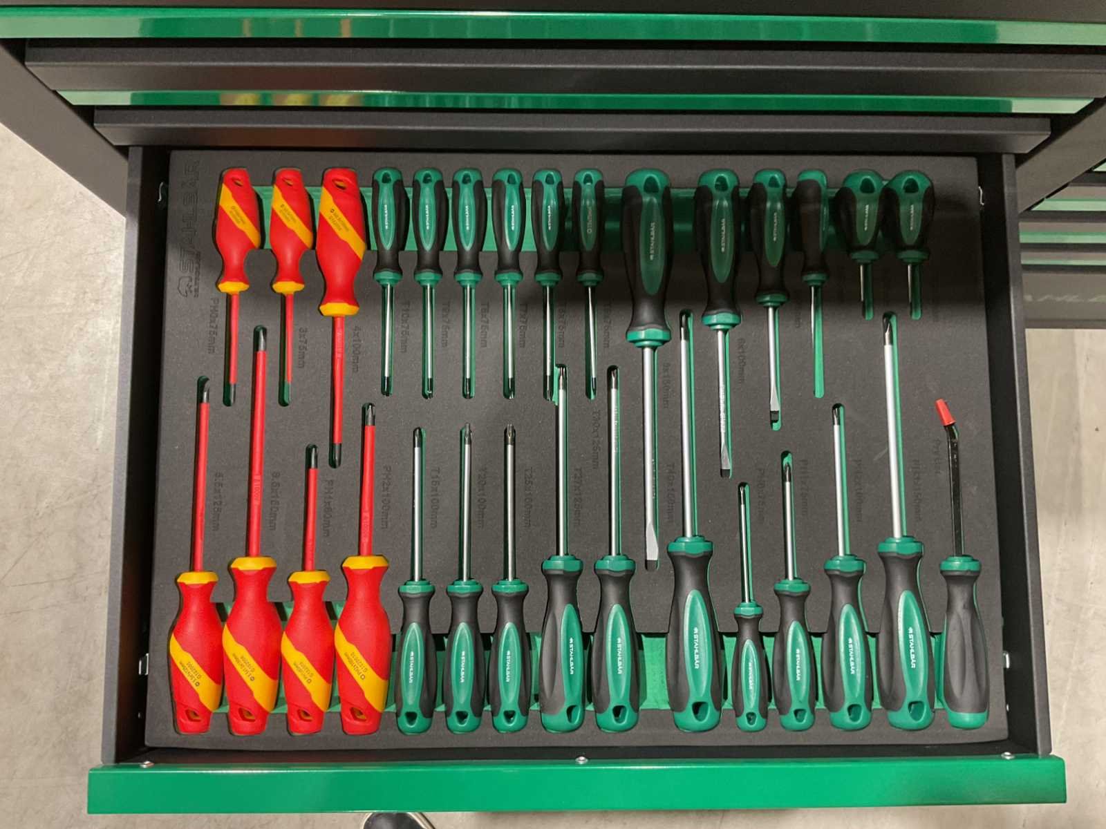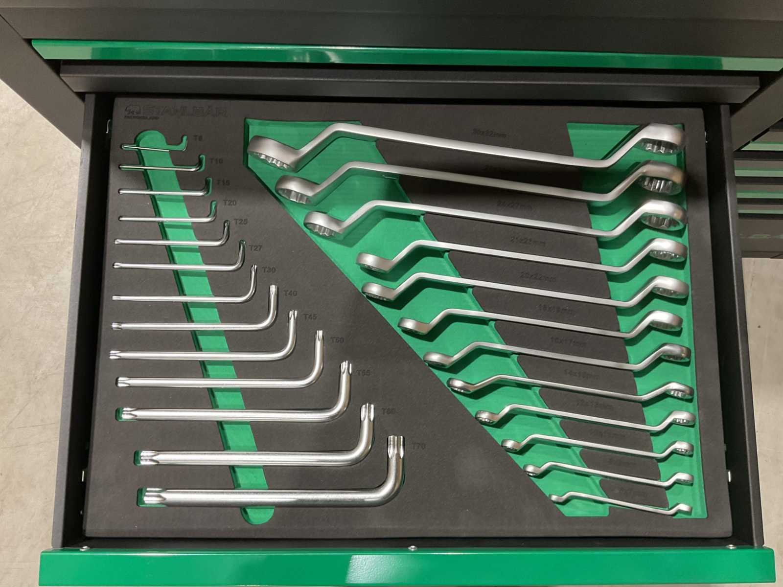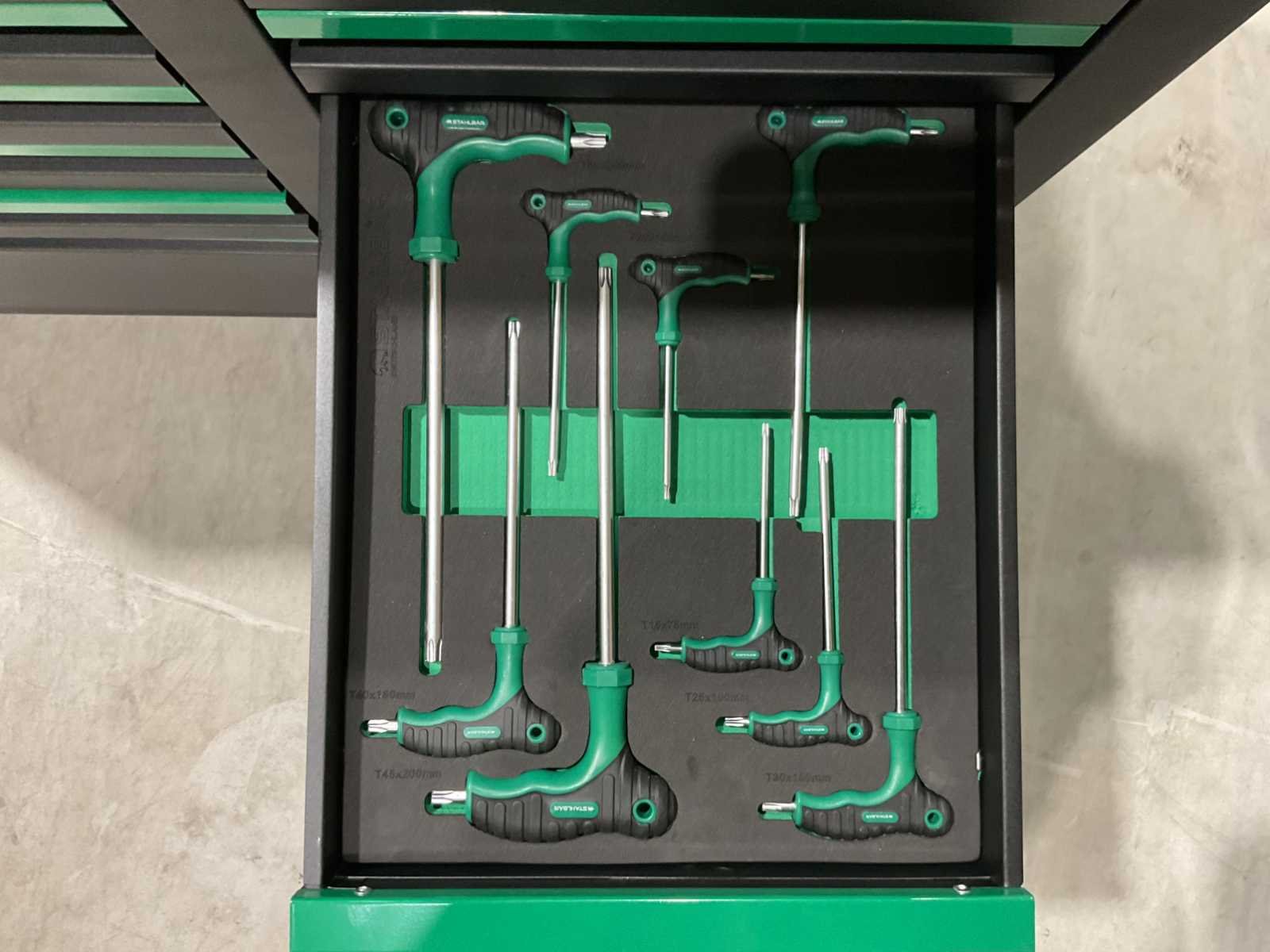 Voorzien van 13 lades waarvan 10 gevuld met gereedschap; professioneel chroom-vanadium gereedschap; heavy duty gereedschapswagen; houten werkblad; 4 wielen; stevig handvat; ongebruikt in doos (transport afmetingen 115x50x100 cm) Merk: Stahlbär Type: Deutschland Bouwjaar: 2025 Aantal laden: 13 Met inhoud: true Eigen gewicht: 134kg Totale afmeting L: 1150mm Totale afmeting Breedte: 500mm Totale afmeting Hoogte: 1000mm