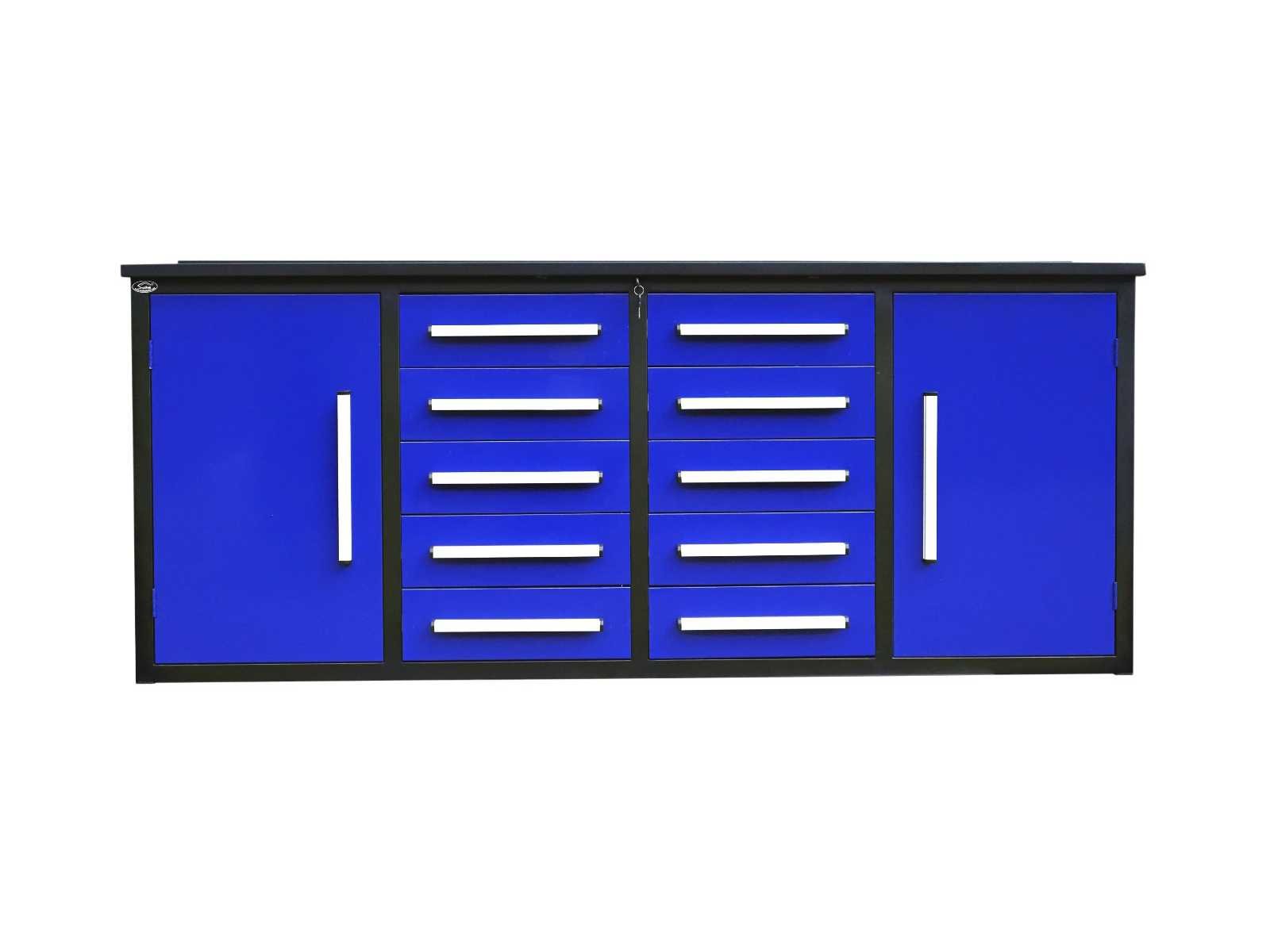 Voorzien van Werkblad; 10 lades; 2 deuren; afsluitbaar met sleutels; ongebruikt Merk: Stahlworks Product type: SW-12 Industrial Blue Breedte: 2230mm Lengte: 650mm Hoogte: 980mm