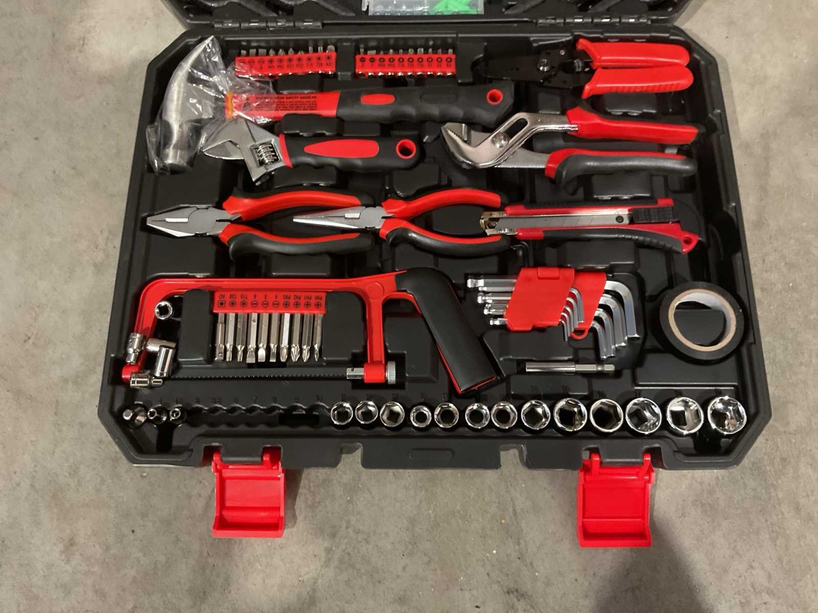 Voorzien van 4 stuks schroevendraaiers SL6*38, SL6*100; PH2*38, PH2*100; 1 stuk bit driver handvat; 1 stuk meetlint 3m; 5 stuks precisieschroevendraaiers; 4 stuks plastic dips; 60 stuks assortiment bevestigingsmiddelen in een doos; 1 stuk Niveau; 1 stuk 3/8dr ratelhandvat; 1 stuk 3/8dr verlengstuk; 1 stuk 3/8dr bougiedop; 6 ringsteeksleutels 8-10-12-13-14-15 cm; 1 stuk 3/8&1/4 adapter; 12 stuks 1/4dr doppen 4-4.5-5-5.5-6-7-8-9-10-11-12-13MM; 10 stuks 3/8dr doppen 10-11-12-13-14-15-16-17-18-19MM; 1 stuk bitverlengstuk; 1 stuk isolatietape; 1 stuk ijzerzaag; 9 stuks inbussleutels 1.5-2-2.5-3-4-5-6-8-10mm; 10 stuks bits 50 mm; 20 stuks bits 25mm; 1 stuk mes; 1 stuk 6'lnesnun tang; 1 stuk 6' langbektang; 1 stuks 6' verstelbare sleutel;1 stuk 8''waterpomptang; 1 stuk 6'' krimptang; 1 stuks klauwhamer; Ongebruikt in doos (Transport afmeting 450 x 90 x 360, Gewicht 5.58 KG) Merk: Metallo Met koffer: true Delig: 156 Type: META-156W Bouwjaar: 2025