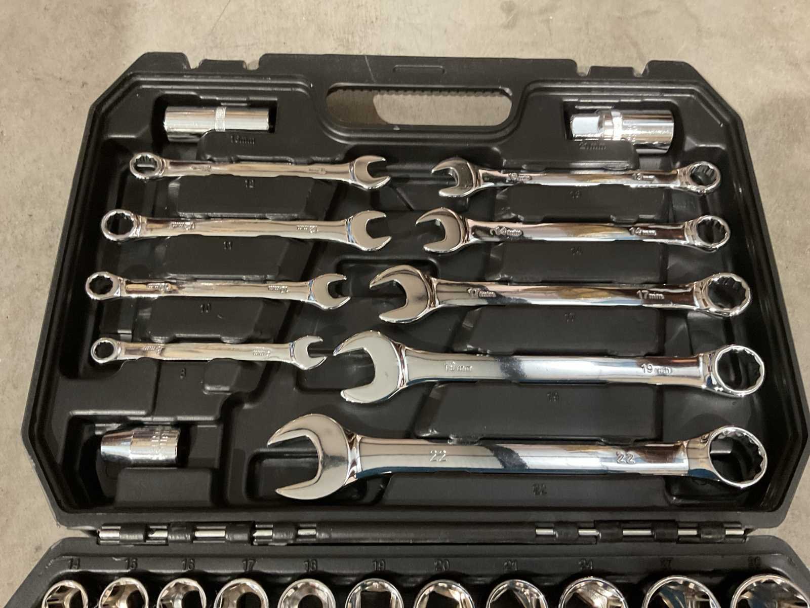 Voorzien van 9 x Ring/steeksleutel; 2 x Bougiesleutel; 2 x adapters; 12 x 1/2"Doppenset; 13 x 1/4" Doppenset; 15 x bitset; 2 x Ratelsleutel; 3 x verlengstukken; 1 x Spinner; 1 x Flexibele verlengstuk; 2 x Sliding T-Bar; 2 x Universele aansluiting; 17 x bitjes set; 1 x Kunststofkoffer; Ongebruikt in doos (Transport afmeting 385 x 80 x 290, Gewicht 5.75 KG Merk: Metallo Met koffer: true Delig: 82 Type: META-82W Bouwjaar: 2025